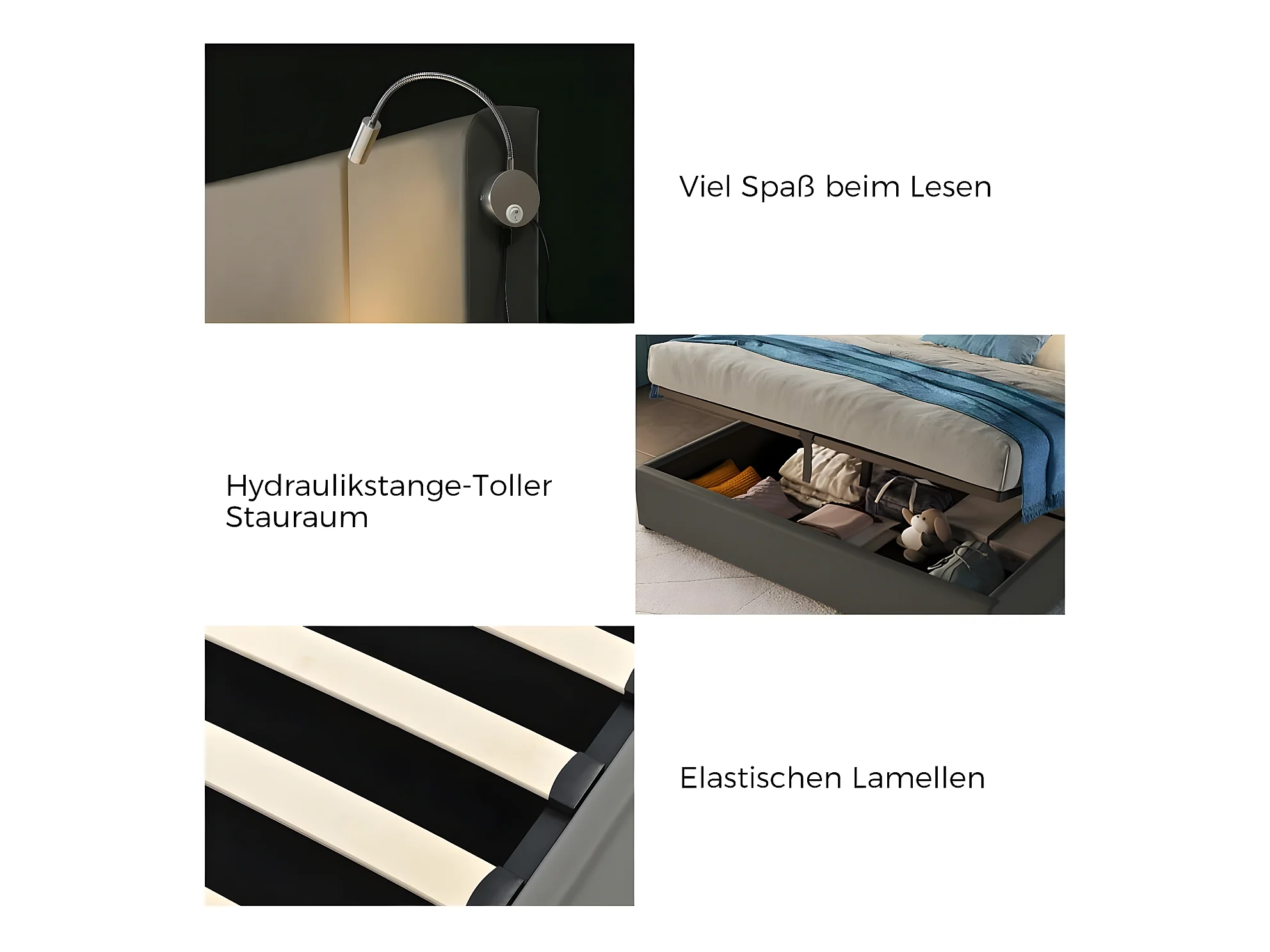 Cama de arrumação 160x200 cm em veludo cinza fosco com luz lateral na cabeceira, arrumação hidráulica, fácil de montar