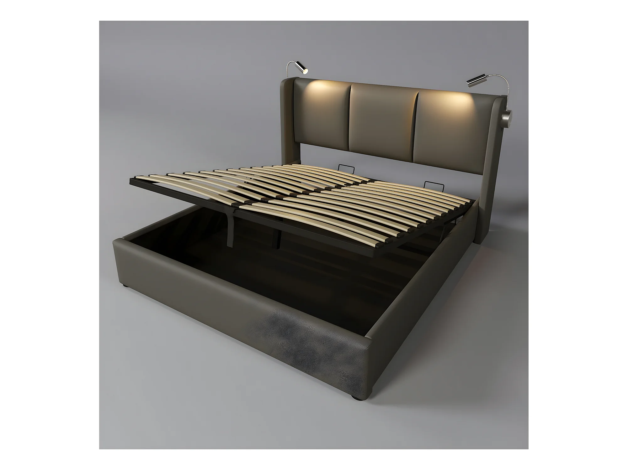 Cama de casal 160x200 veludo cinza com armazenamento hidráulico, cabeceira ampla, candeeiro e USB