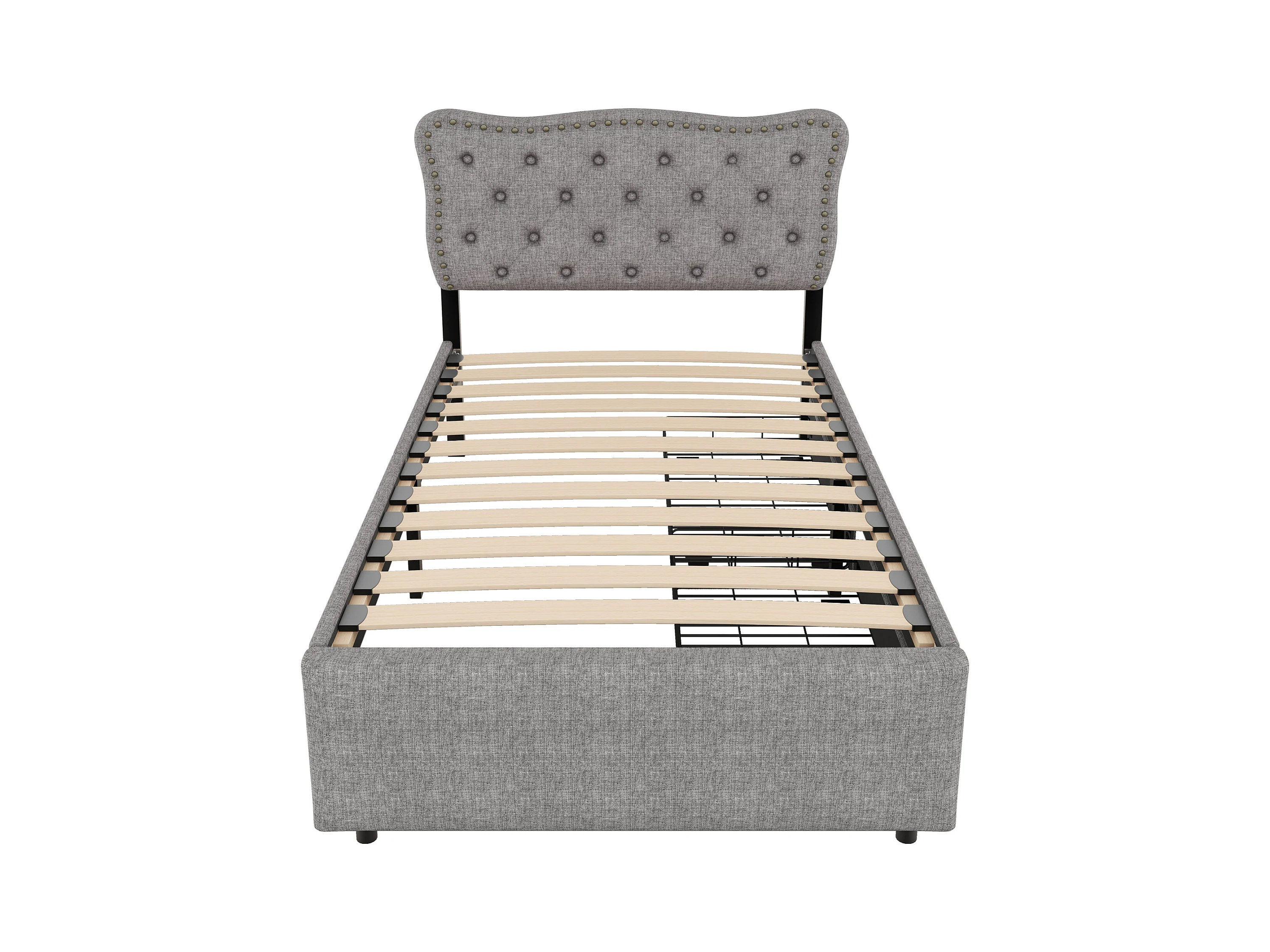 Cama de solteiro 90x200cm - Cama infantil estofada com 2 gavetas, estrado de ripas e cabeceira LED - Linho Cinza
