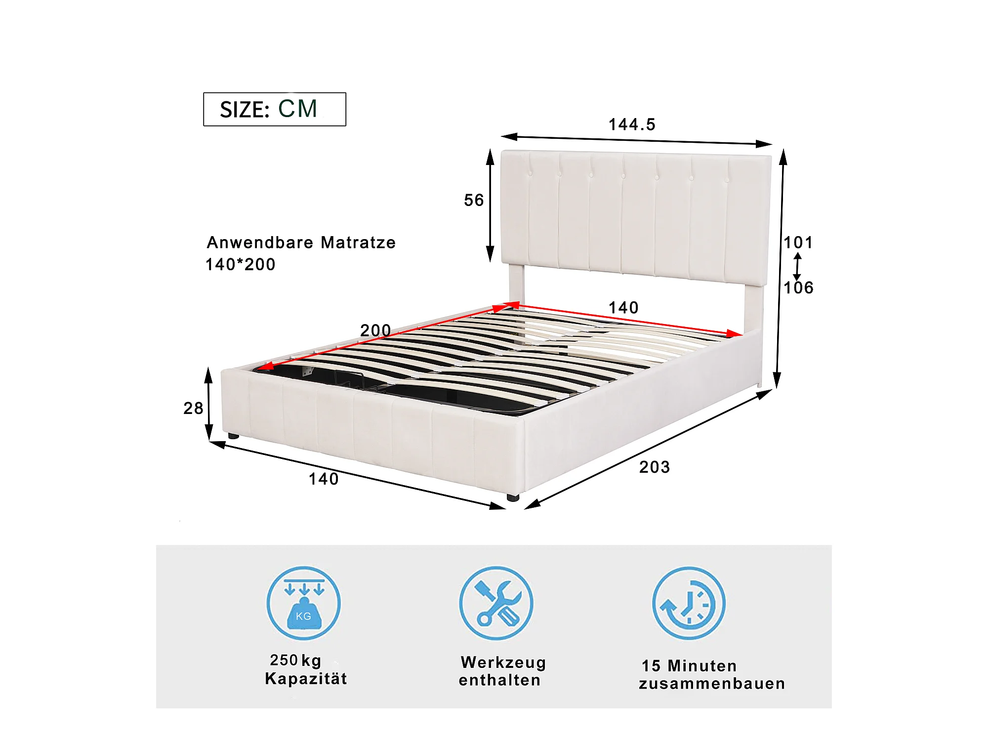 Cama acolchoada para adulto 180 x 957 cm, sem cabeceira, com faixa LED (monocromática), base com suspensão hidráulica, bege.