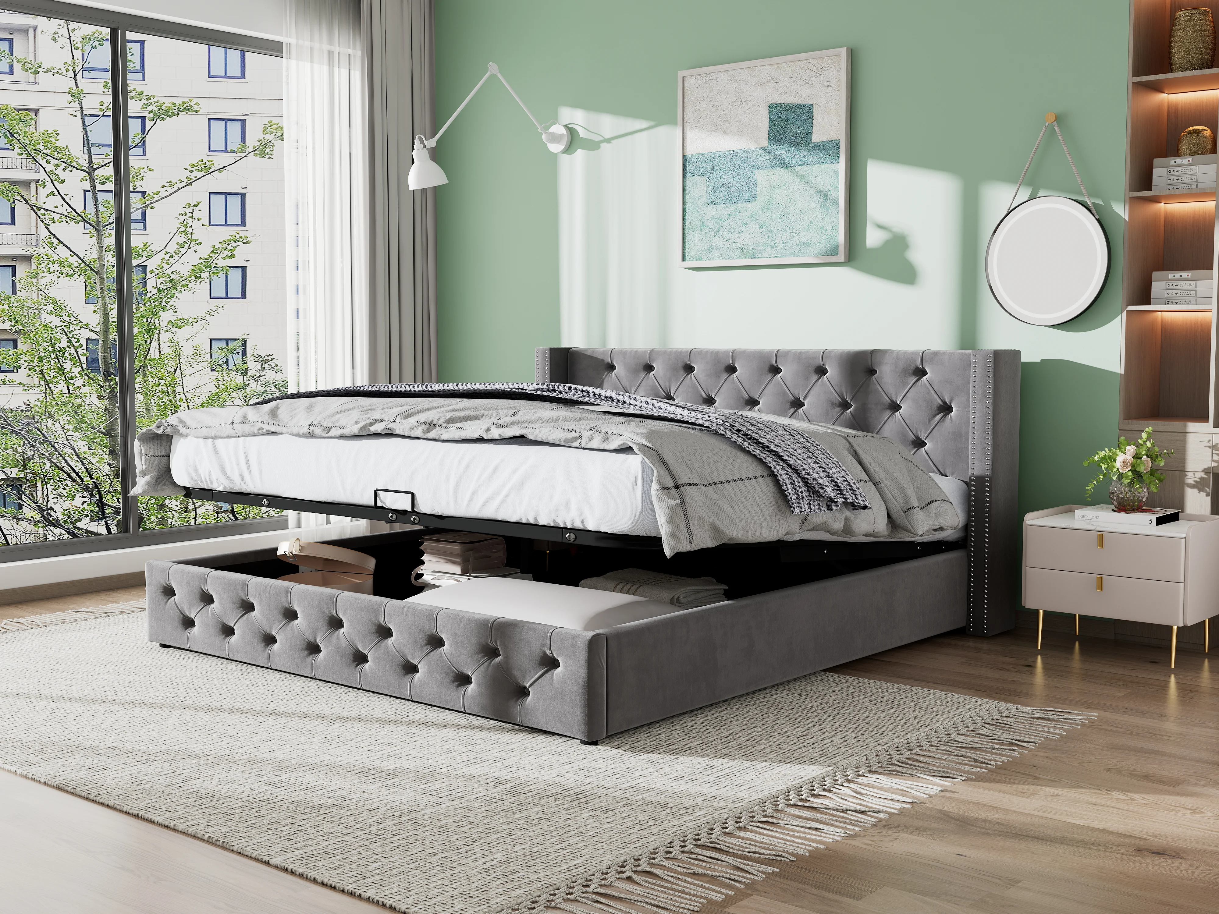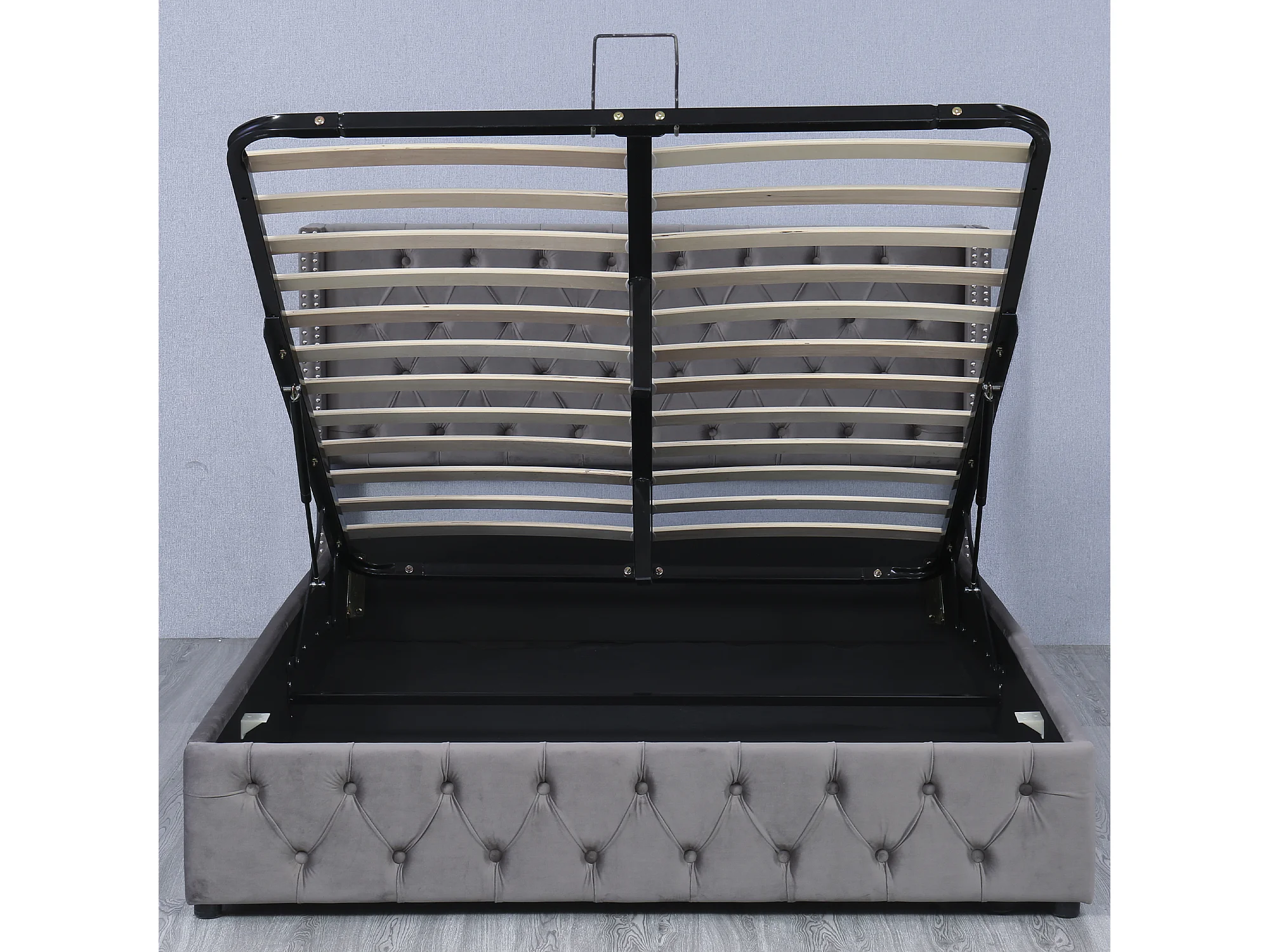 Cama de casal estofada, 140 x 200 cm, com espaço de armazenamento embaixo da cama, estrado de ripas, cinza