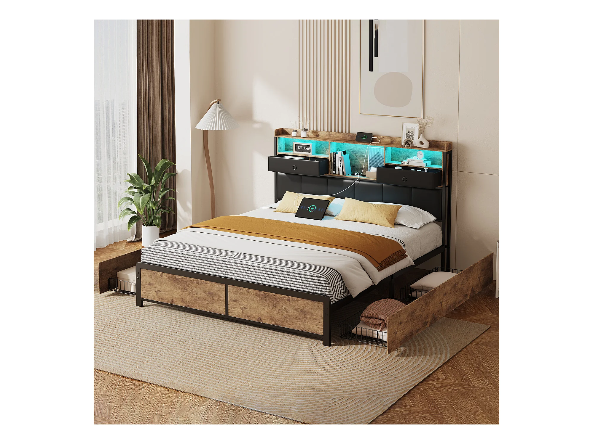 Cama de casal 140x200 cm, metal, com iluminação LED e carregamento USB, cama estofada com 2 gavetas, preta