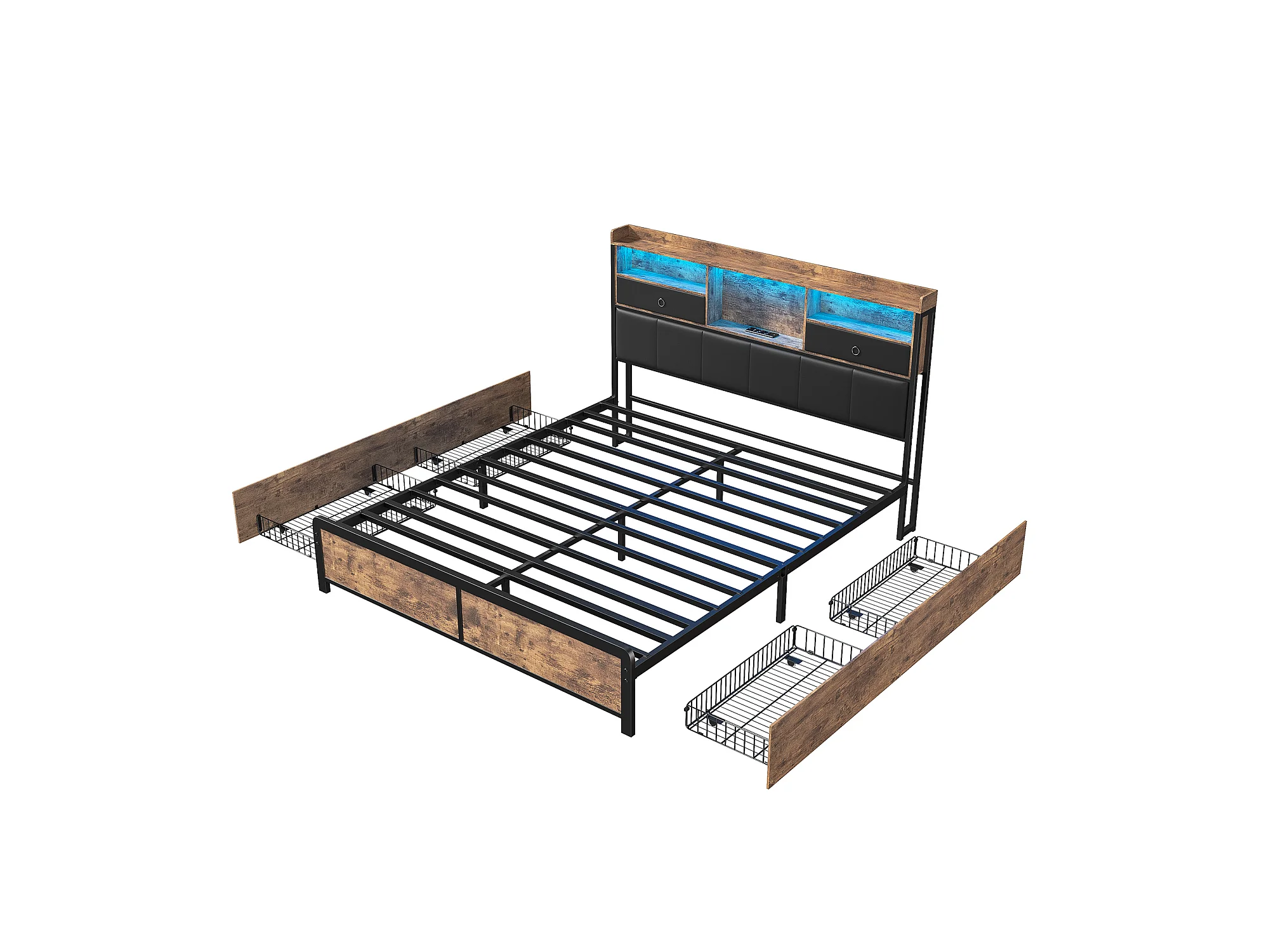 Cama adulto 140x200cm, com LED e gavetas, cama de ferro com cabeceira e estrado de ripas, preta