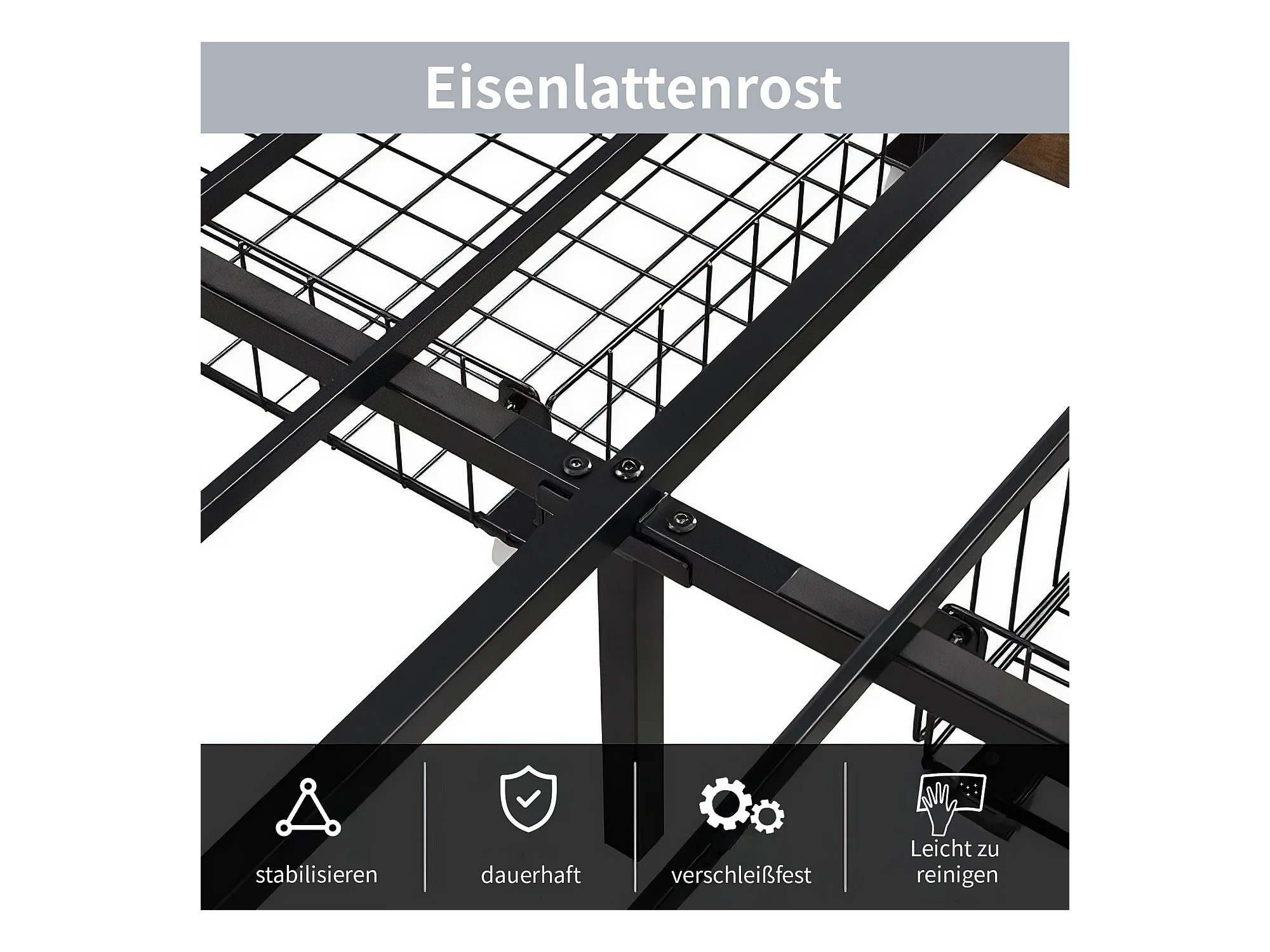 Cama de metal Cama de casal 140x200 cm, duas gavetas com rodízios, Estrutura de metal, base plana, metal + MDF, preto + nogueira