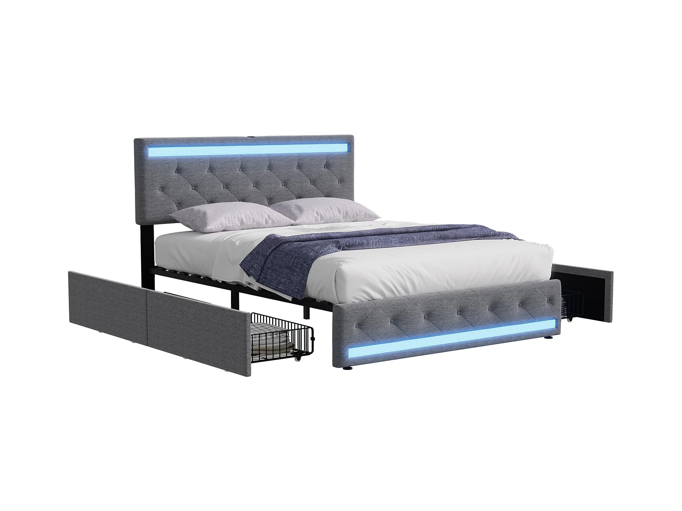 Cama Adulto 180x200 cm, LED, Portas USB e Tipo C, 4 Gavetas, Tecido Linho, Estrutura de Cama, Cinza