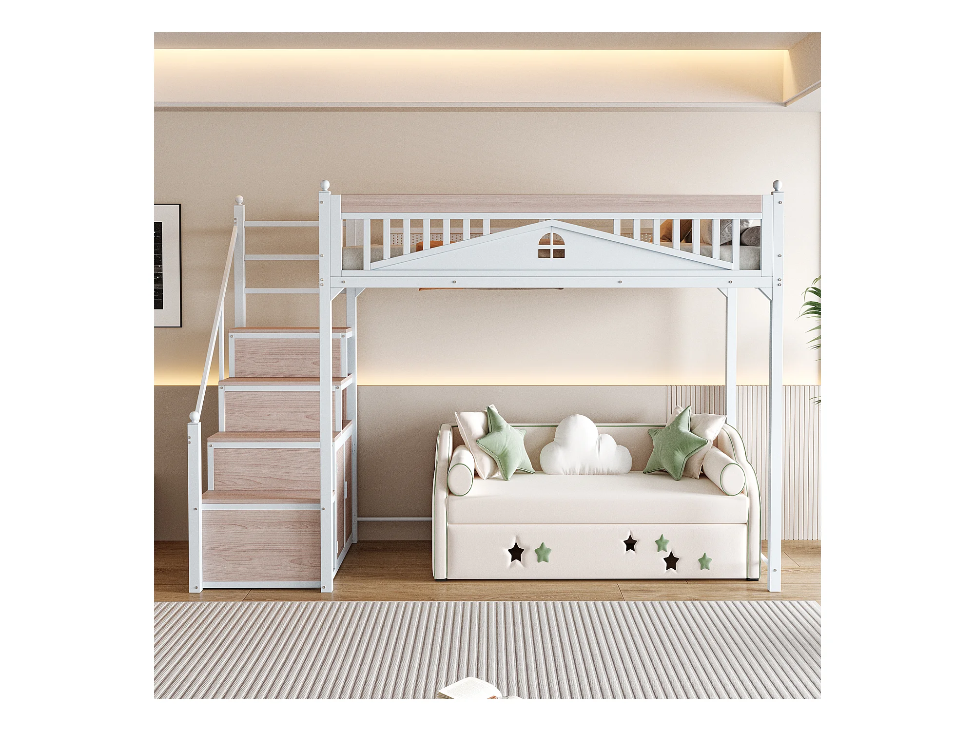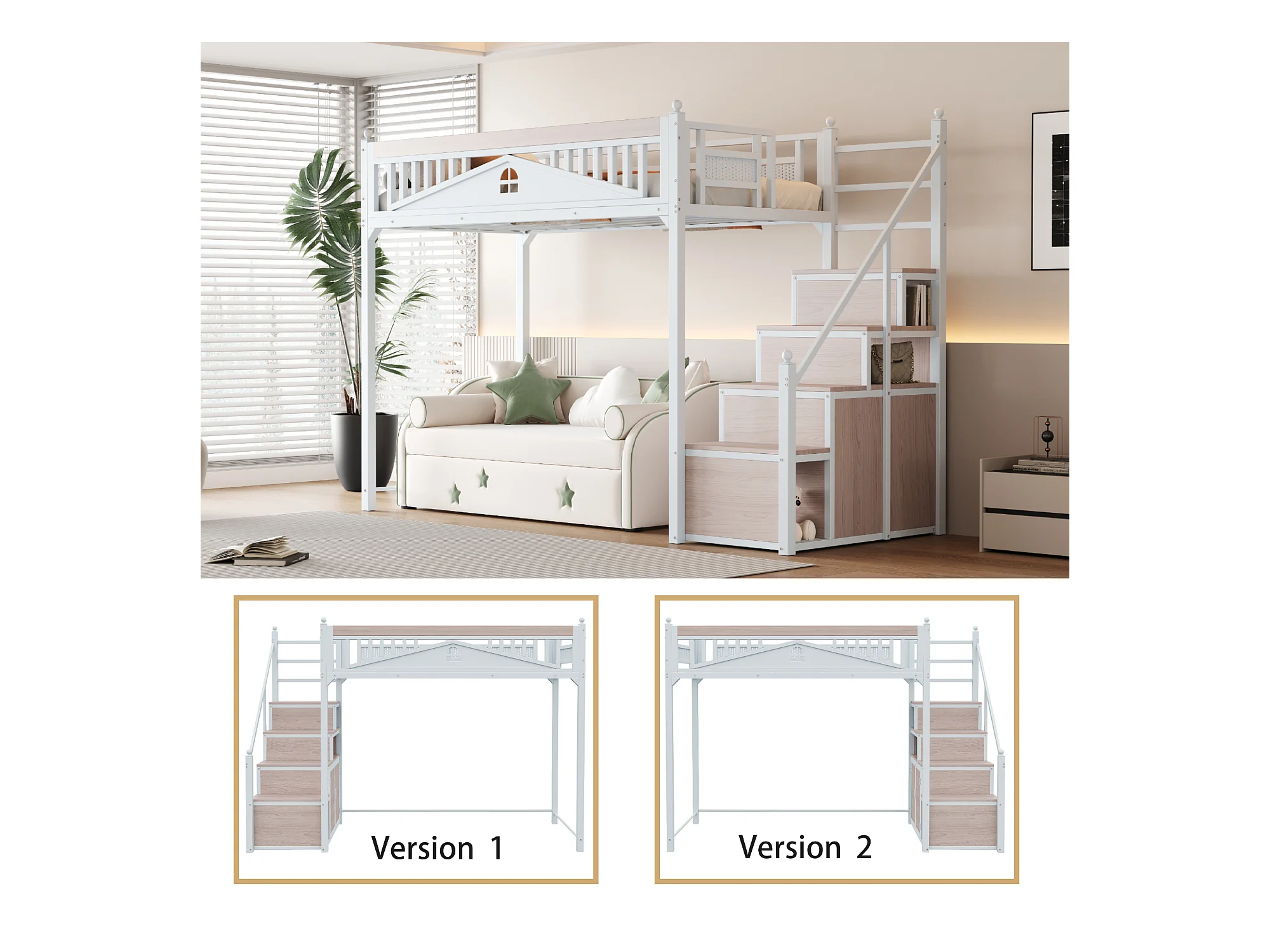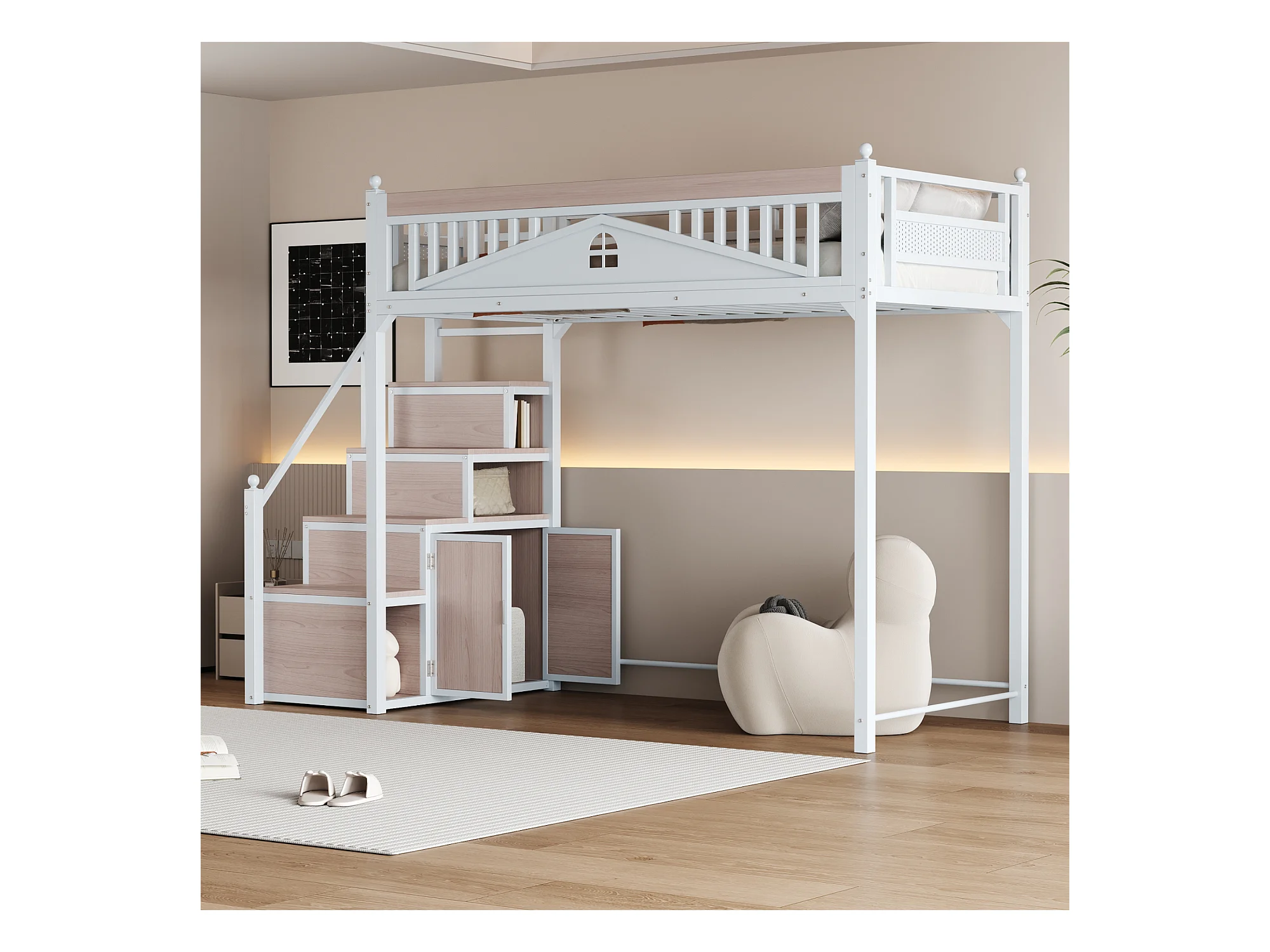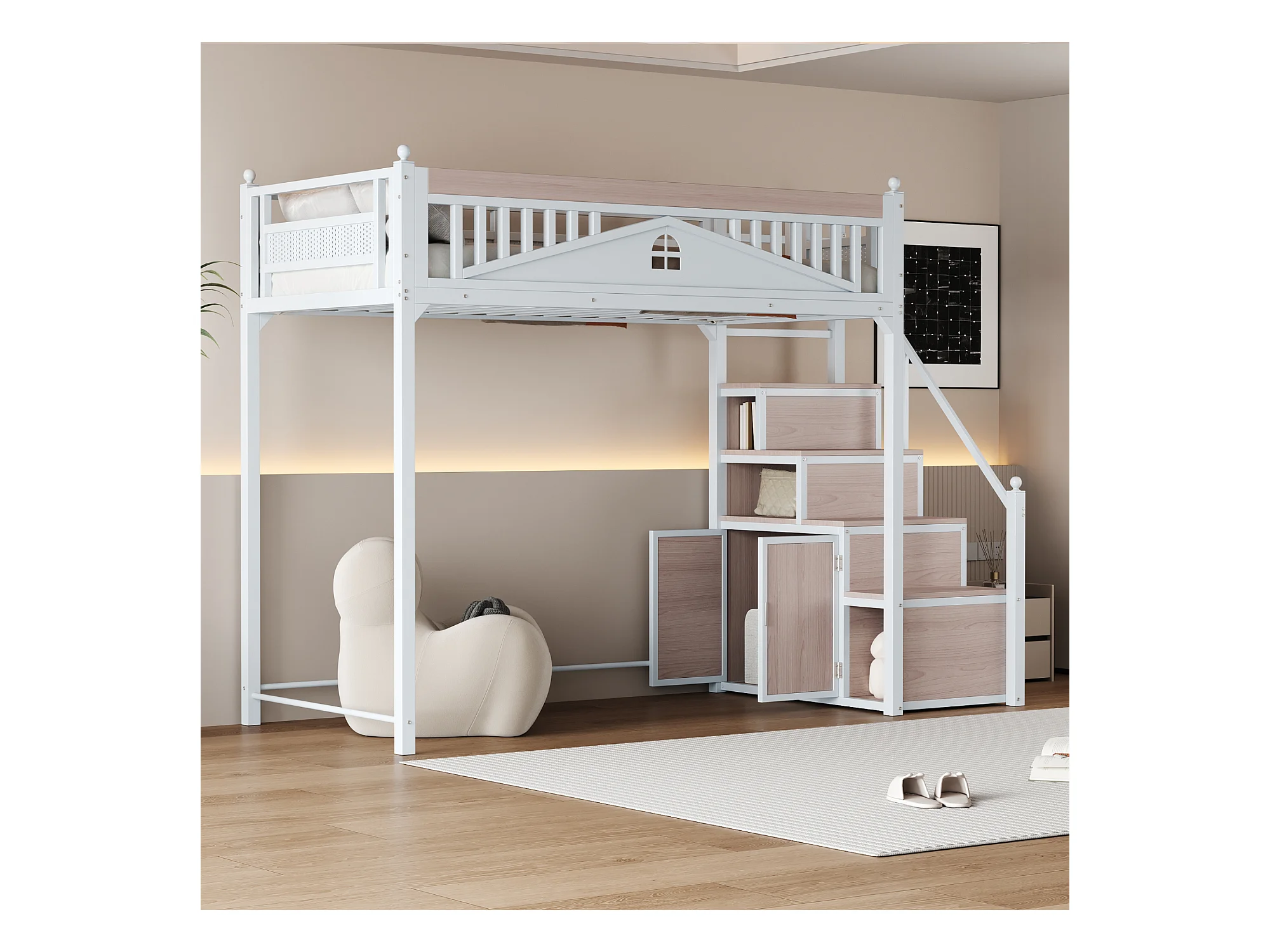 Cama alta 90 x 200 cm com espaço de arrumação - Metal + Contraplacado + MDF - Base de ripas - Branco