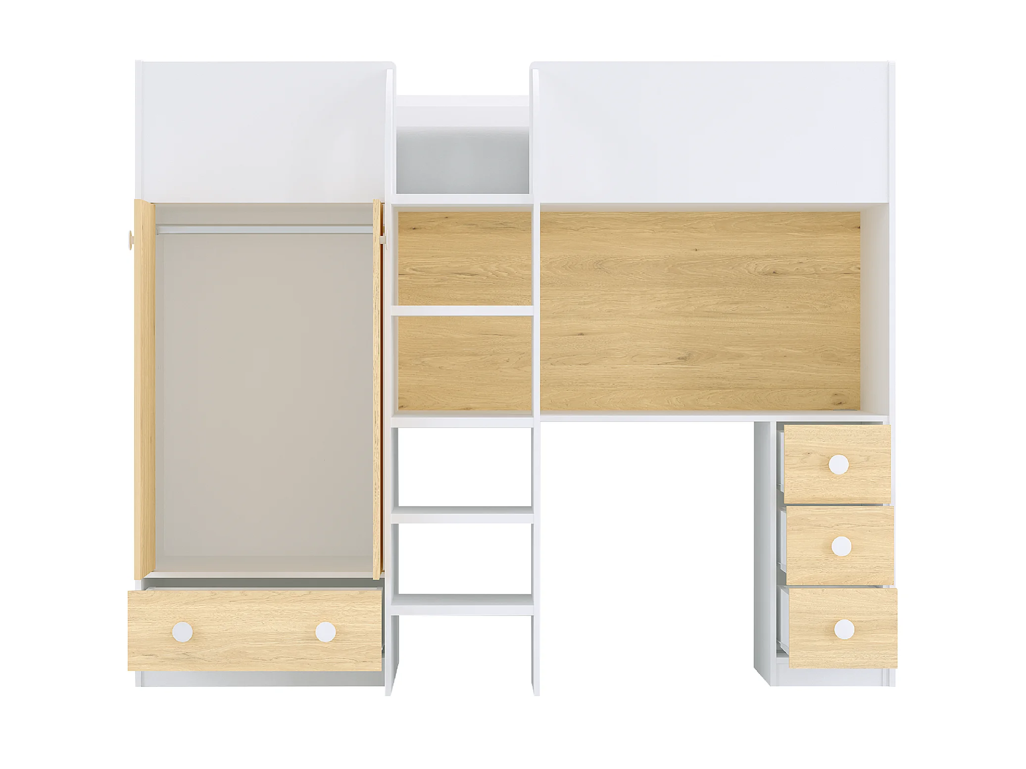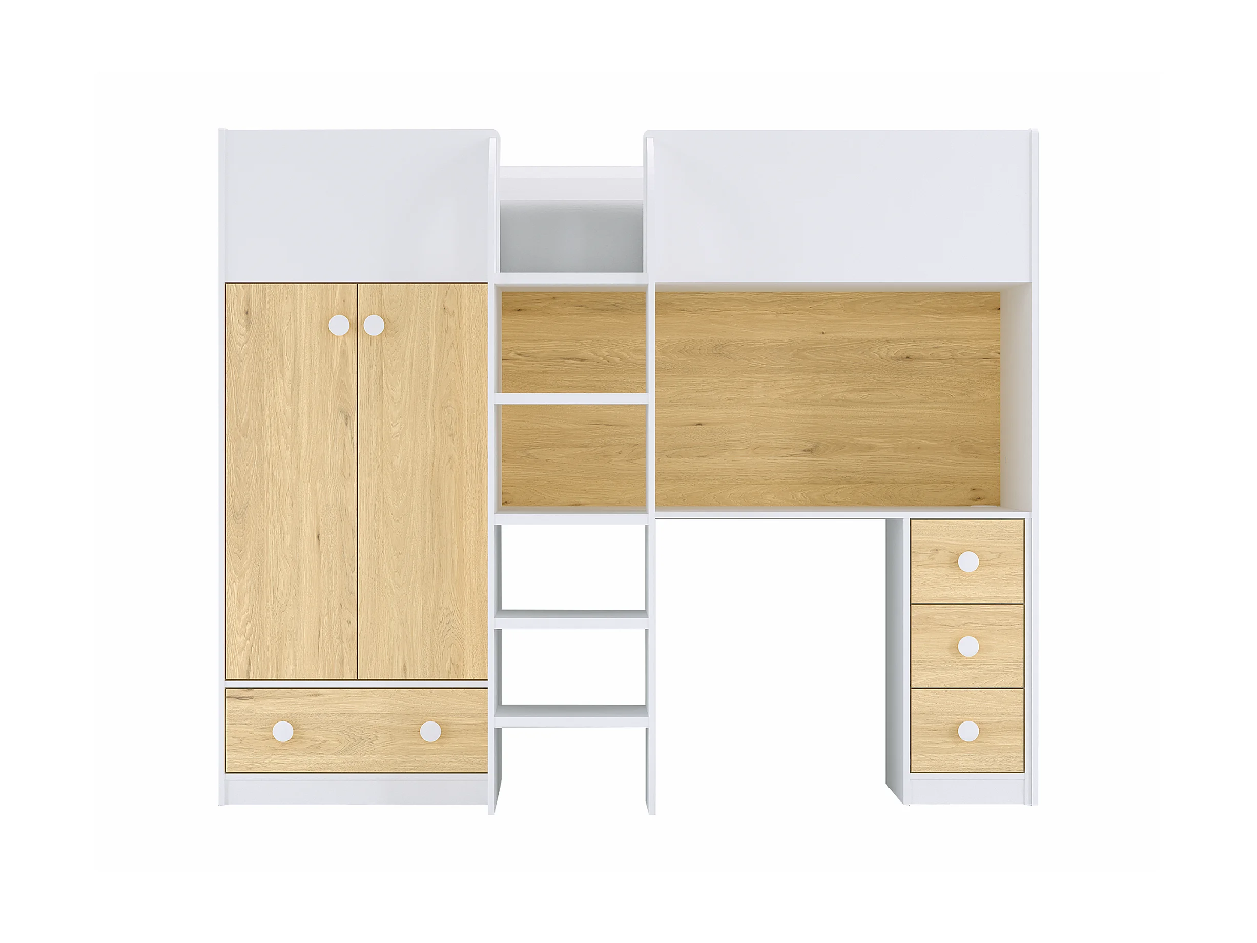 Cama alta 90x190 cm com guarda-roupa e secretária branco e natural - CINAMO