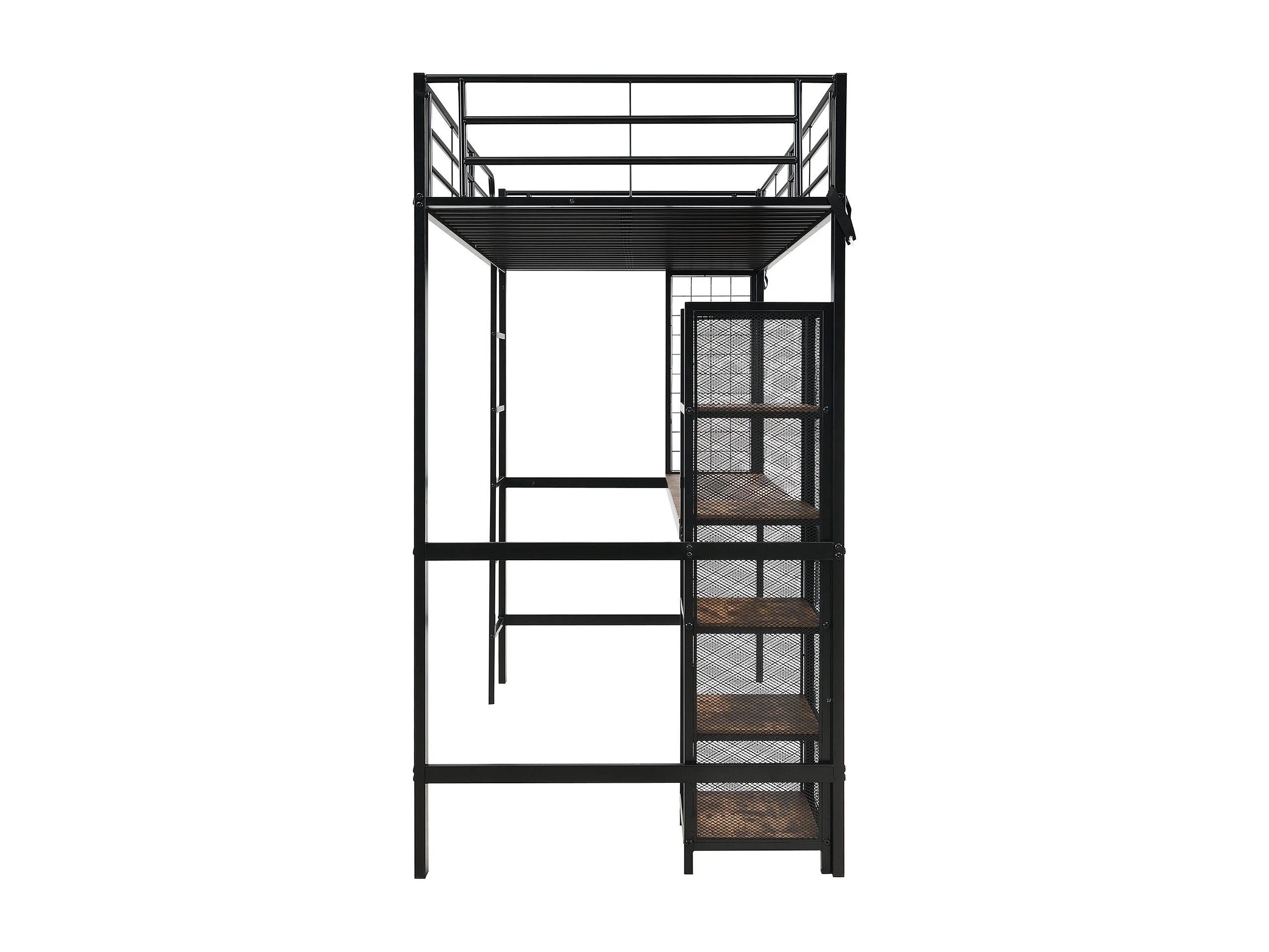Cama alta 90x200cm com mesa e prateleira de arrumação multicamadas, ferro + MDF, preto + madeira escura (sem colchão)