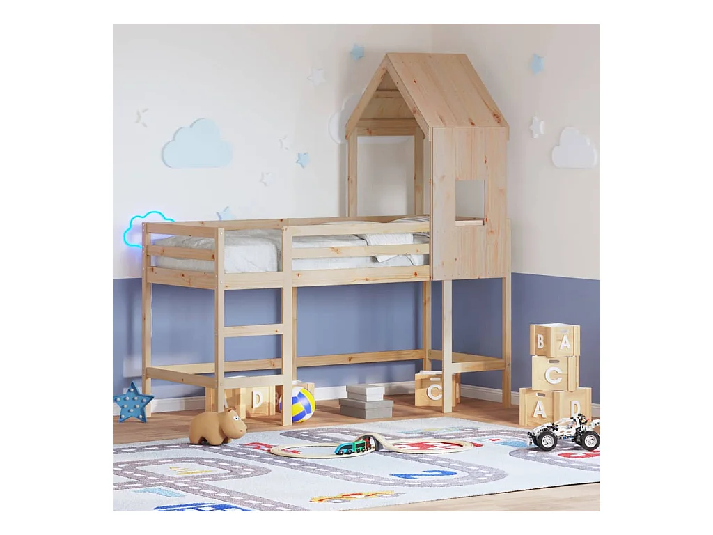 Cama alta c/ escada e telhado 90x200 cm pinho maciço