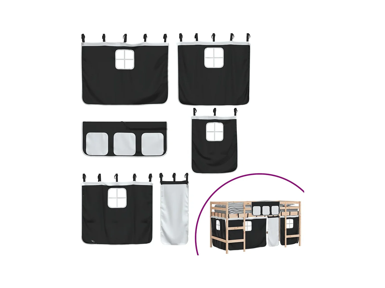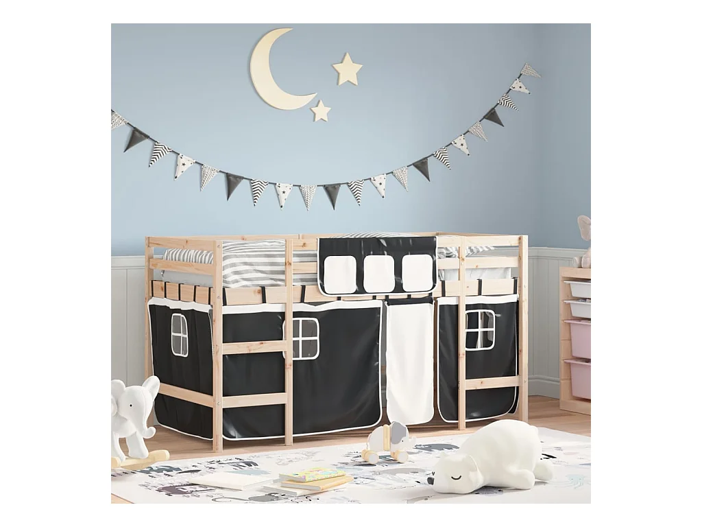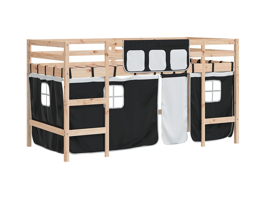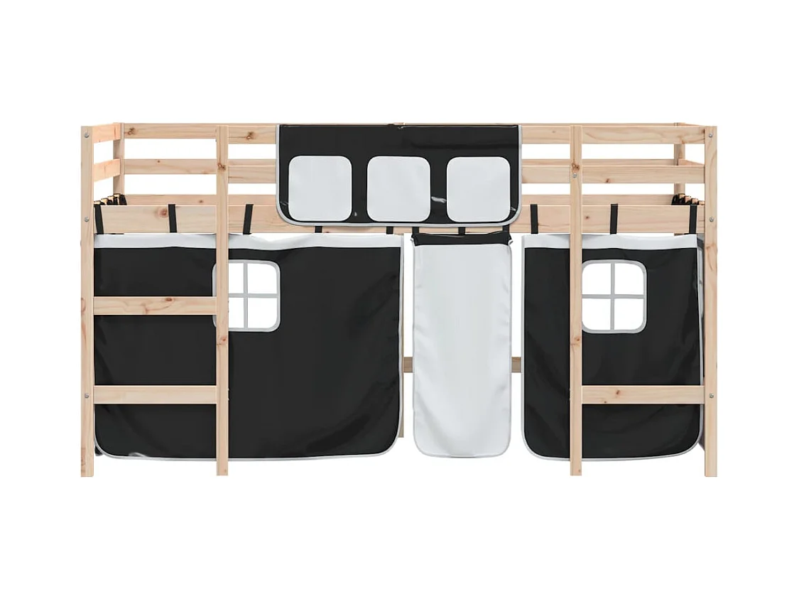 Cama alta criança c/ cortina 80x200cm pinho maciço branco/preto