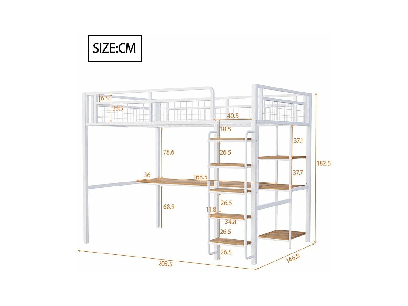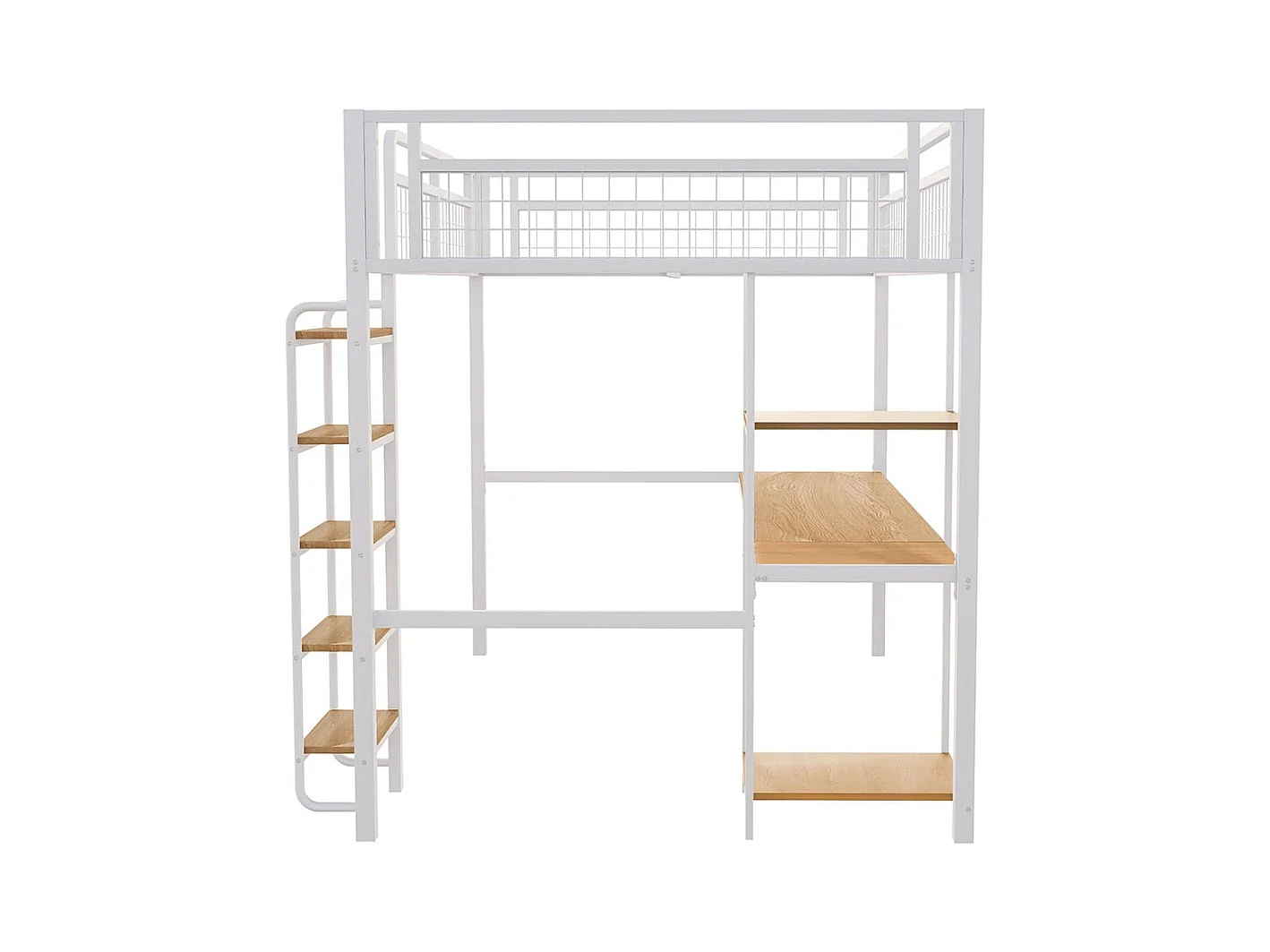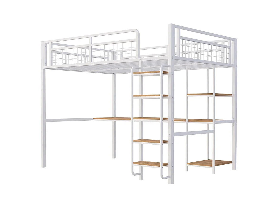 Cama alta metálica 140*200 cm, escada de segurança com degraus, cama de criança com mesa e prateleiras, grade de segurança metálica, branco