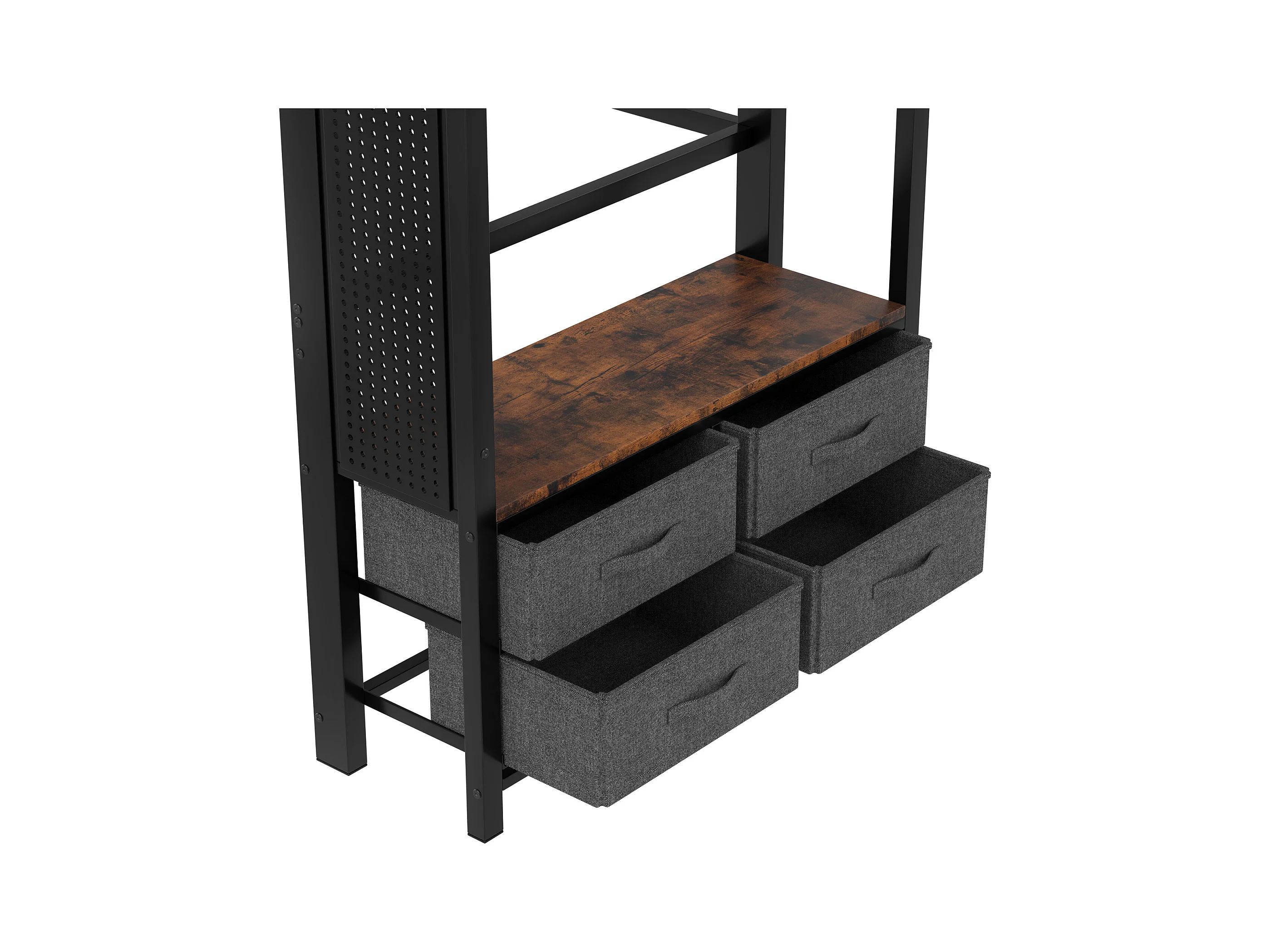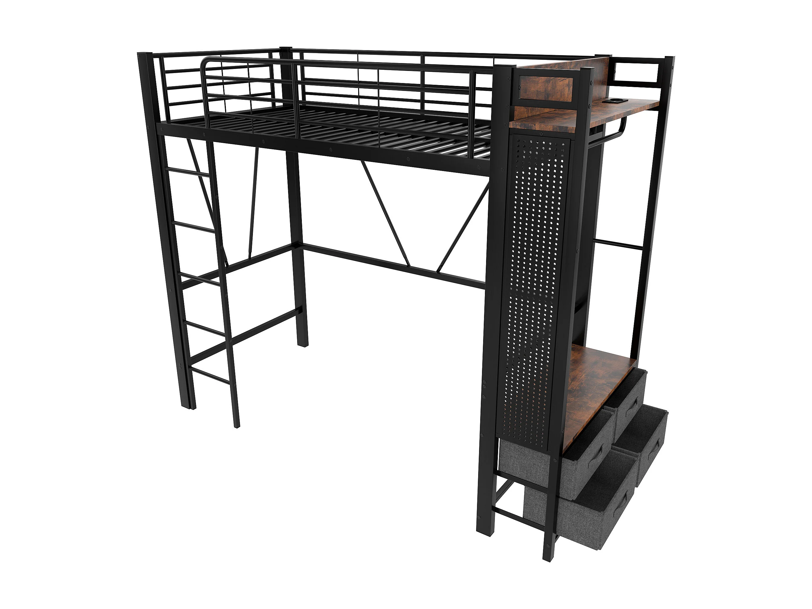 Cama alta preta 90 x 200 cm com 4 gavetas, LED, varão, prateleira, USB + TIPO-C, painel perfurado (sem colchão)