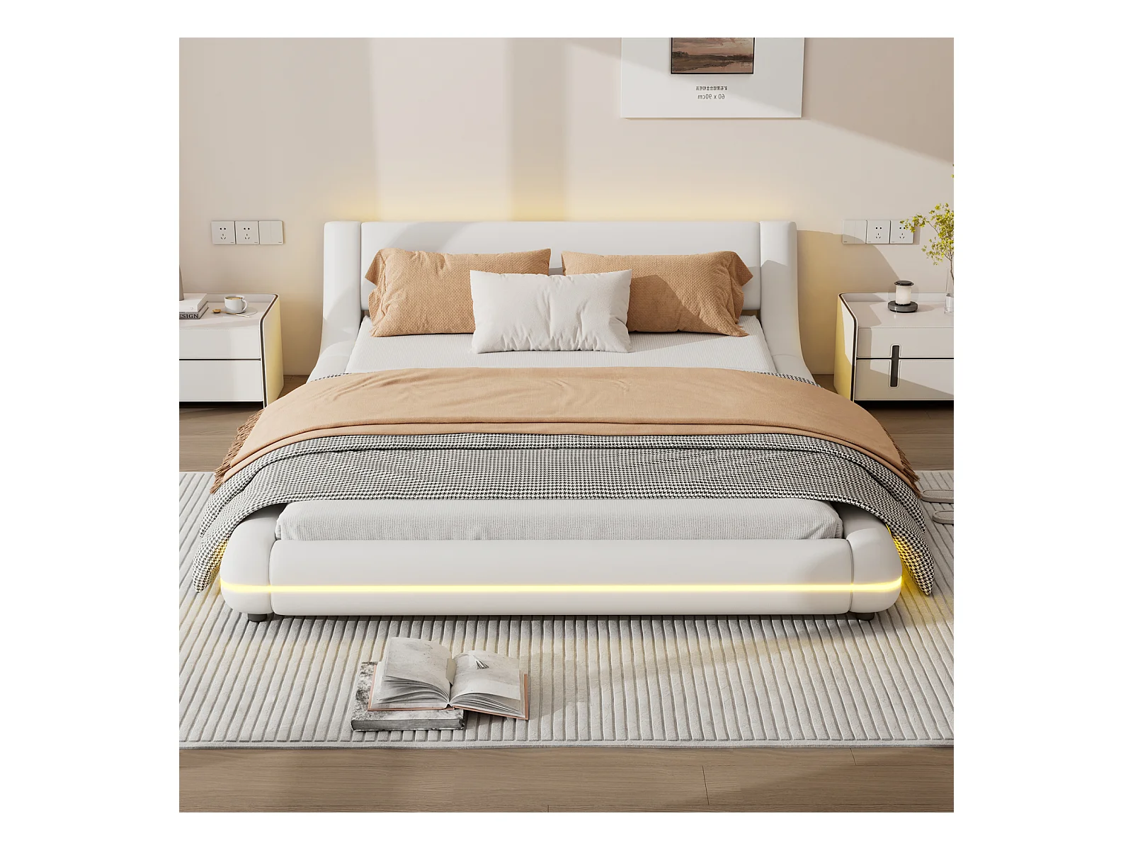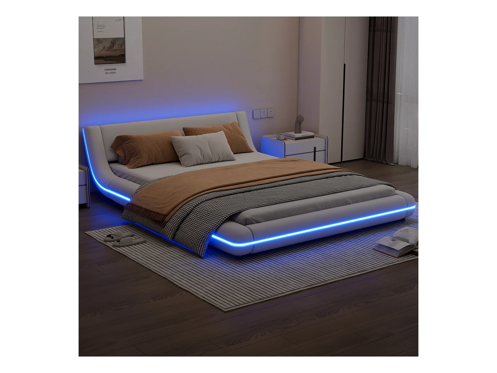 Cama baixa 140x200 cm branca em PU – Iluminação LED Mood, controle remoto de 24 botões