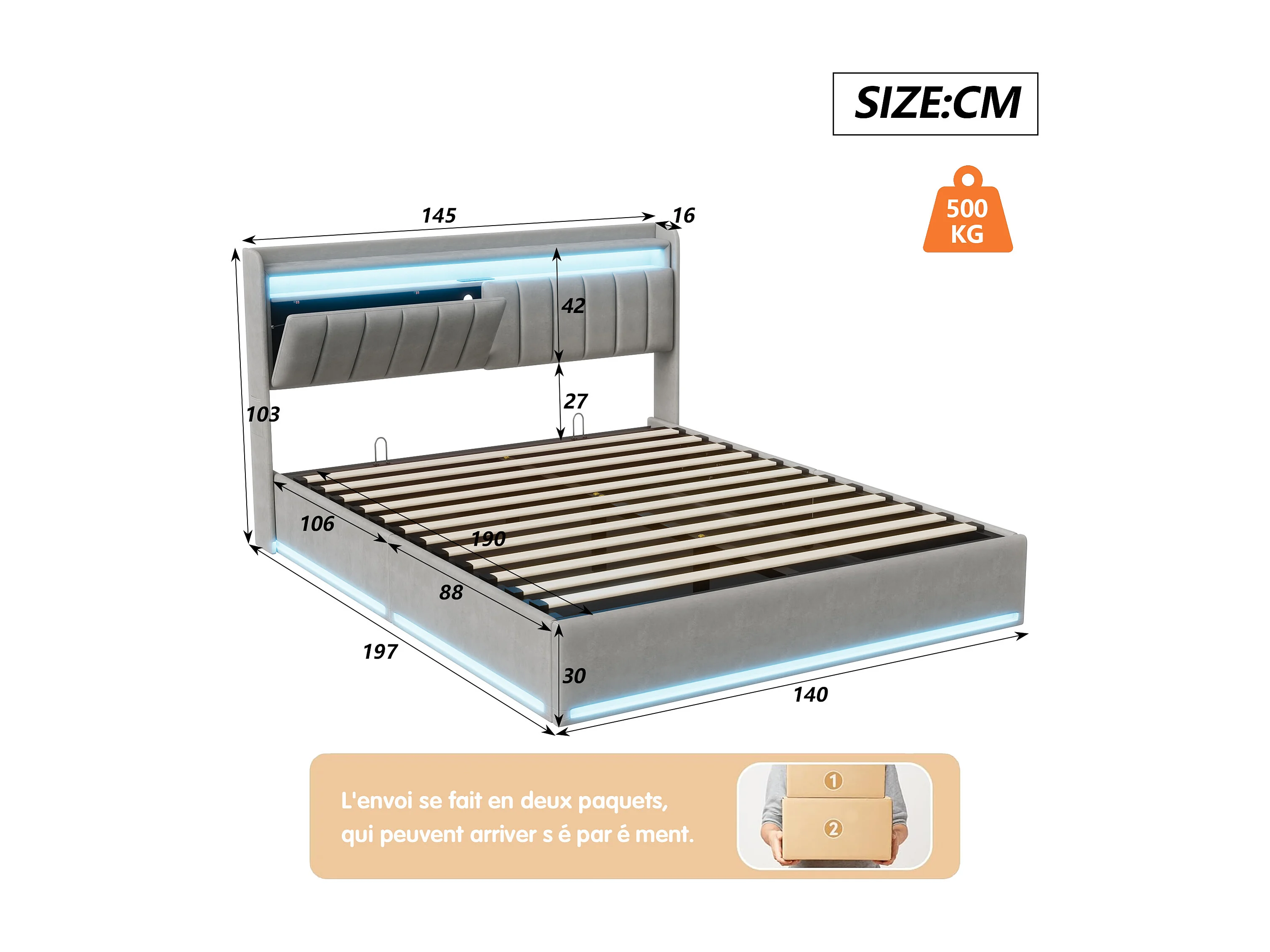 Cama baú 140x190 cm veludo cinza com cabeceira, iluminação LED RGB e portas USB integradas
