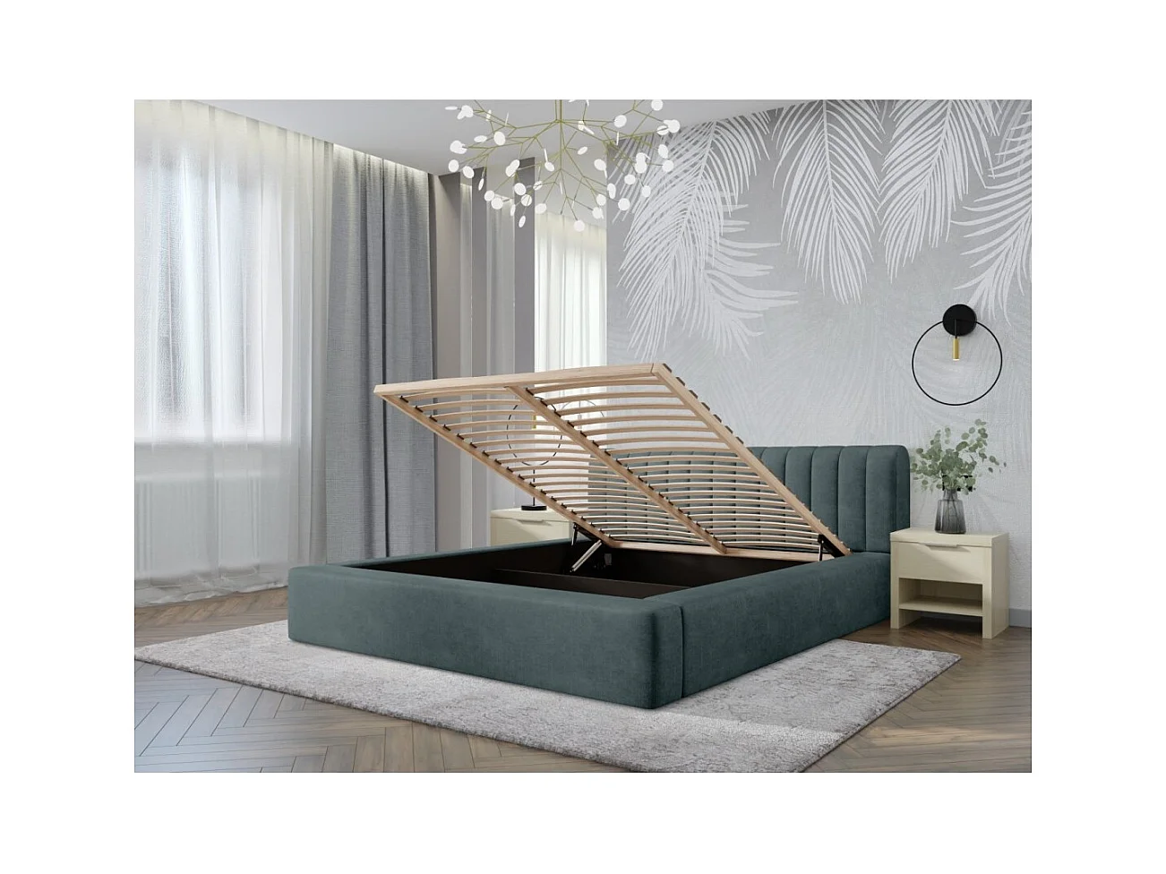 Cama baú DENALI – Verde esmeralda – 160x200 cm – Tecido de veludo macio – Estrado elevatório – Armazenamento integrado