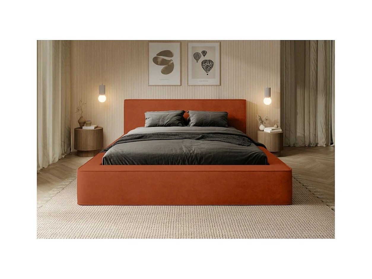 Cama baú DENALI – Terracota – 140x200 cm – Tecido veludo macio – Estrado elevatório – Armazenamento integrado