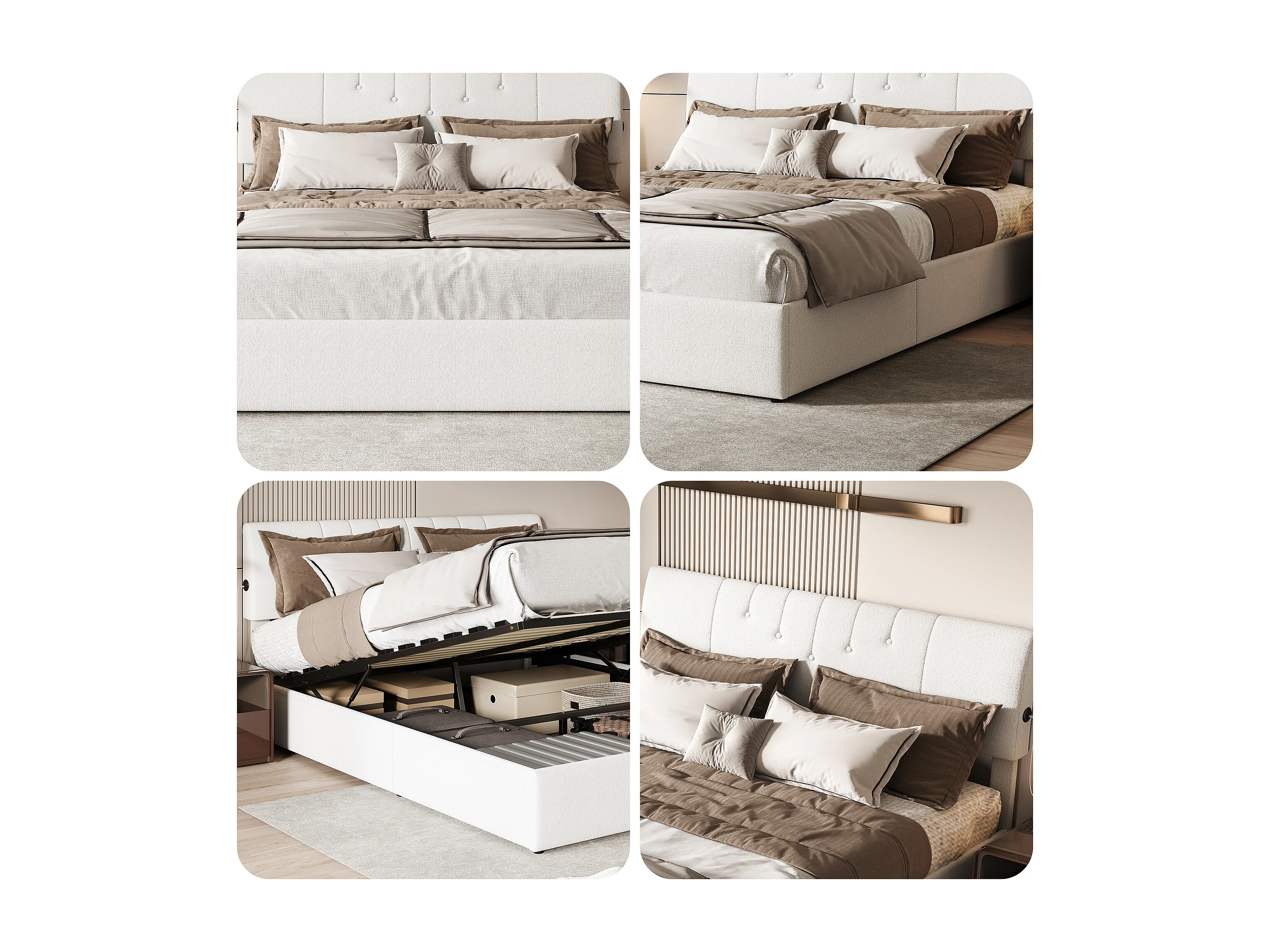 Cama box estofada, 160 x 200 cm, com estrado de ripas e espaço de armazenamento, cor creme.