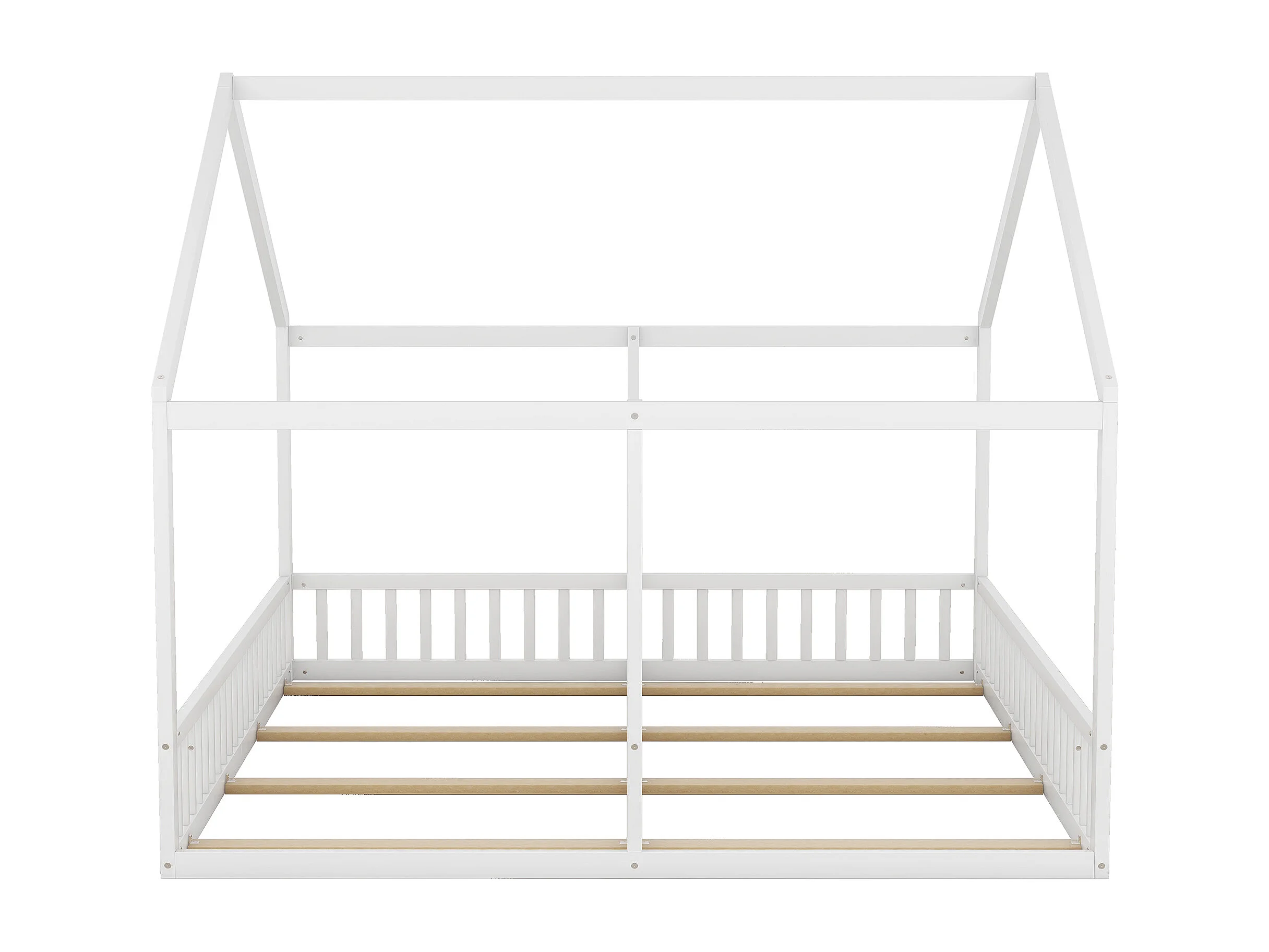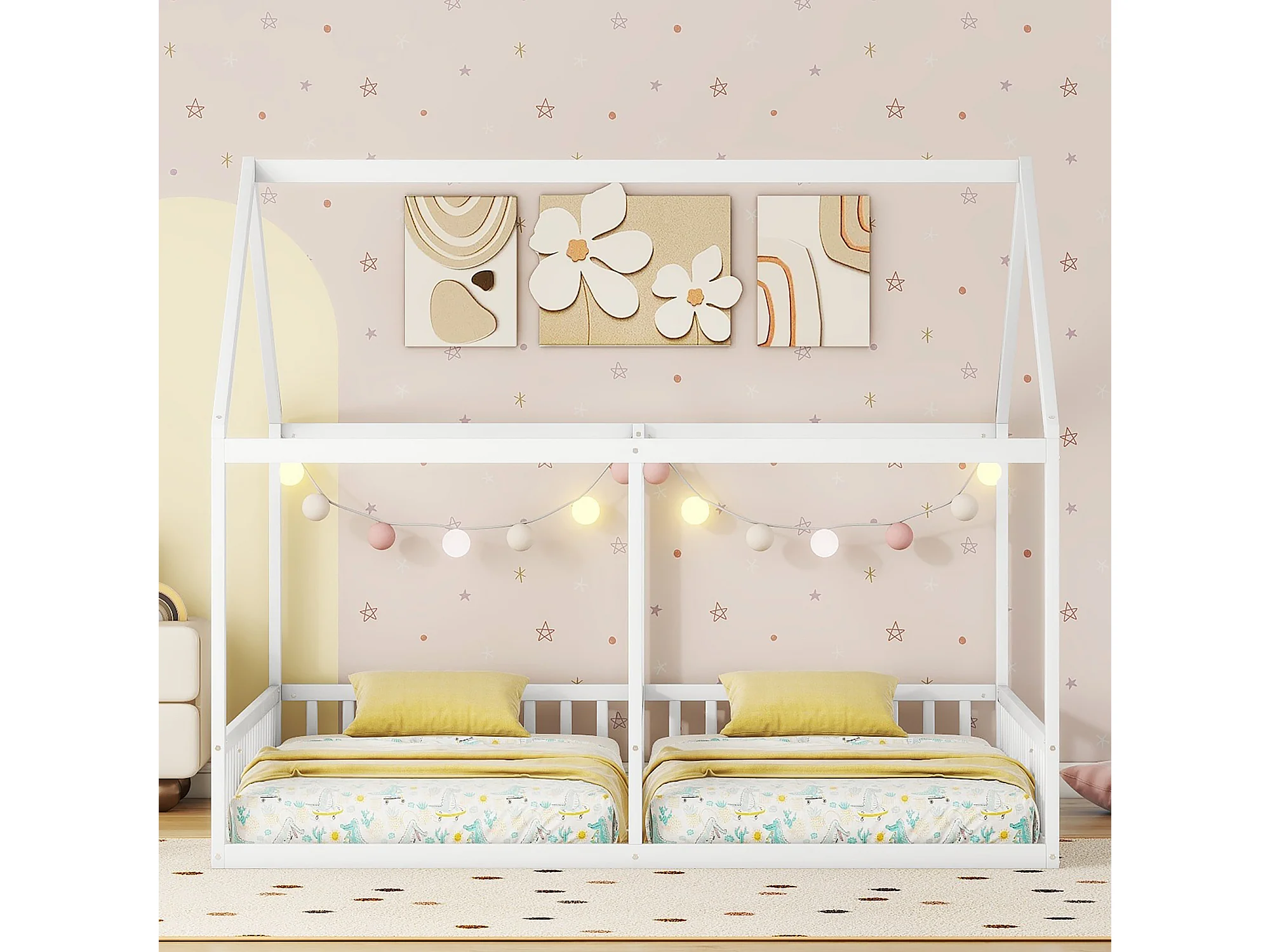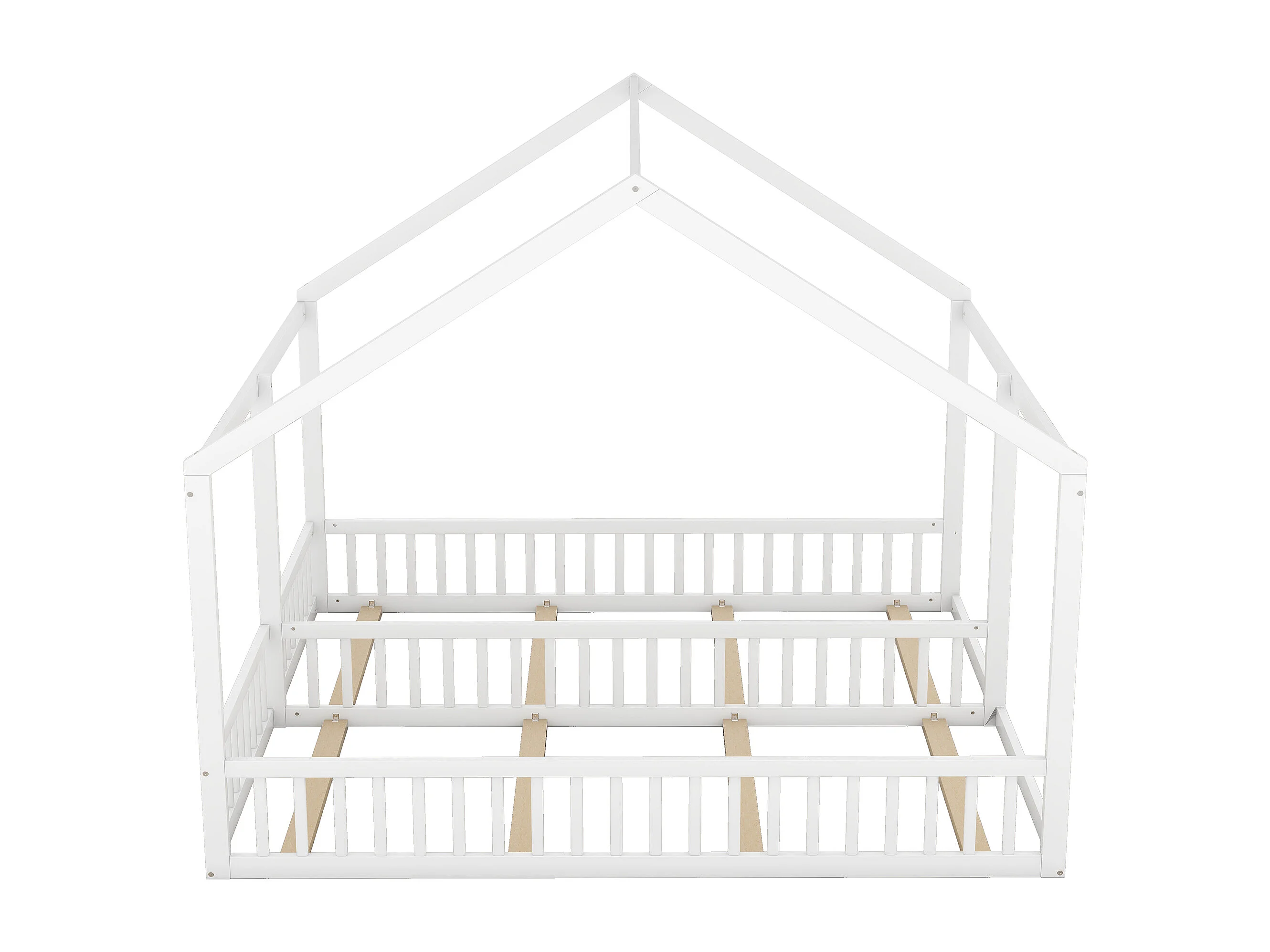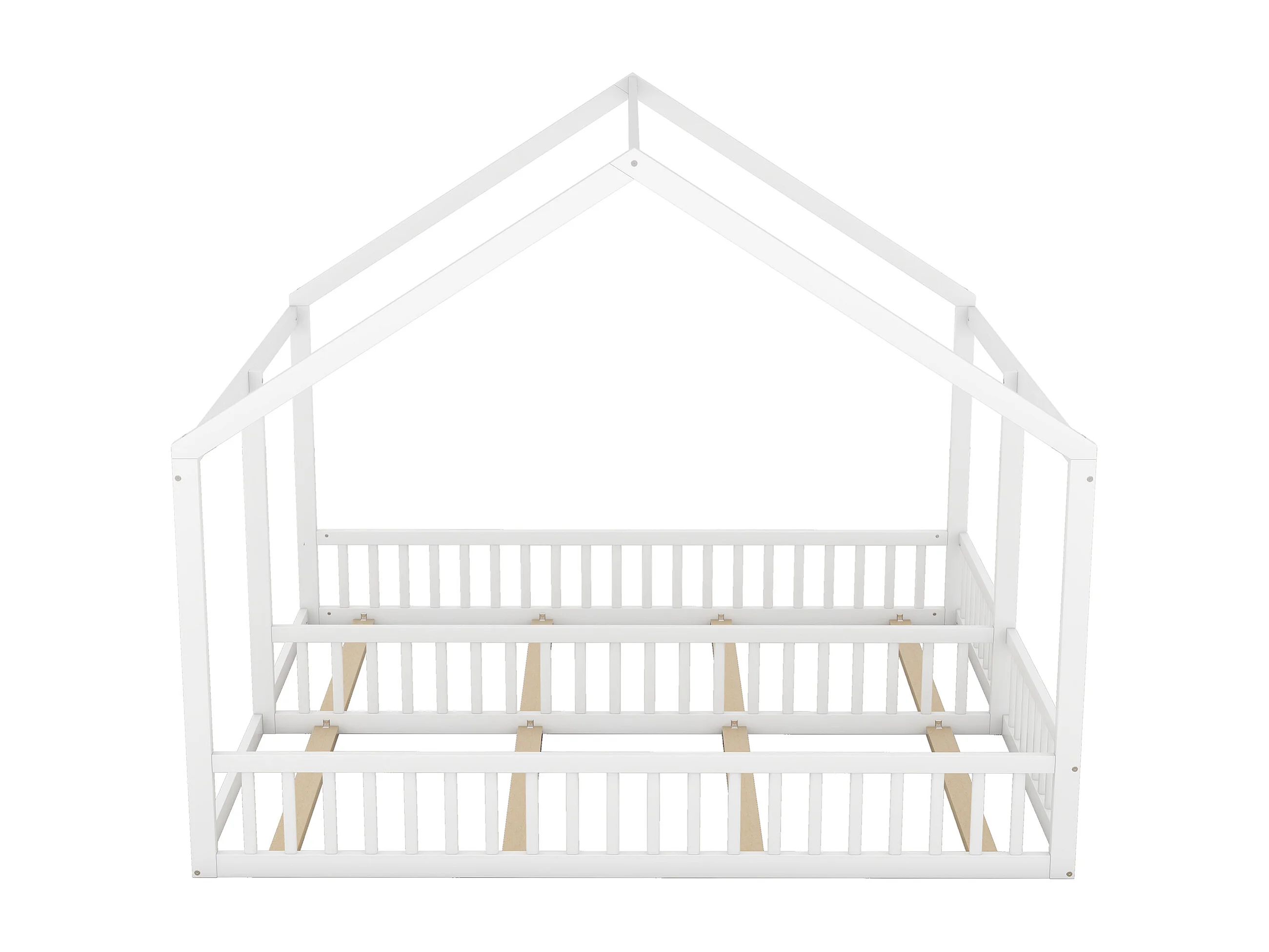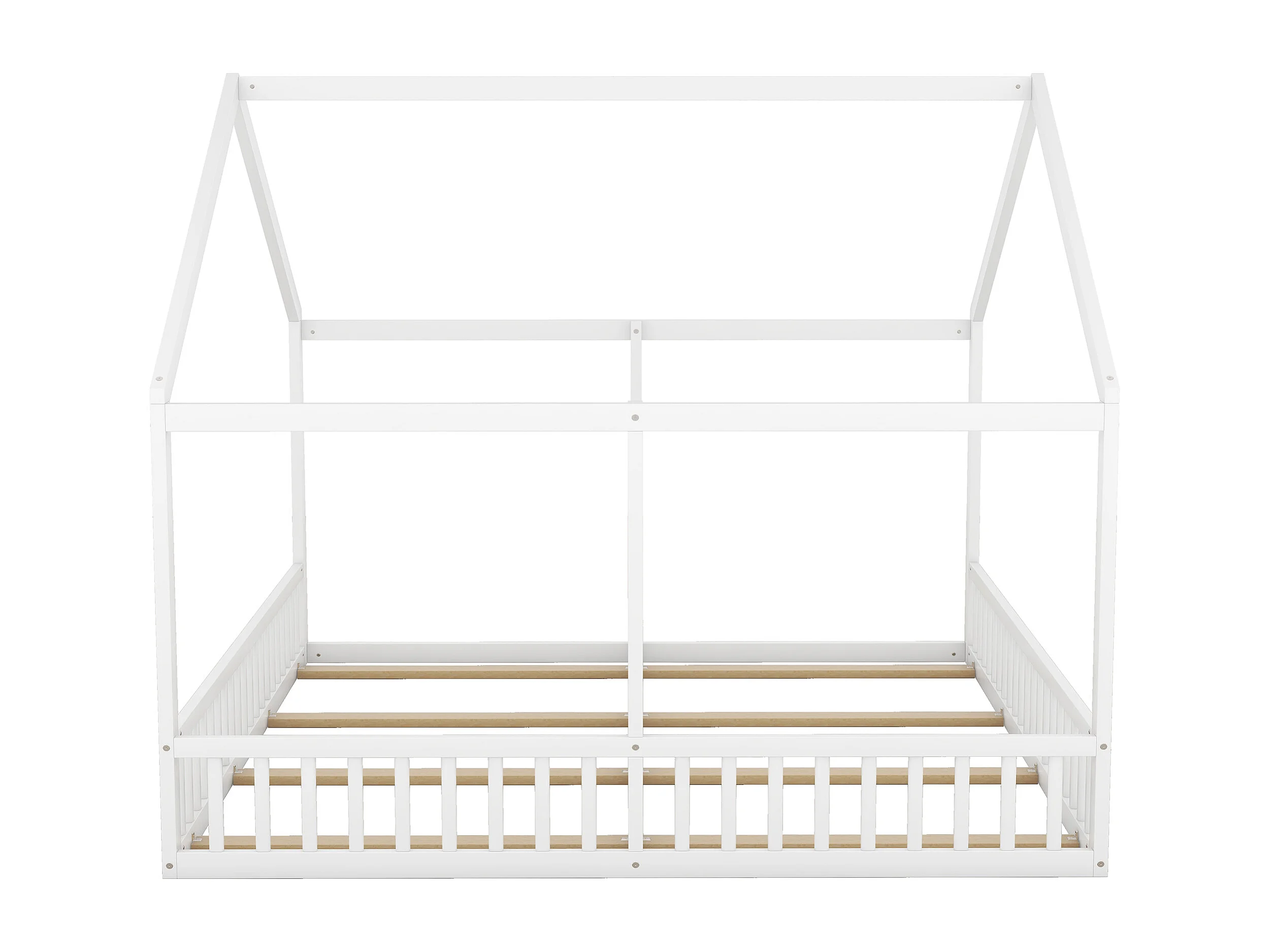 Cama cabana 90x200 cm 2 em 1, em madeira com grades de segurança e teto decorativo, branco (sem colchão)
