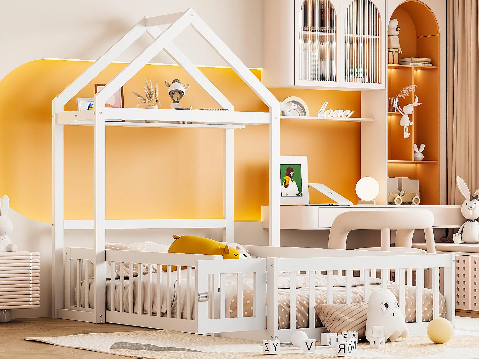 Cama cabine infantil com barreiras e porta, 90 x 200 cm, madeira maciça, arrumação, lacado branco