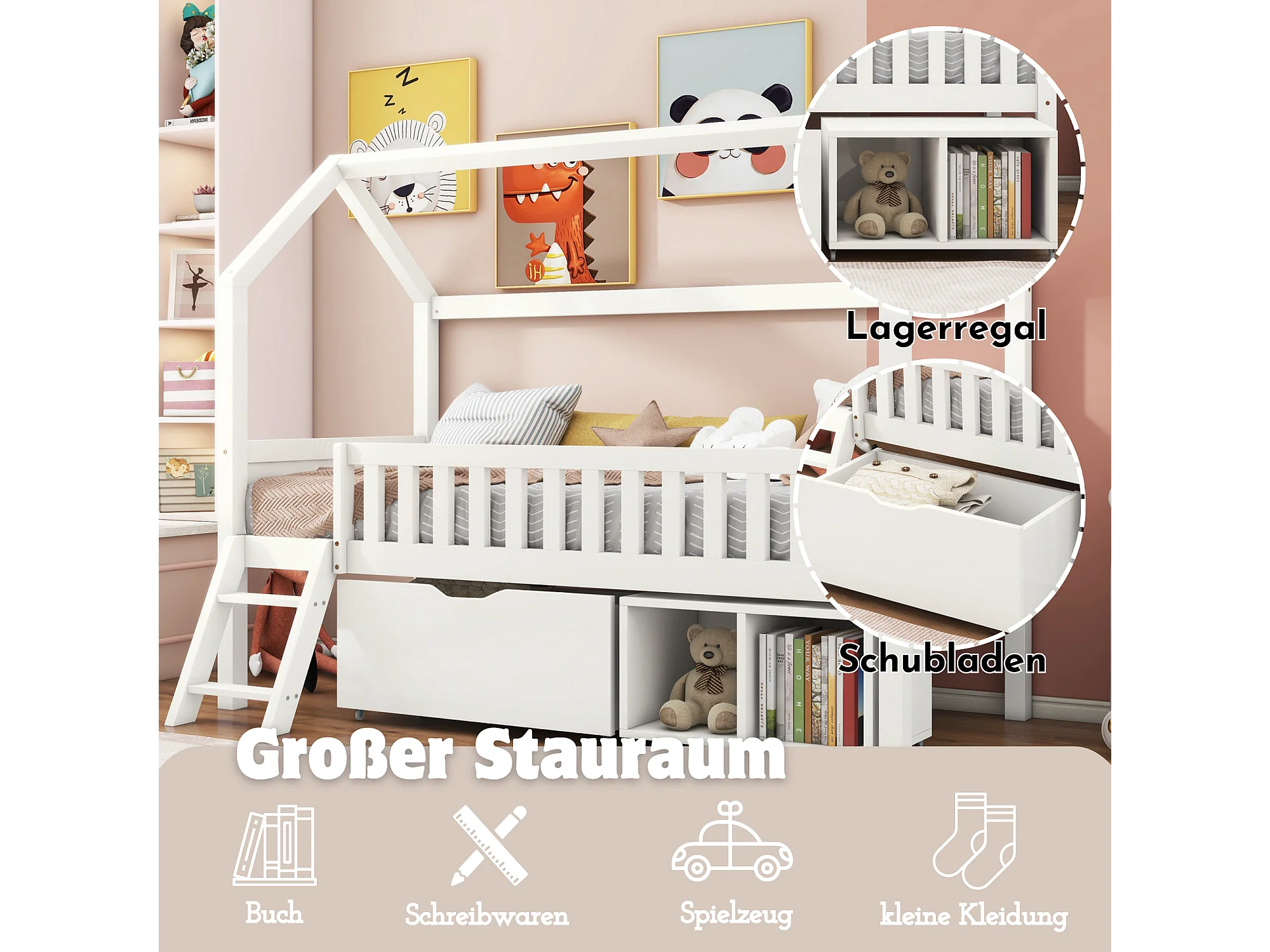 Cama casinha infantil 200x90cm madeira com gavetas e barreiras de segurança branca