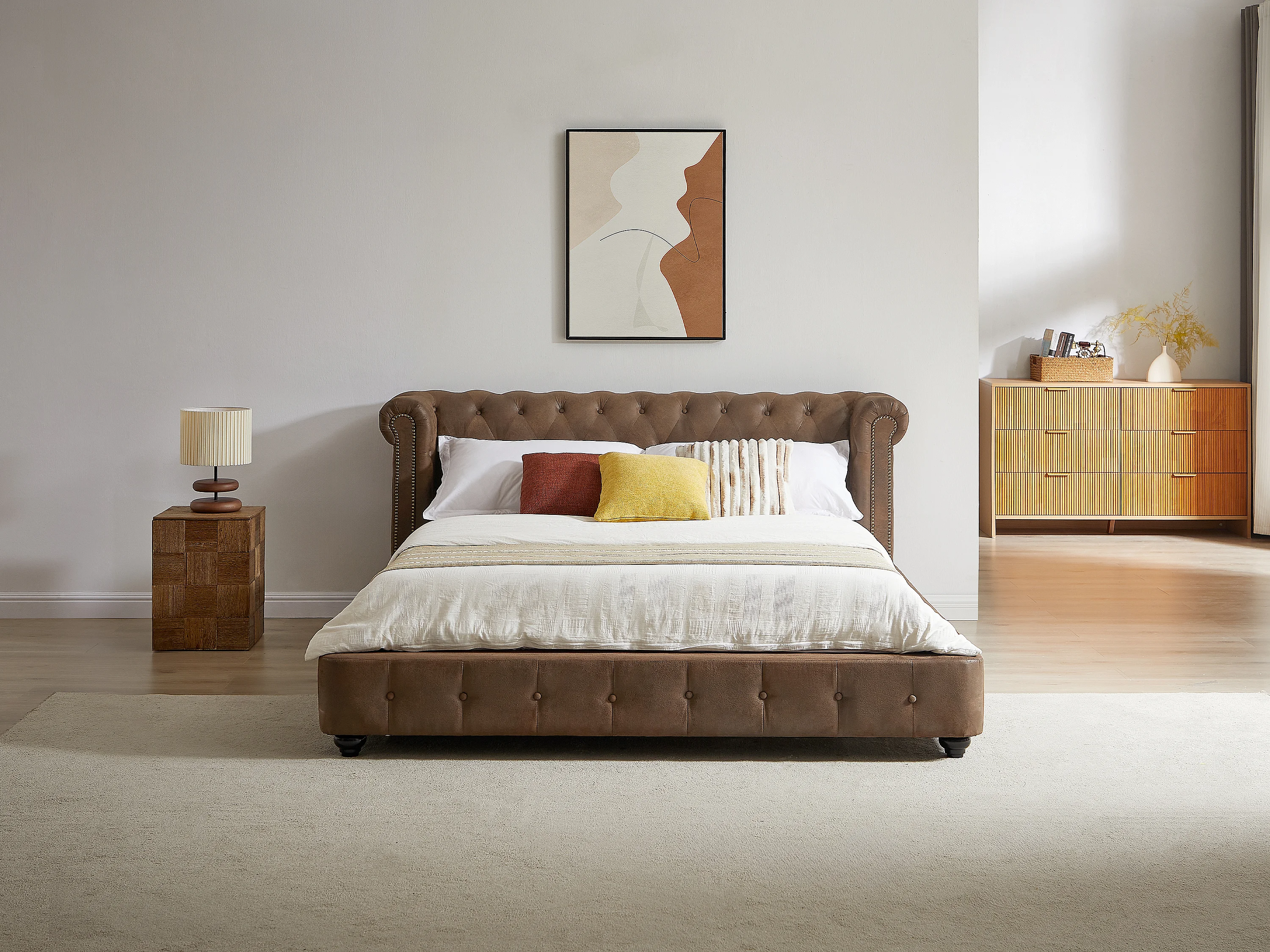 Cama chesterfield 160x200 cm tecido efeito pele envelhecida castanho + colchão - TONGERLA