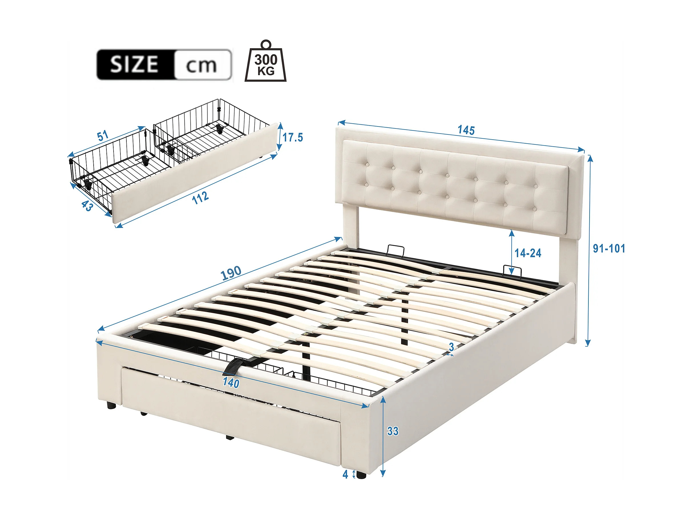Cama com arrumação 140x190 cm - Cama de adulto com gavetas e cabeceira ajustável - veludo bege - sem colchão