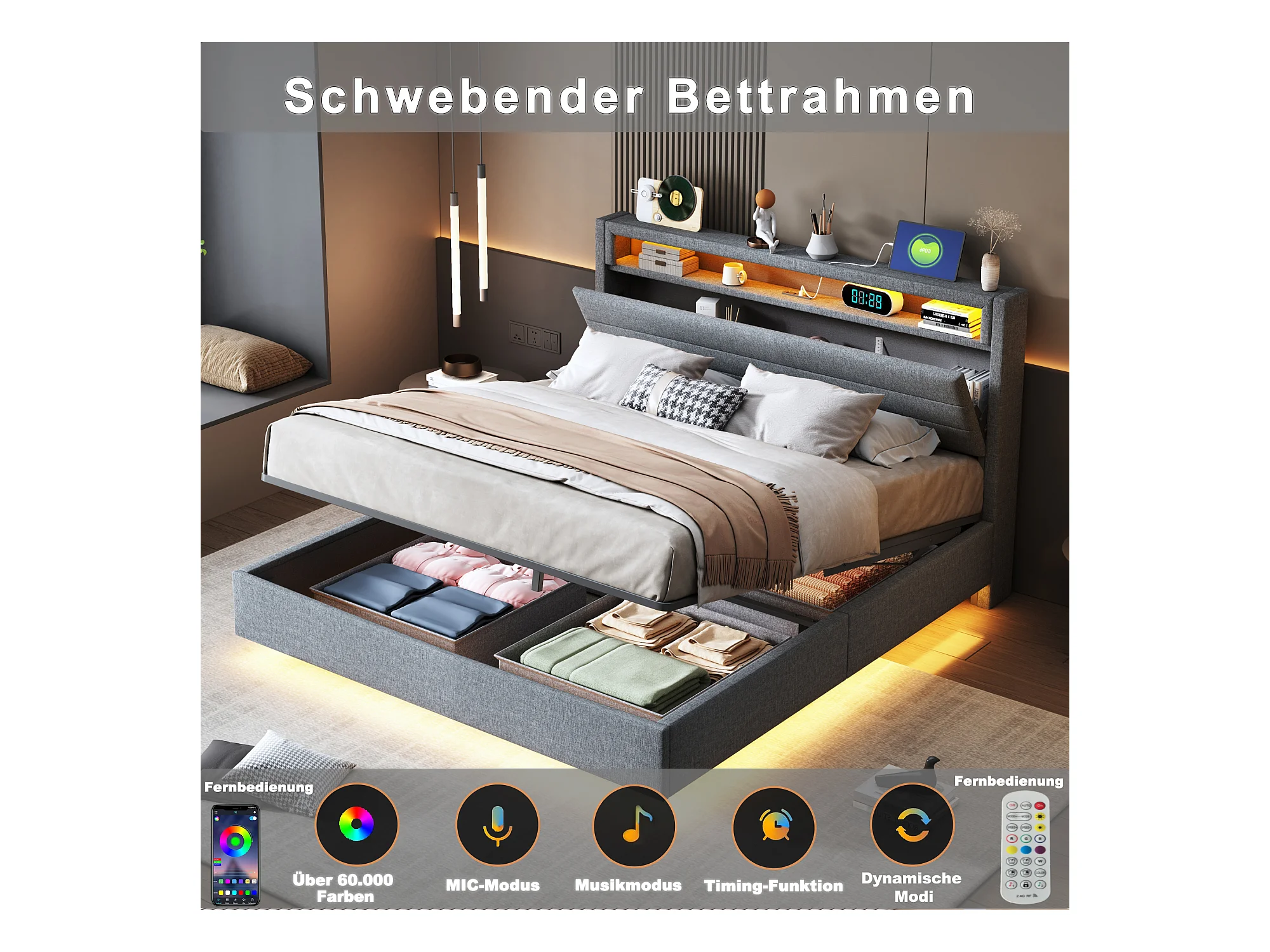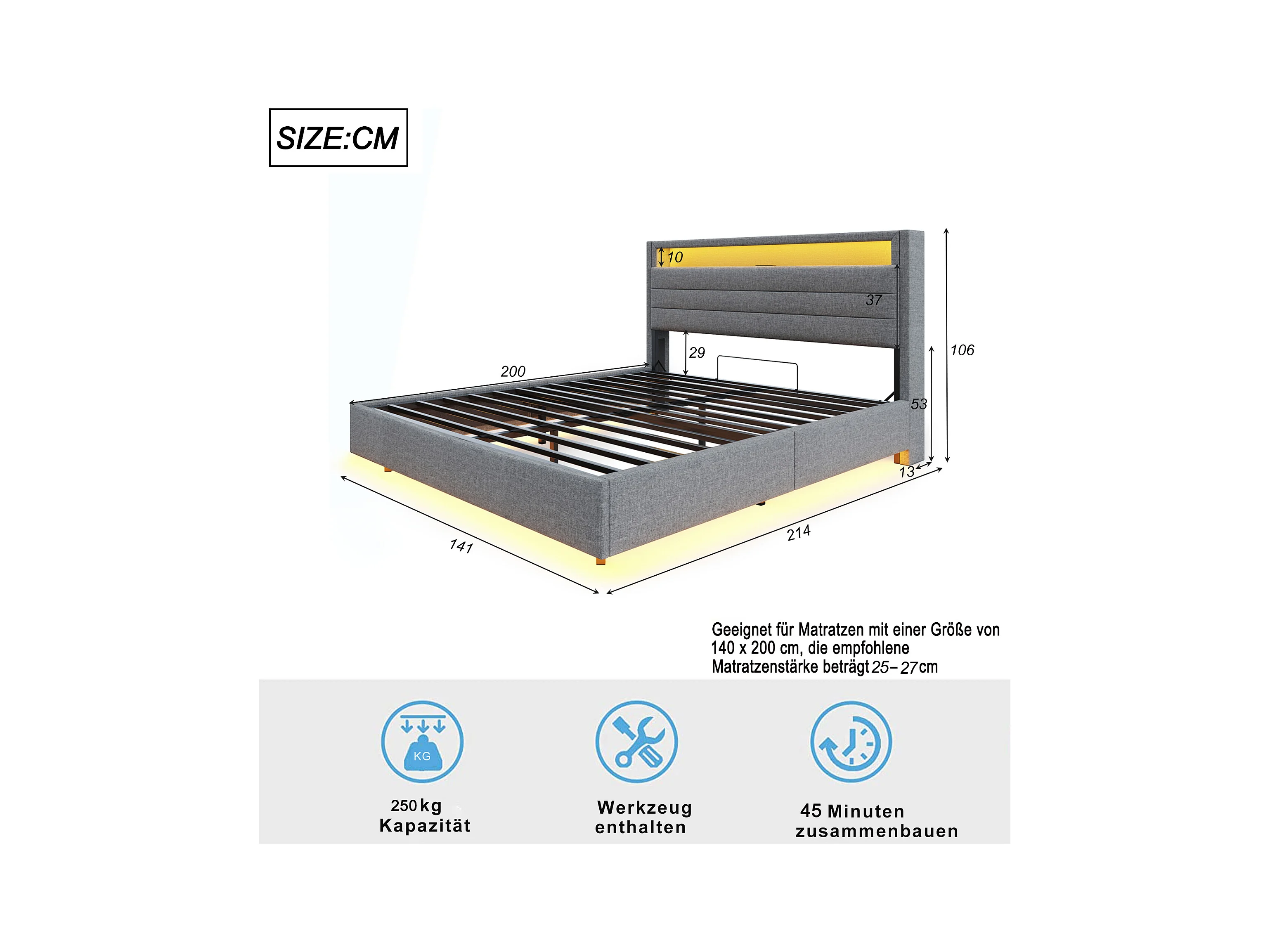 Cama com arrumação 140x200 cm, Cama com iluminação LED e porta USB, com arrumação, Tecido de linho, Cinzento