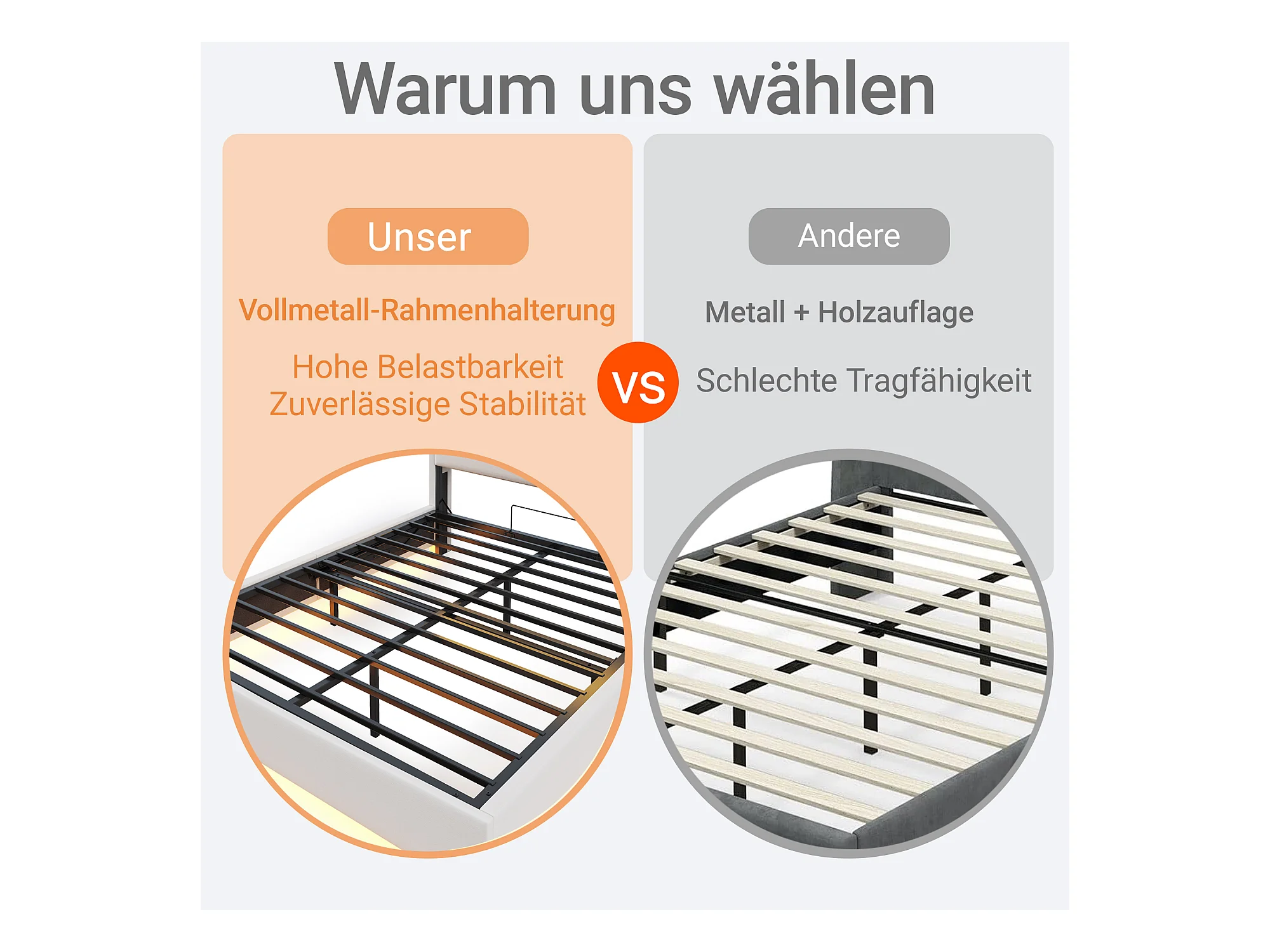 Cama de casal 140 x 200 cm, cama estofada com LED e 2 portas USB, espaço de armazenamento, cinza