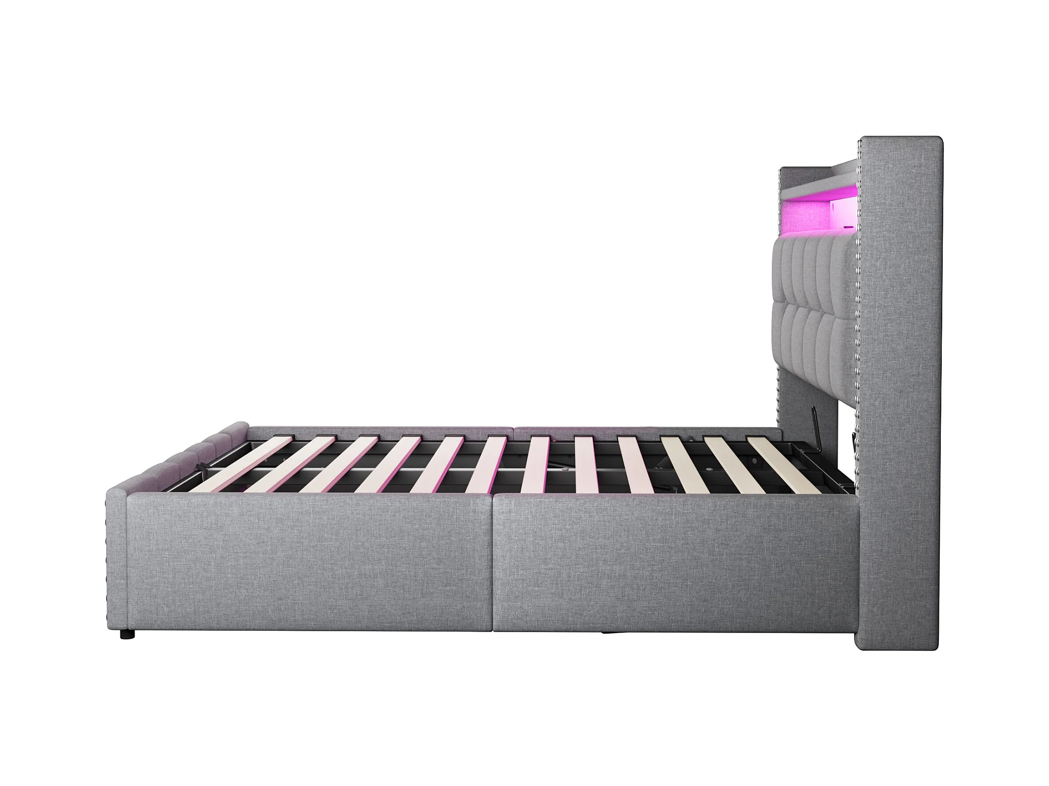 Cama com arrumação 140x200 com iluminação LED e tomada USB, com base de ripas e cabeceira, linho, cinza