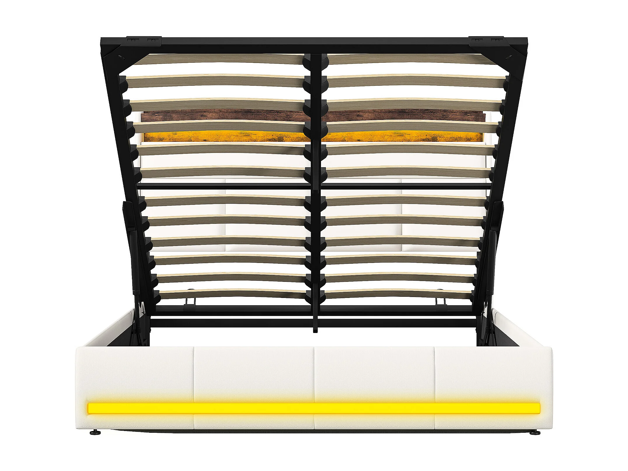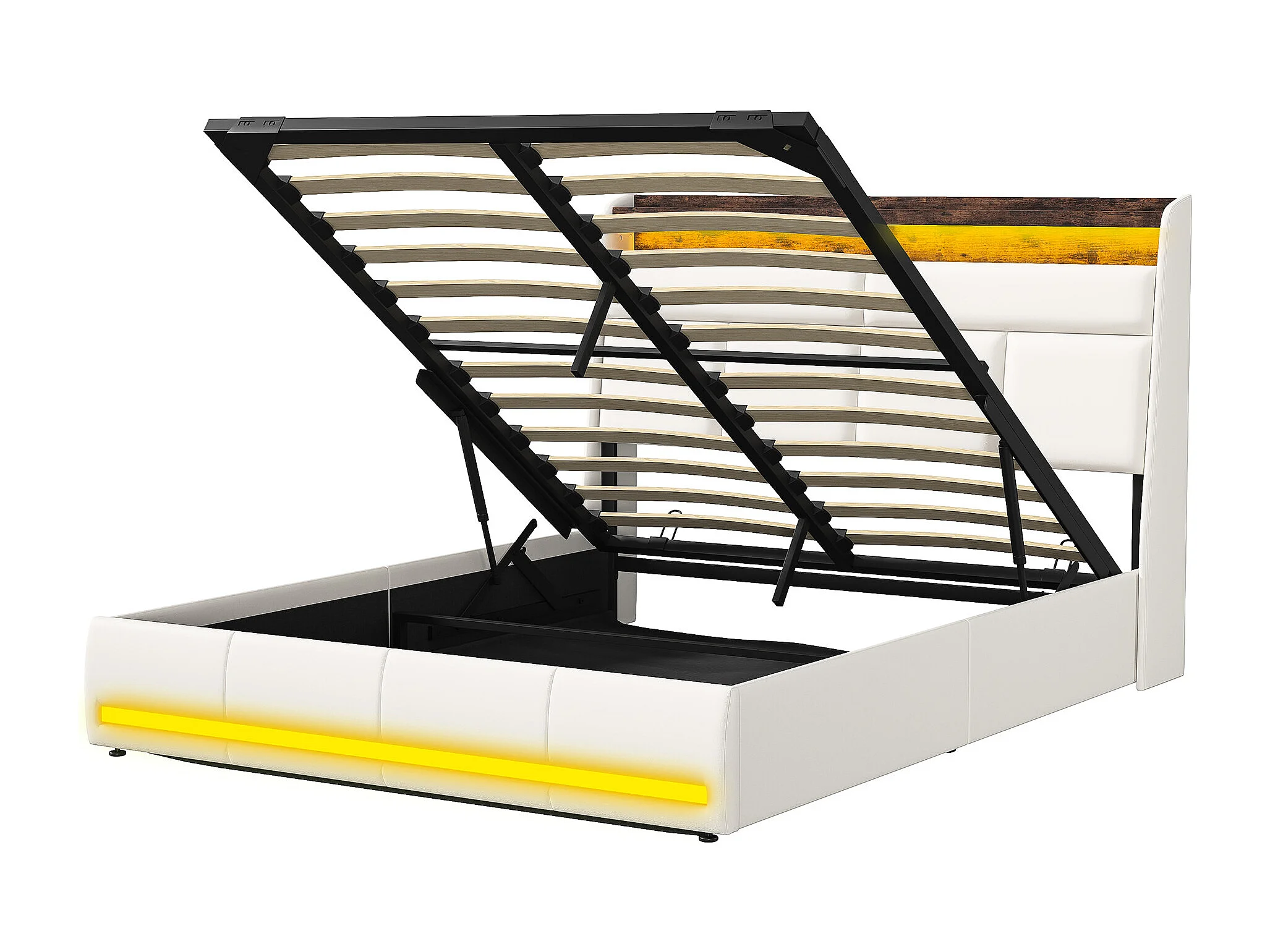 Cama com arrumação, 160 x 200 cm, base de ripas, iluminação LED e porta USB, estrutura de cama estofada com ripas, couro PU, branca.