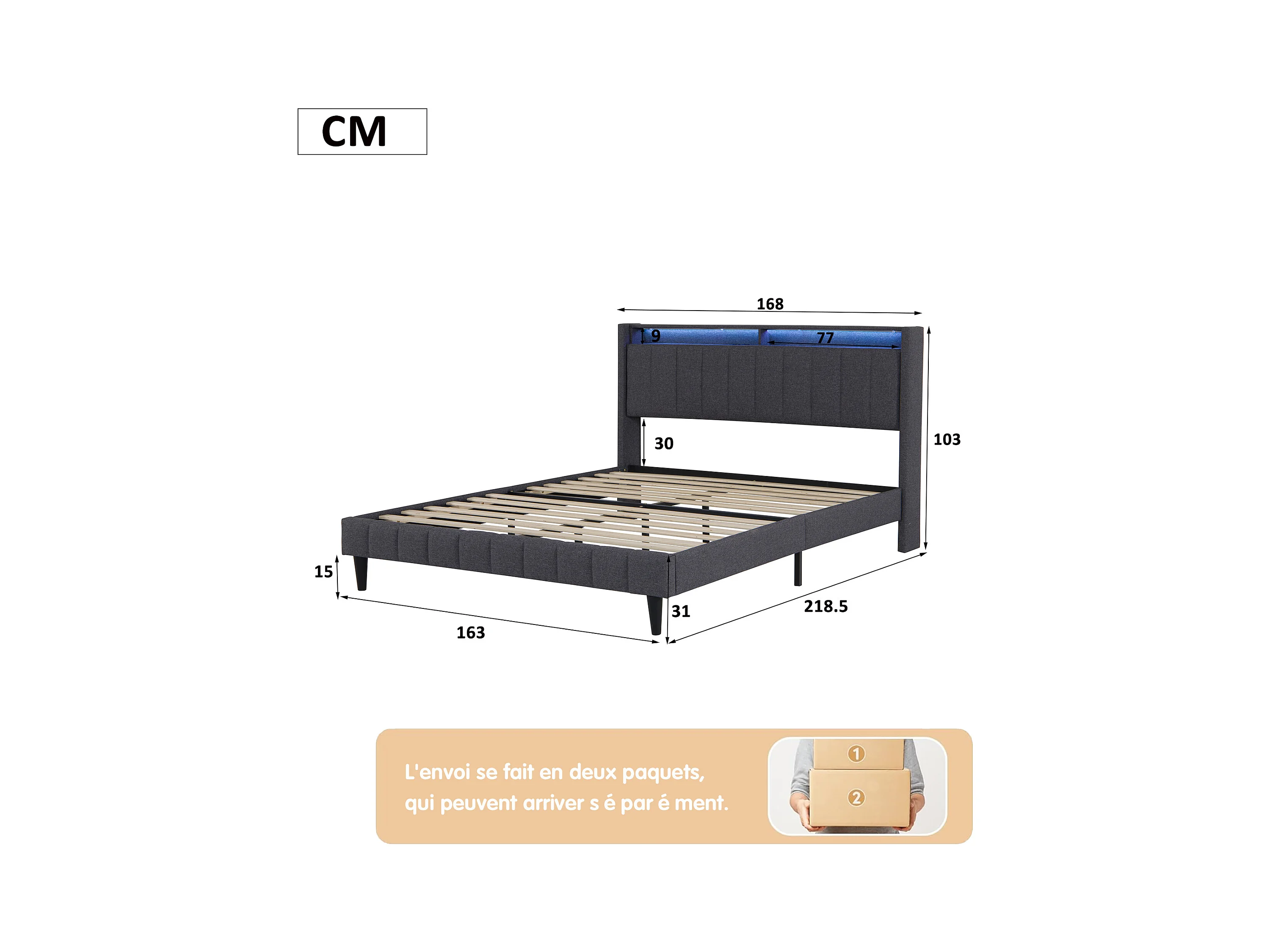 Cama com arrumação 160x200 cm, cama de casal com arrumação, com LED, função de carregamento, linho, cinzento