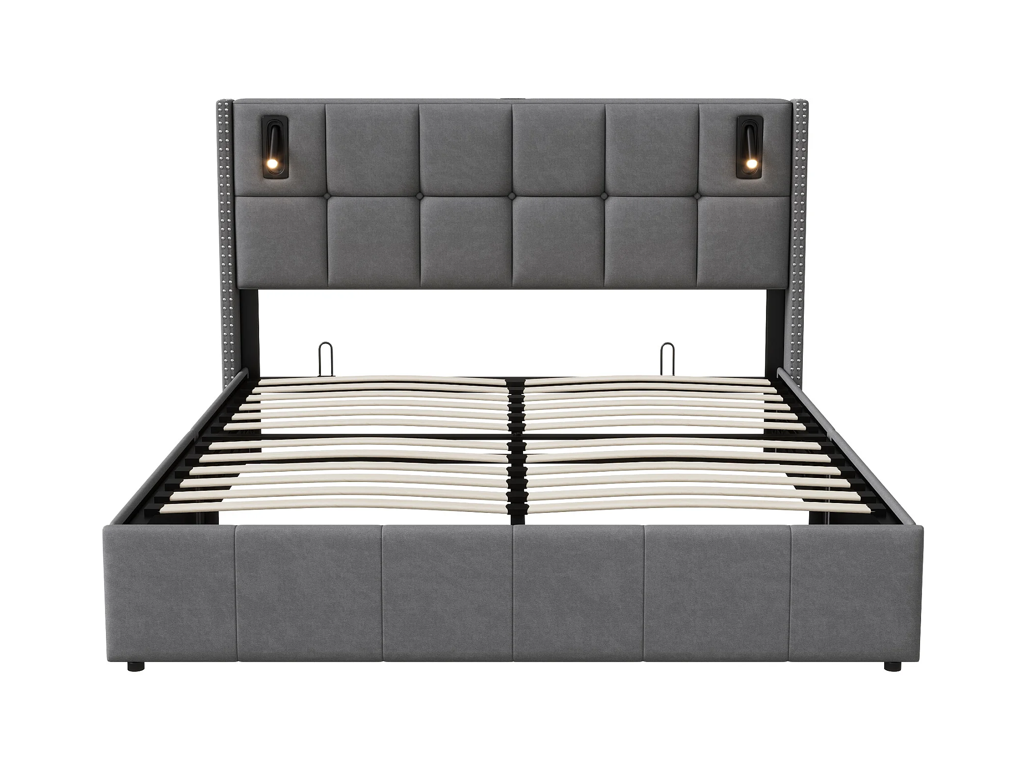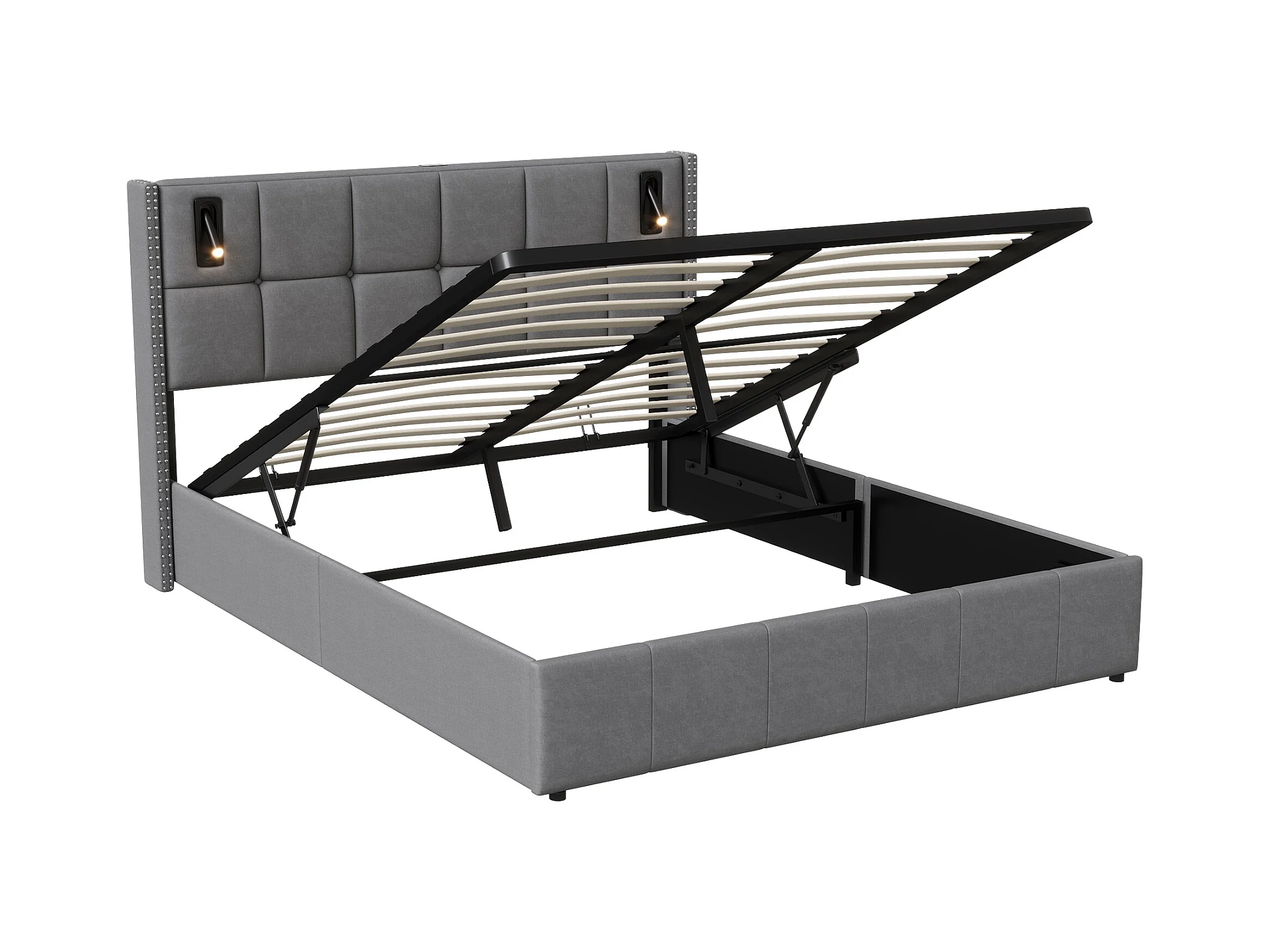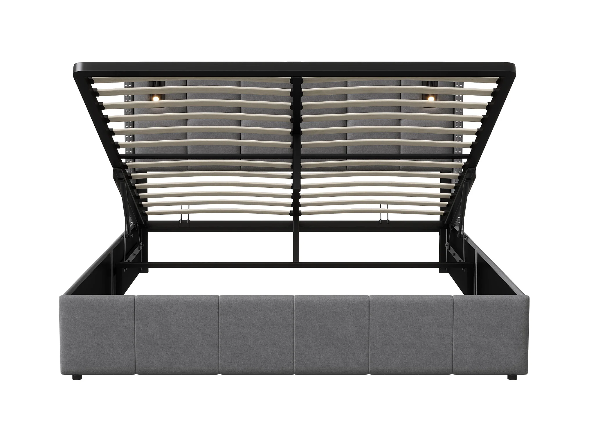 Cama de casal estofada, 160 x 200 cm, com espaço de armazenamento hidráulico, LED, estrado de ripas, cinza