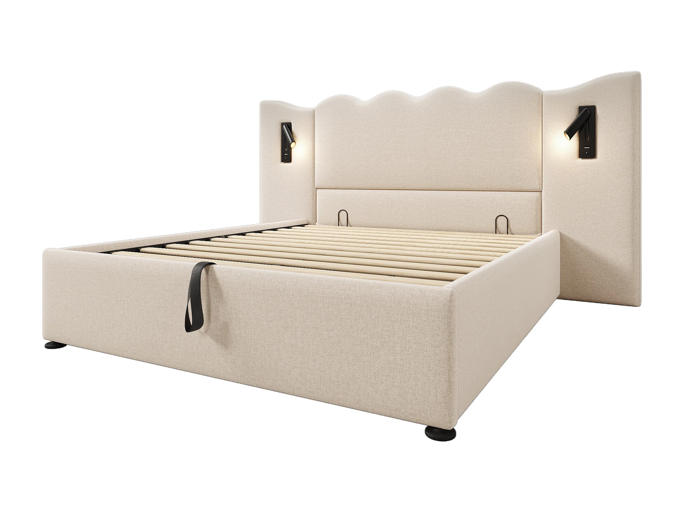 Cama com arrumação 160x200 cm com 2 luzes de leitura e USB, linho bege, sem colchão