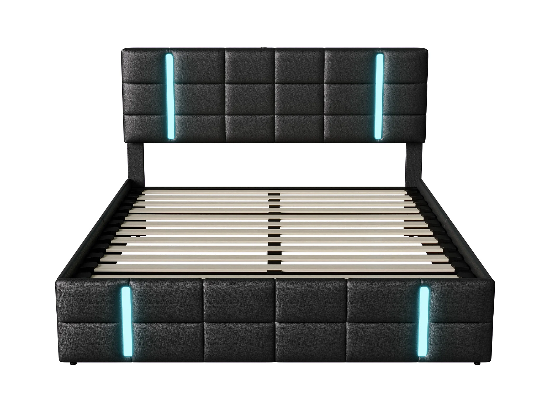 Cama com arrumação 160x200 cm com base, cama de casal estofada com iluminação LED e porta USB, PU, preta