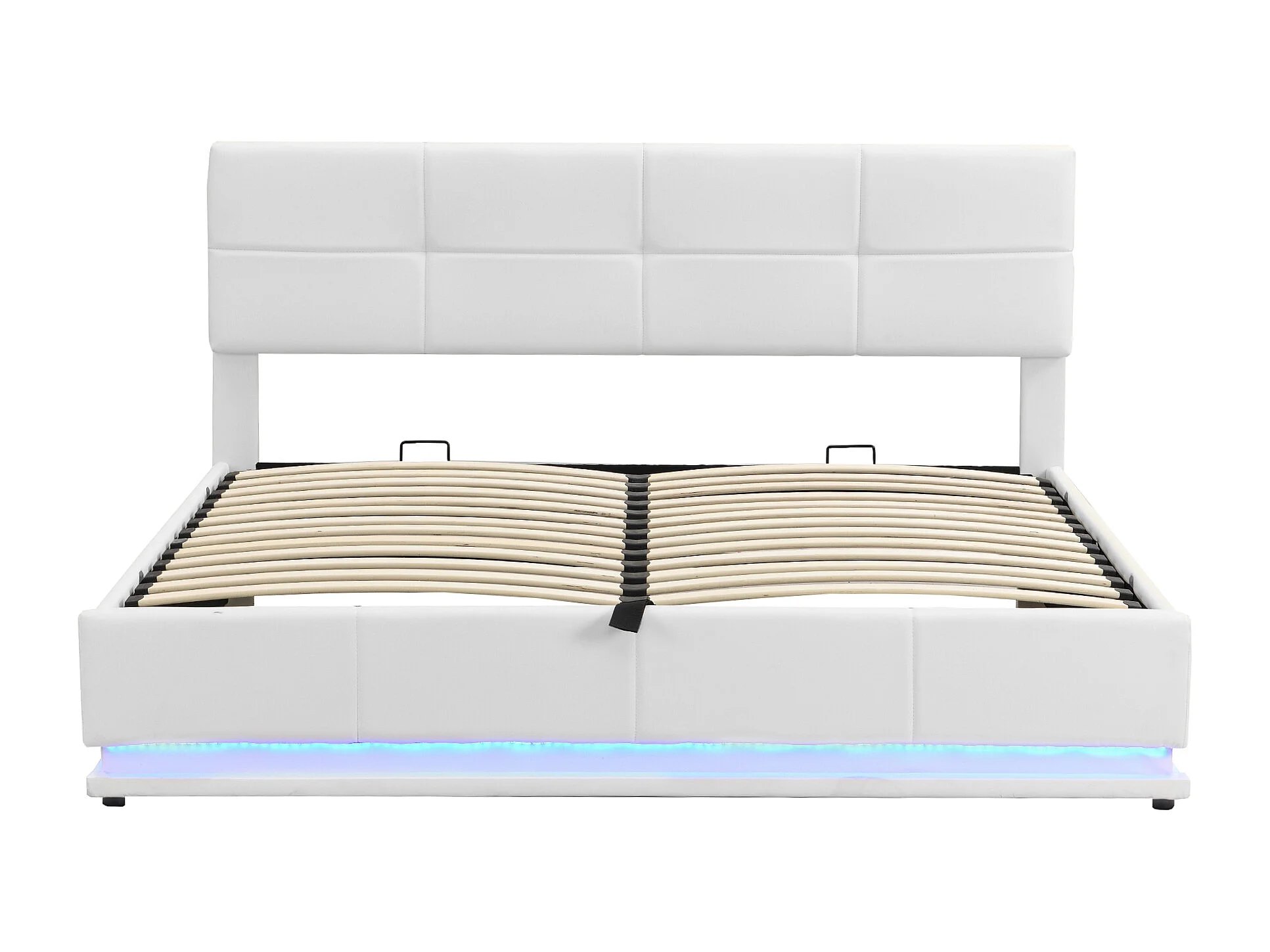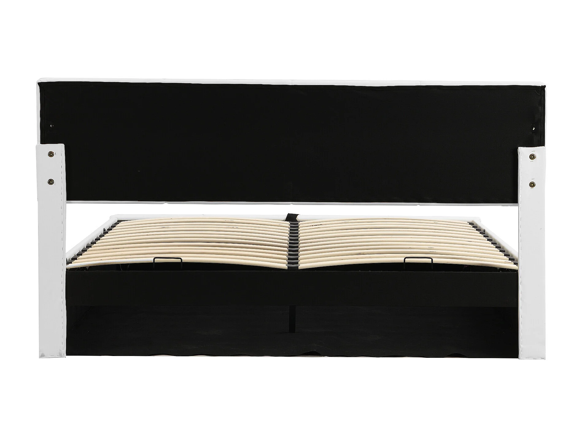 Cama com arrumação 180 x 200 cm - com iluminação LED, elevação hidráulica, base de ripas - PU branco - colchão não incluído
