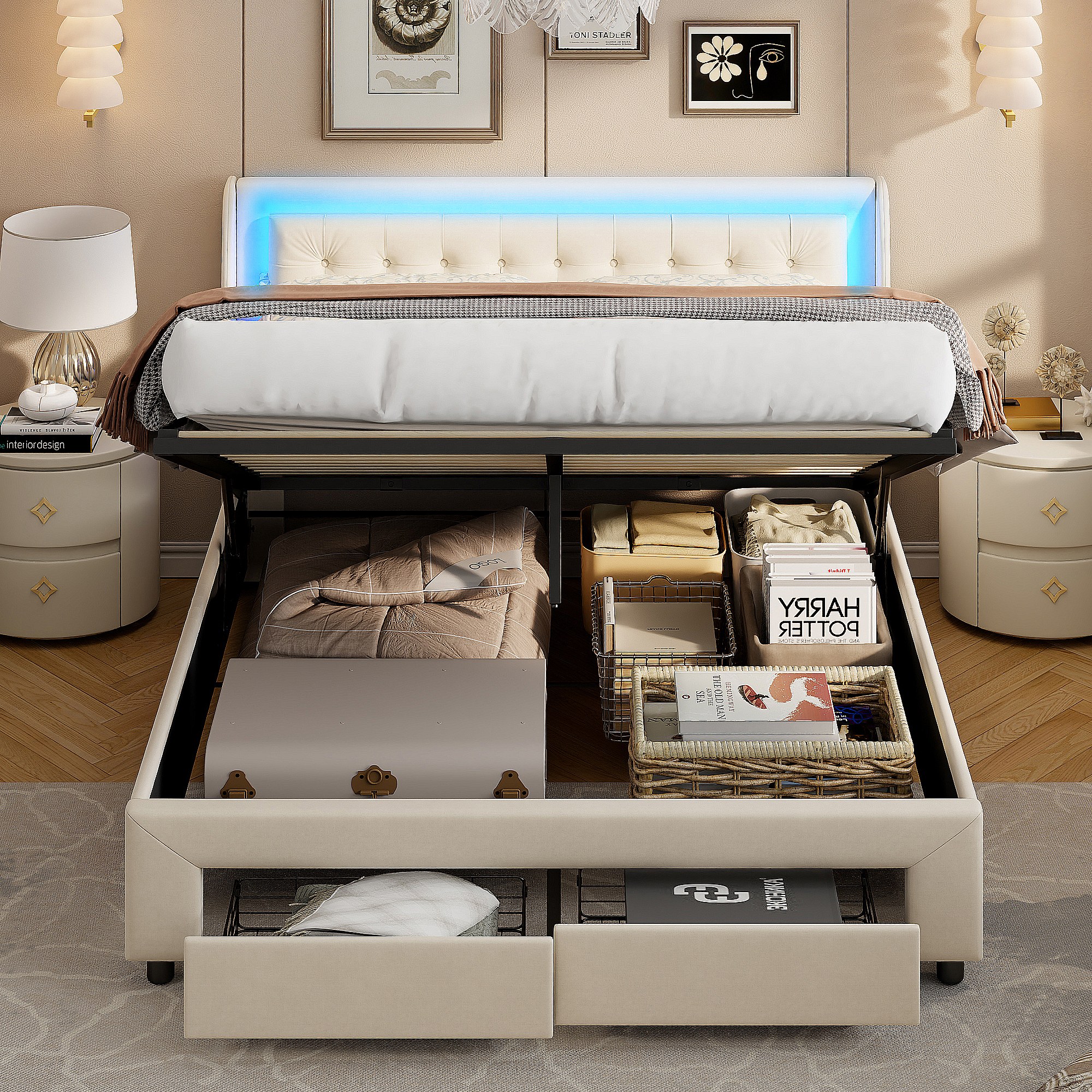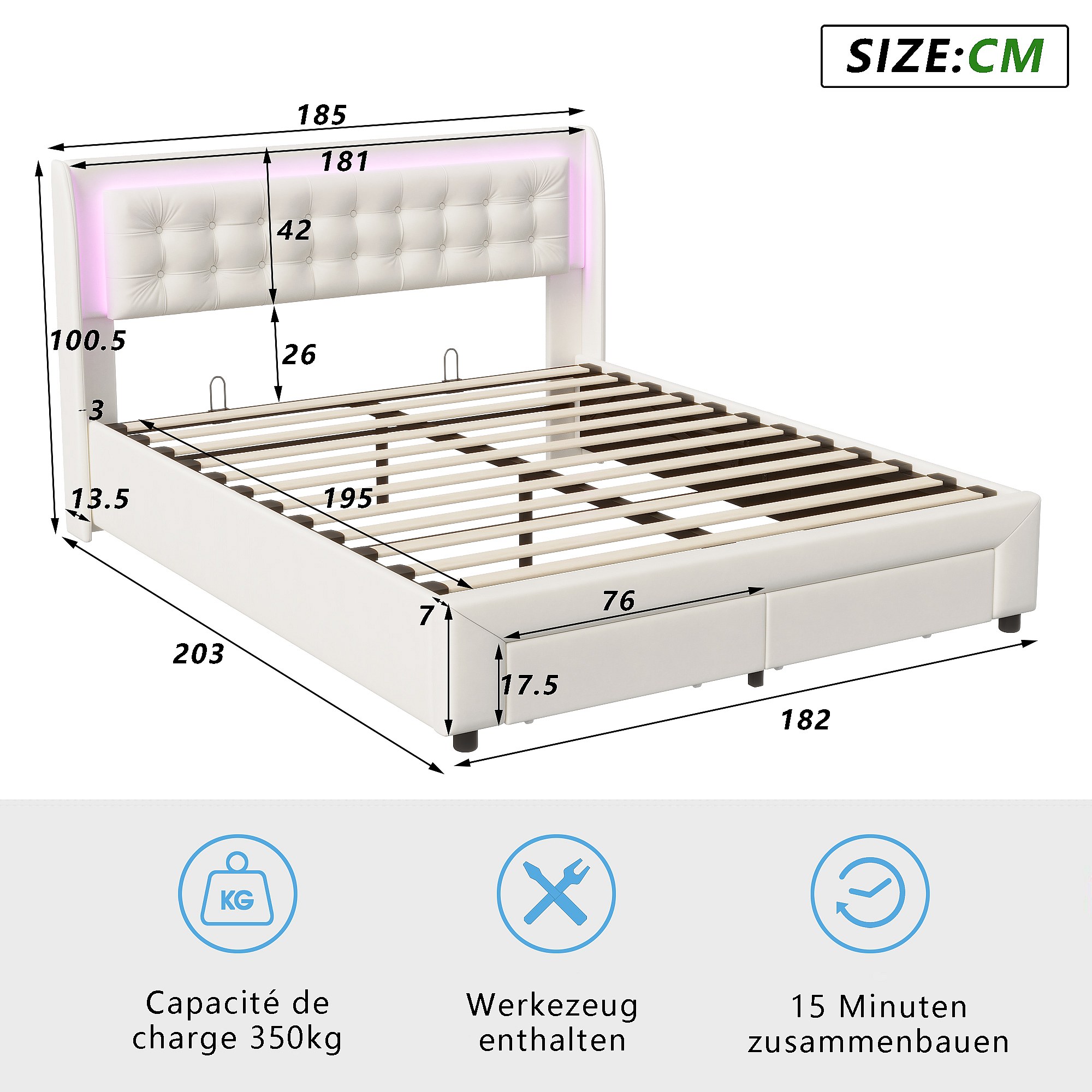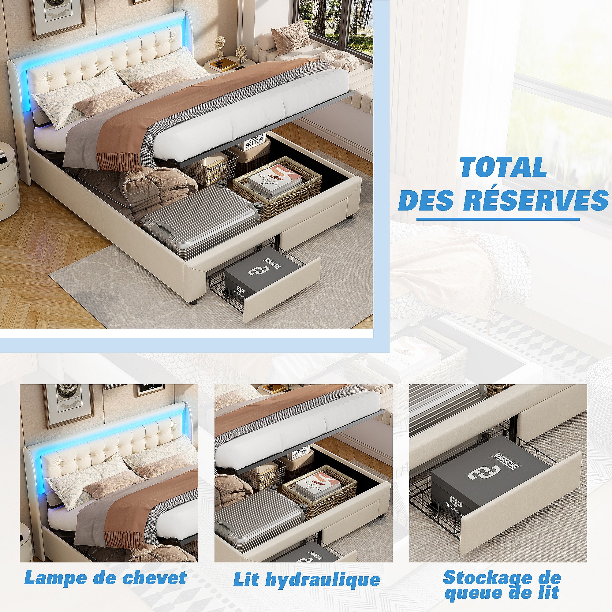 Cama com arrumação 180x200 cm em veludo bege com macacos hidráulicos, cabeceira LED multicolorida e gaveta de arrumação integrada