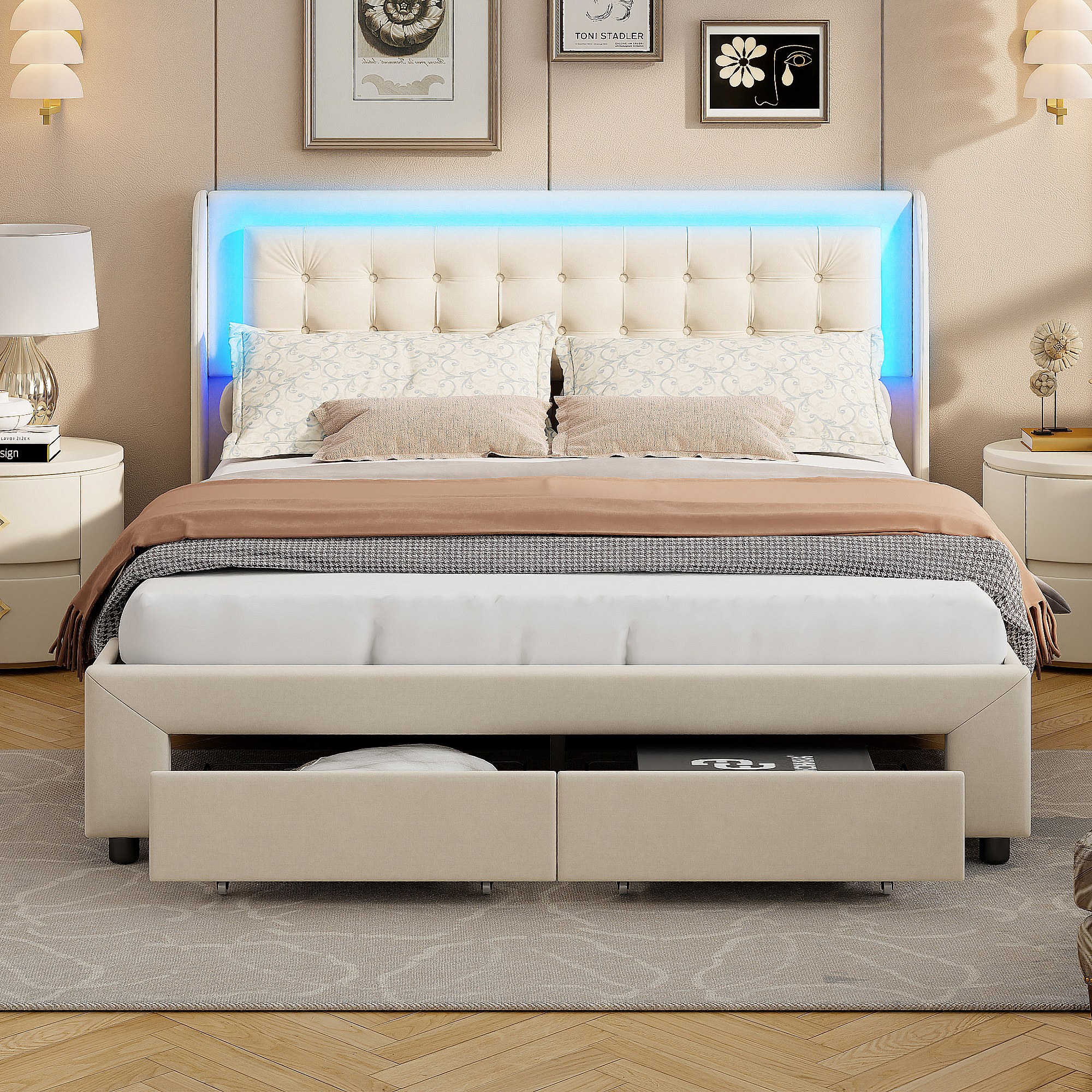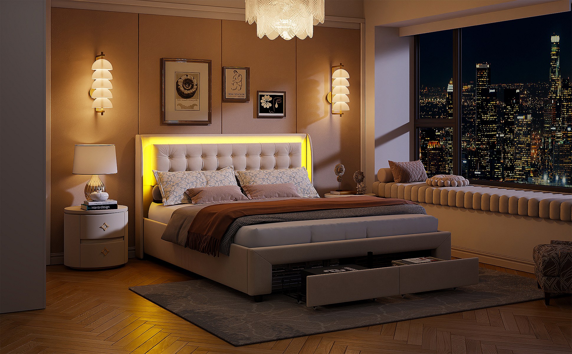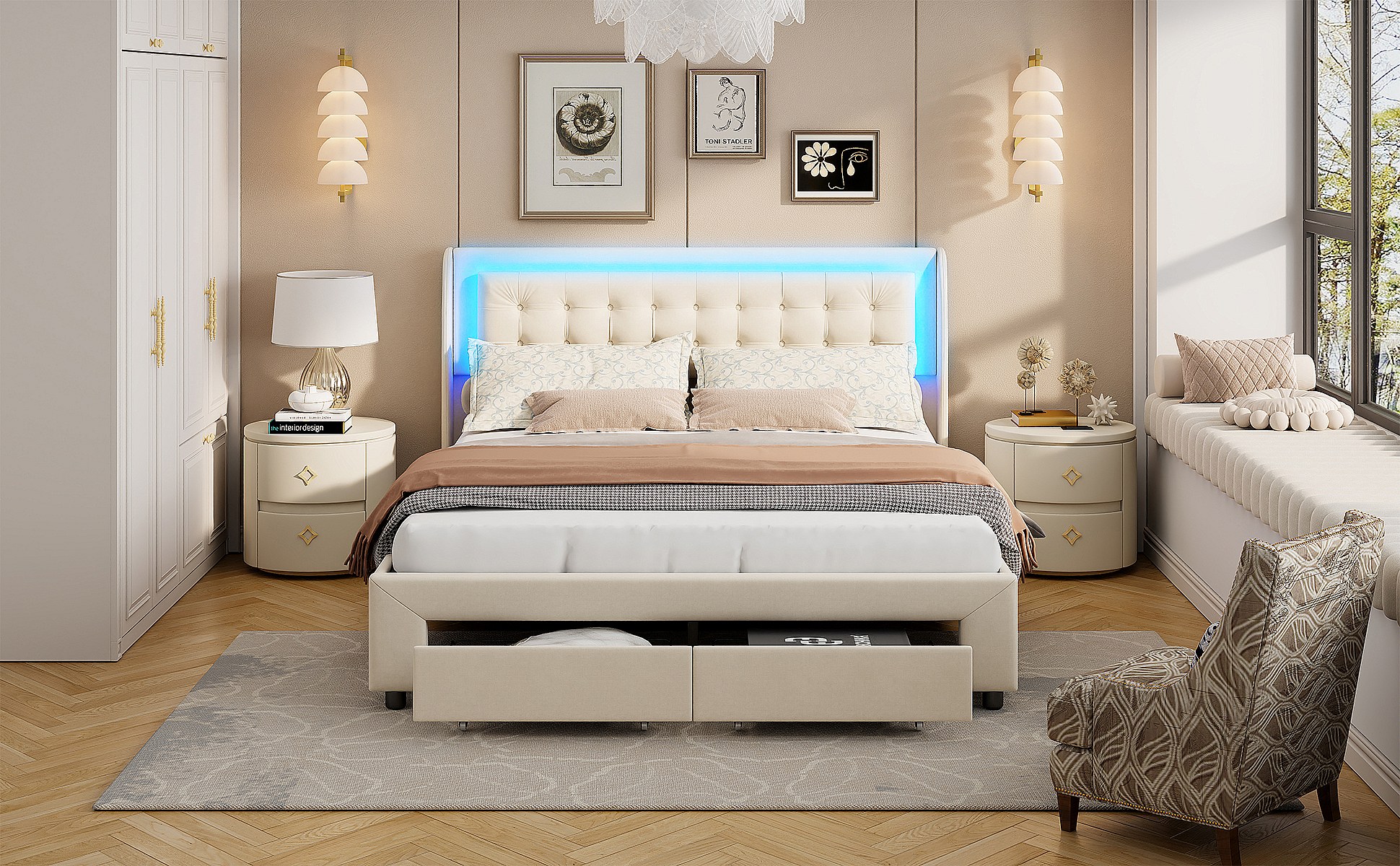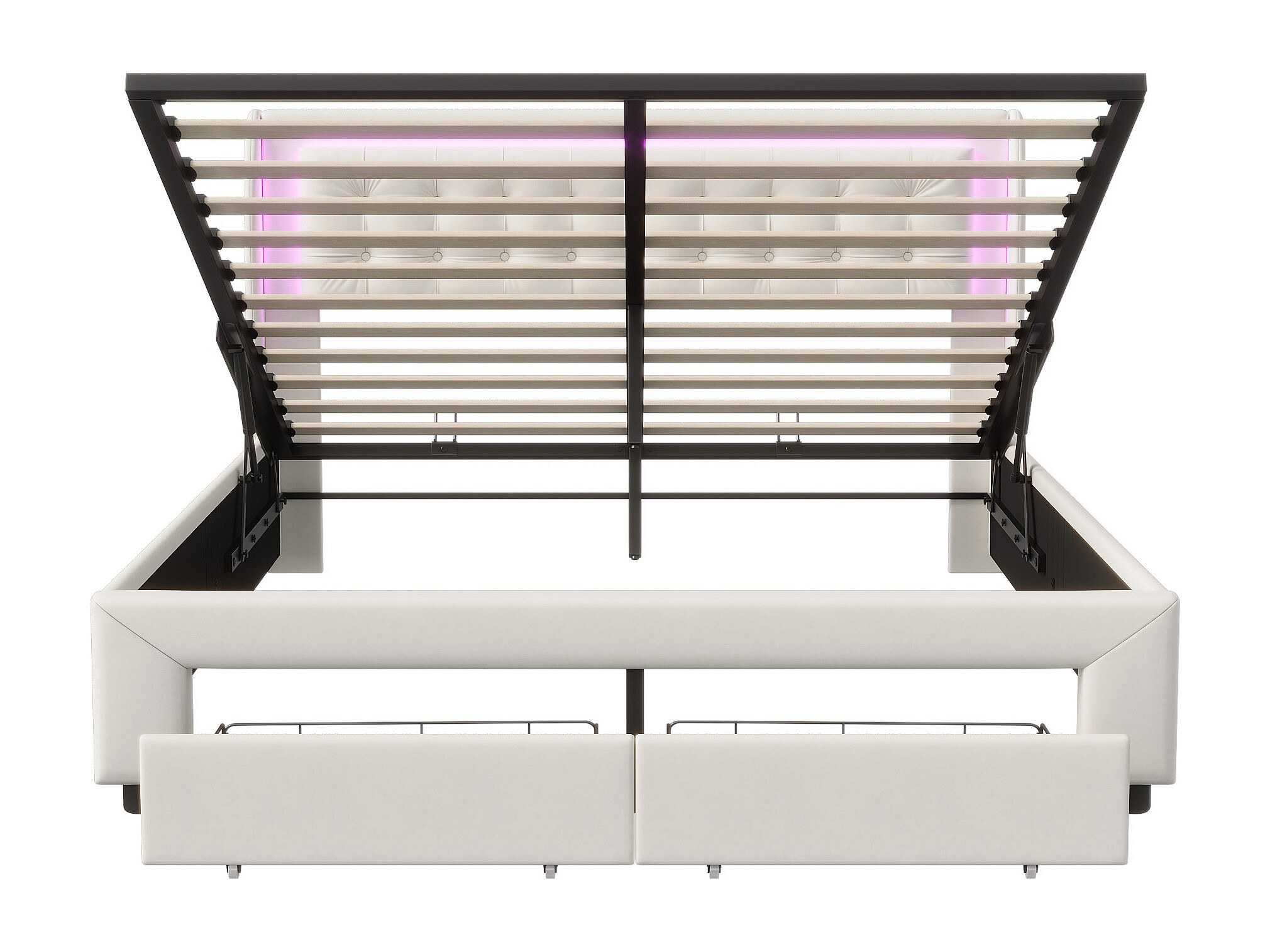 Cama com arrumação 180x200 cm em veludo bege com macacos hidráulicos, cabeceira LED multicolorida e gaveta de arrumação integrada