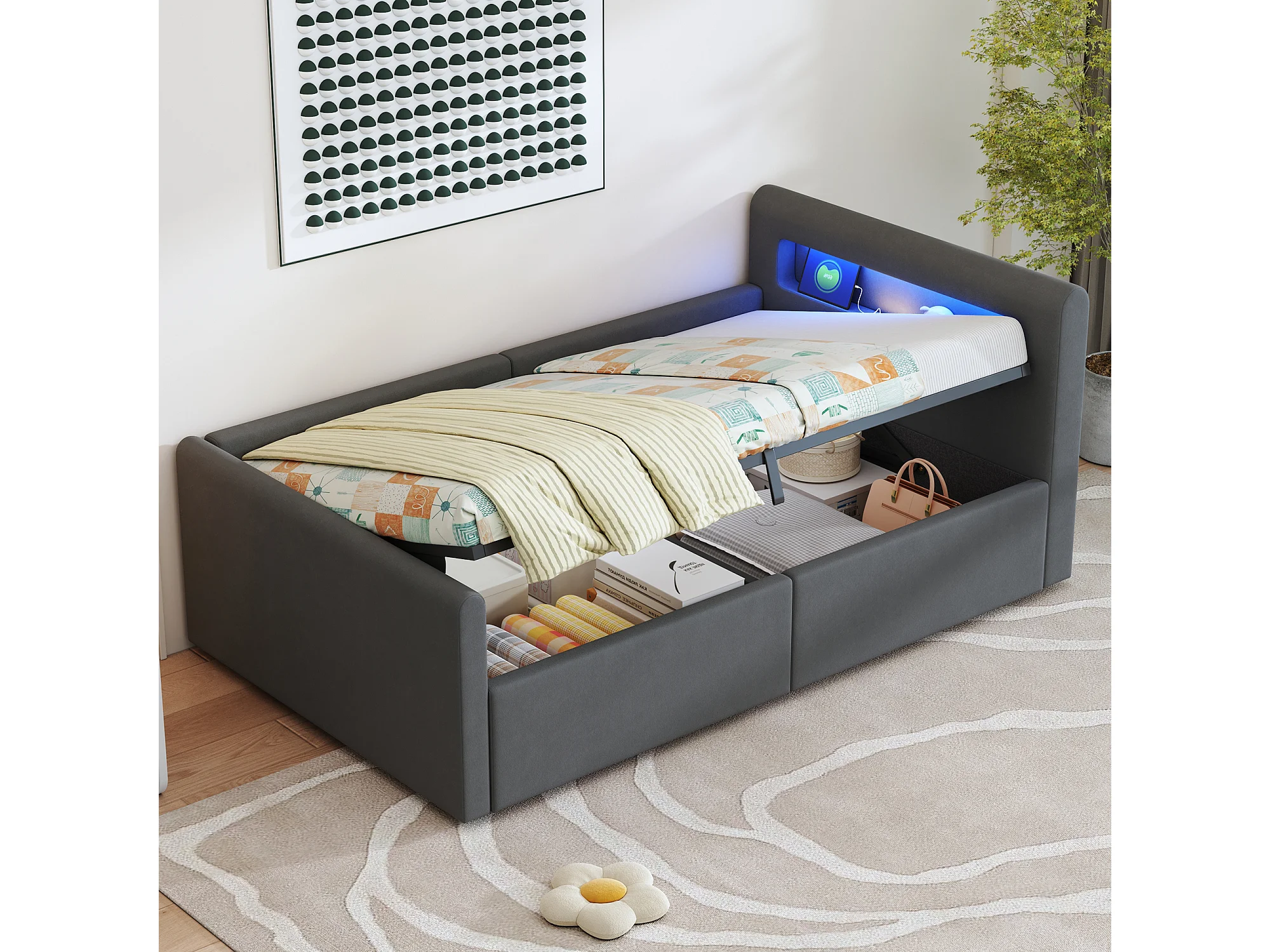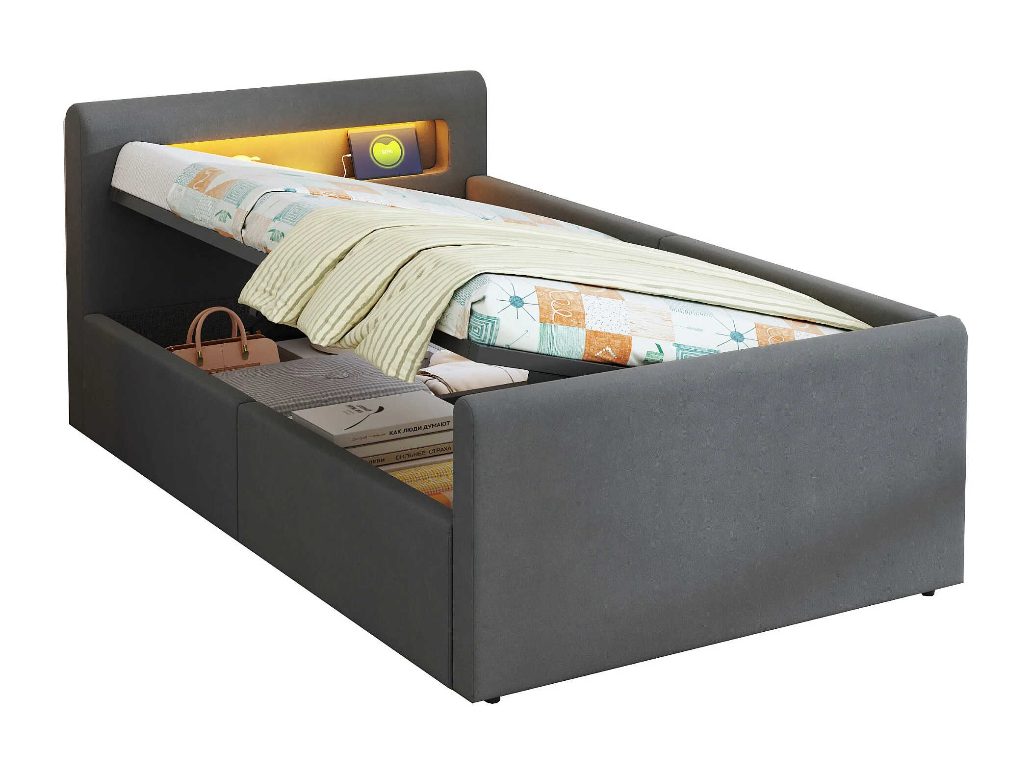 Cama com arrumação 90 x 200 cm - Cama de criança com iluminação LED e entrada USB - cabeceira com arrumação - veludo cinza escuro - colchão não incluído