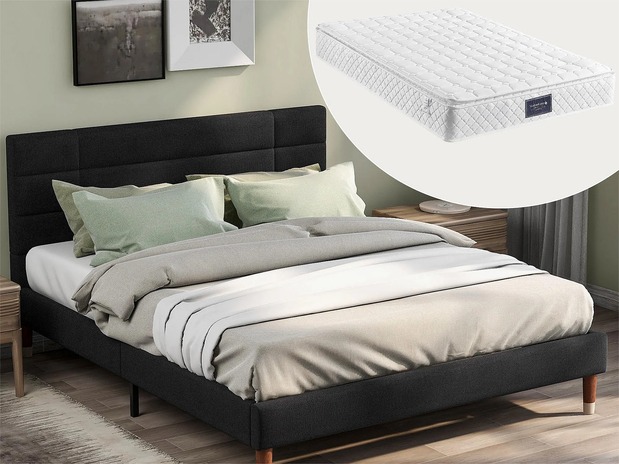 Cama com cabeceira - 140 x 200 cm - tecido linho - preto + colchão