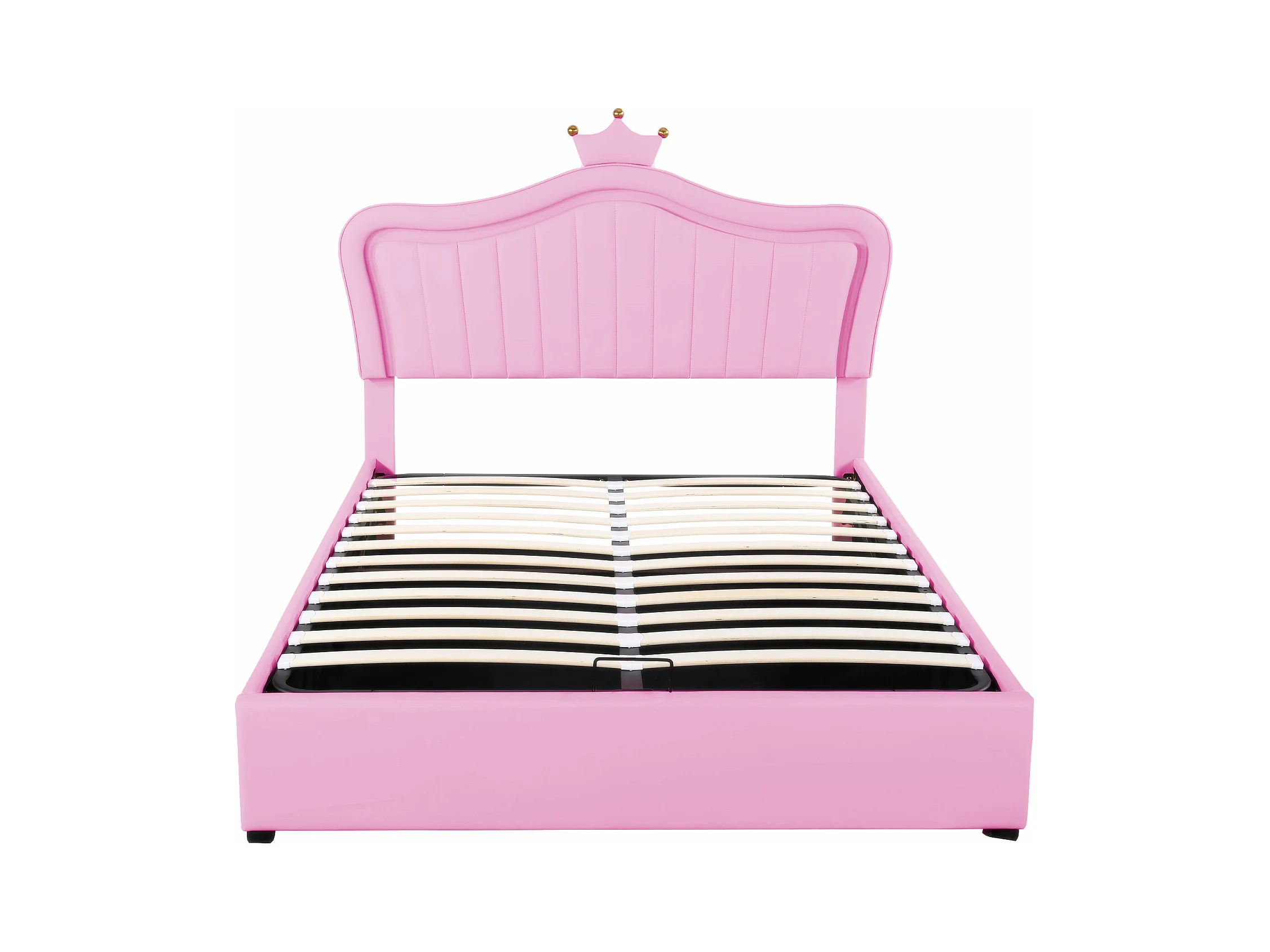 Cama de arrumação 140x200cm, cama infantil LED com base de ripas e cabeceira de coroa, pele PU, rosa