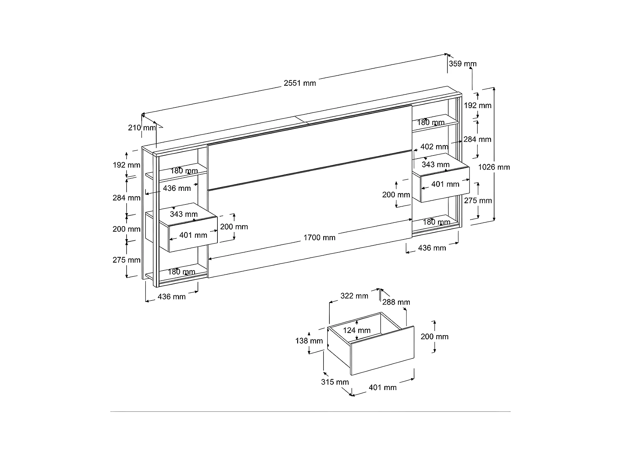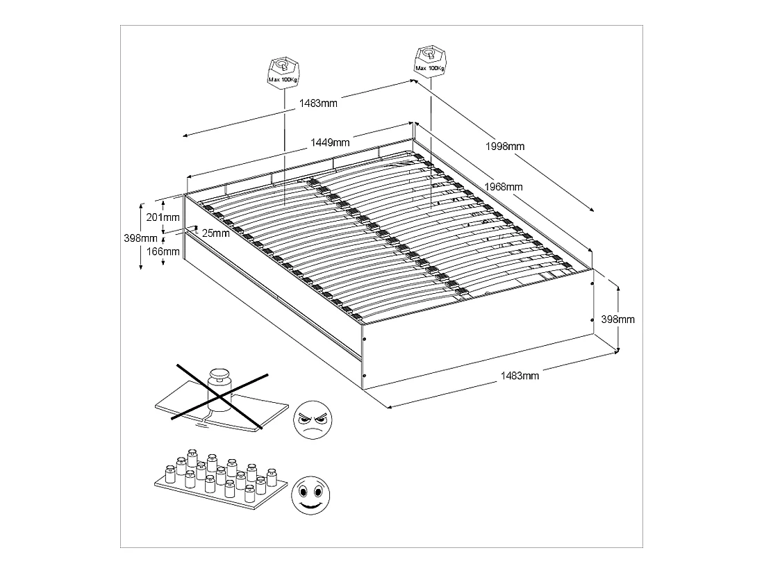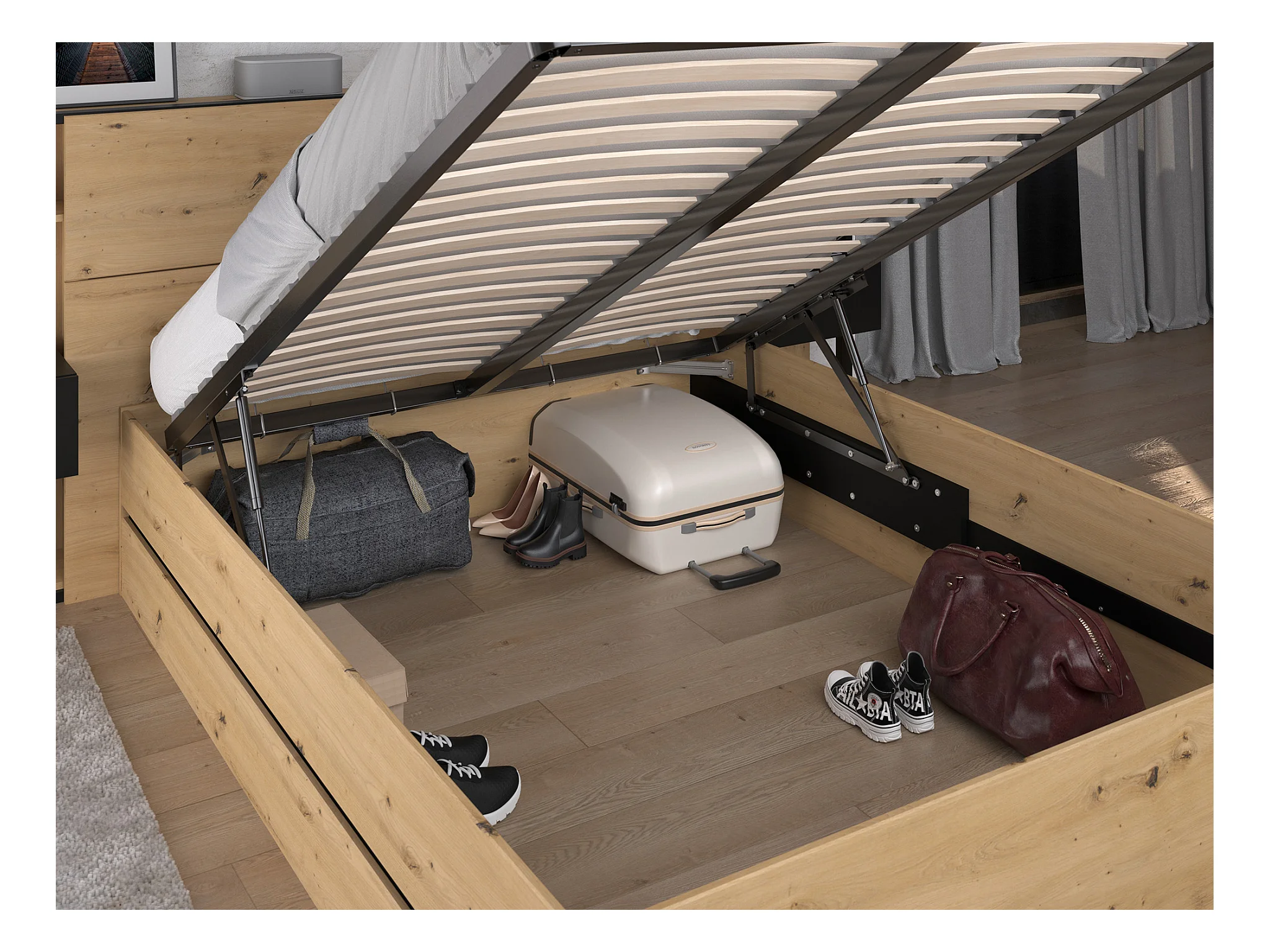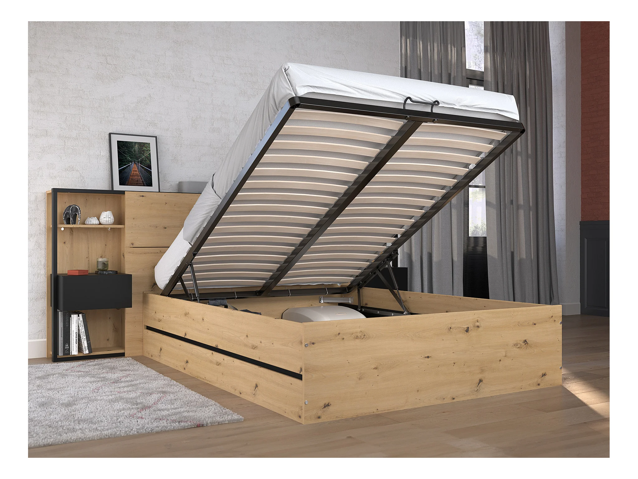 Cama com espaço de arrumação 140 x 190 cm com mesas de cabeceira cor natural e preto + colchão - LUDARO