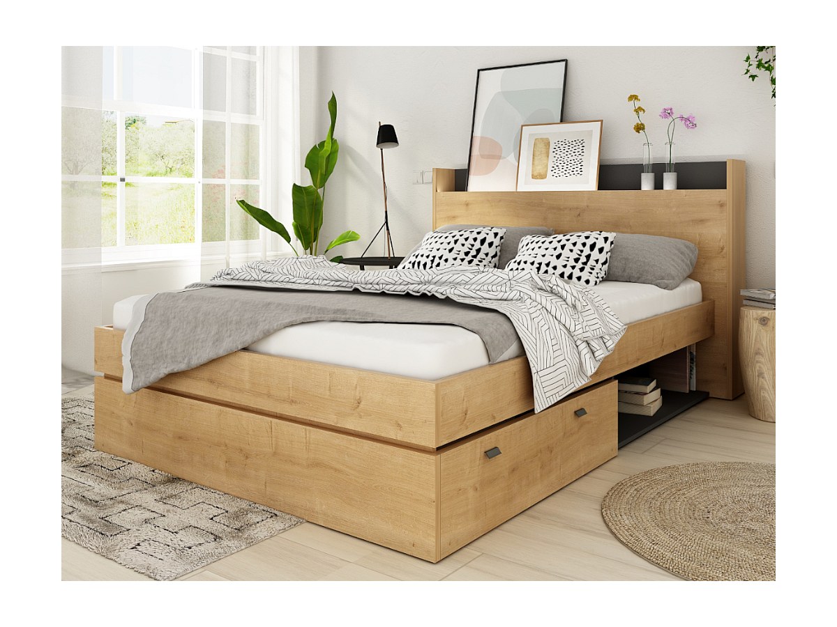 Cama com espaços de arrumação 140 x 190 cm com LEDs em cor carvalho e preto - RAPHAEL