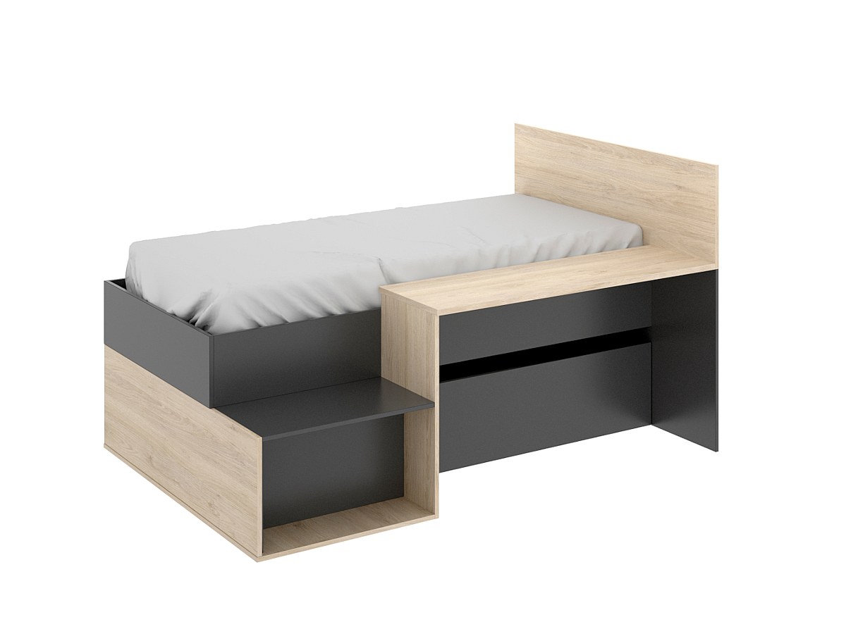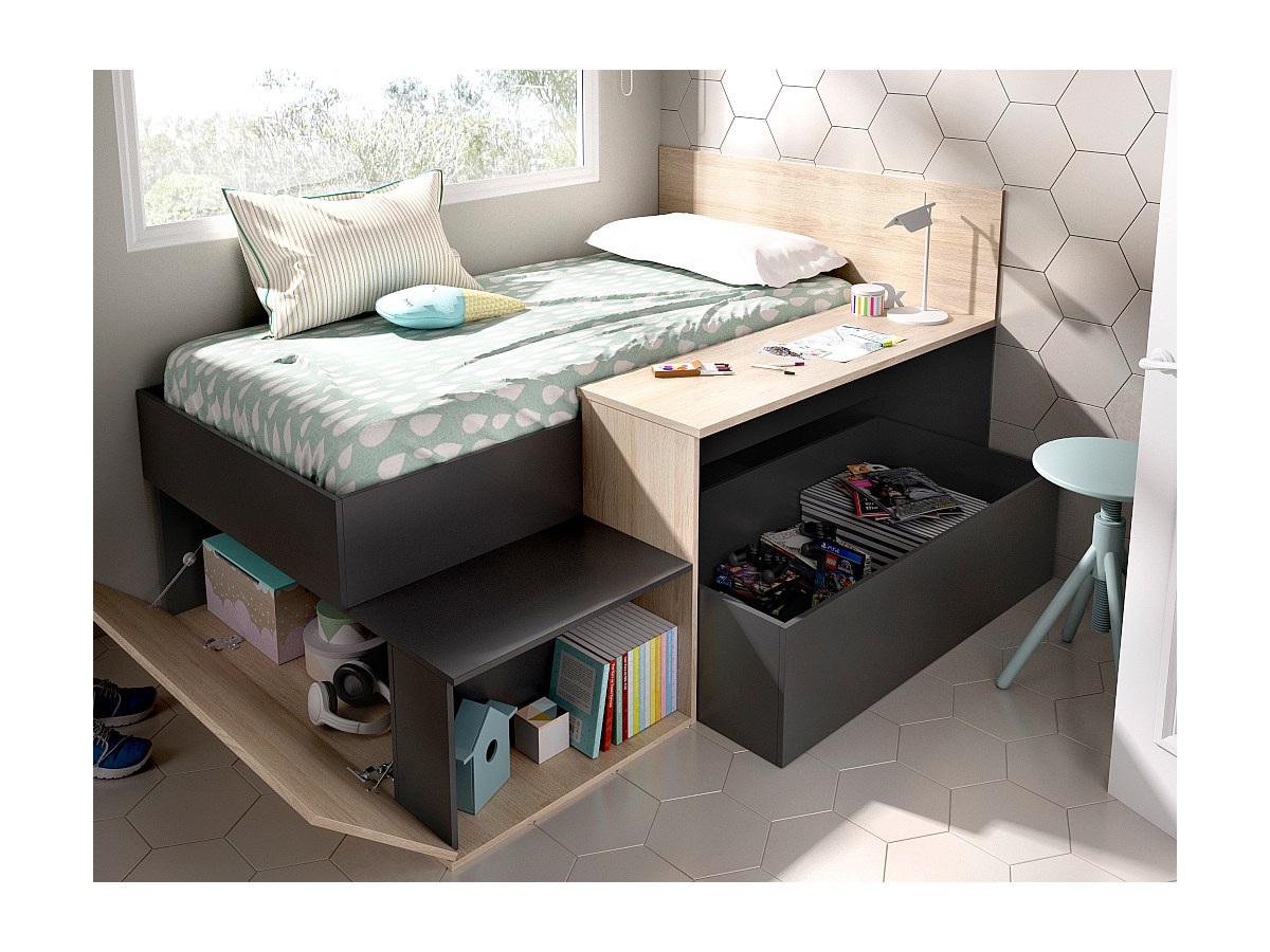 Cama com espaços de arrumação e secretária de 90 x 190 cm em antracite e carvalho - LISON