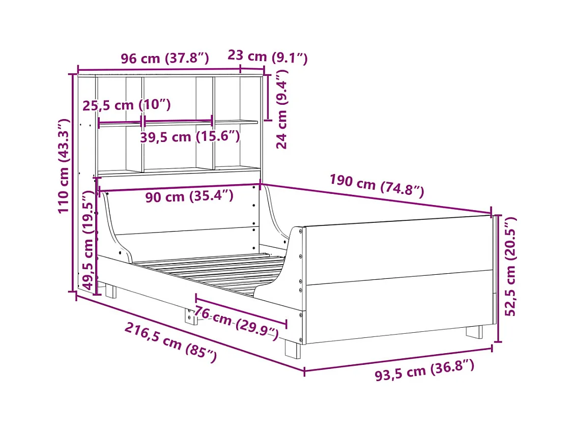 Cama com estante sem colchão 90x190 cm madeira maciça