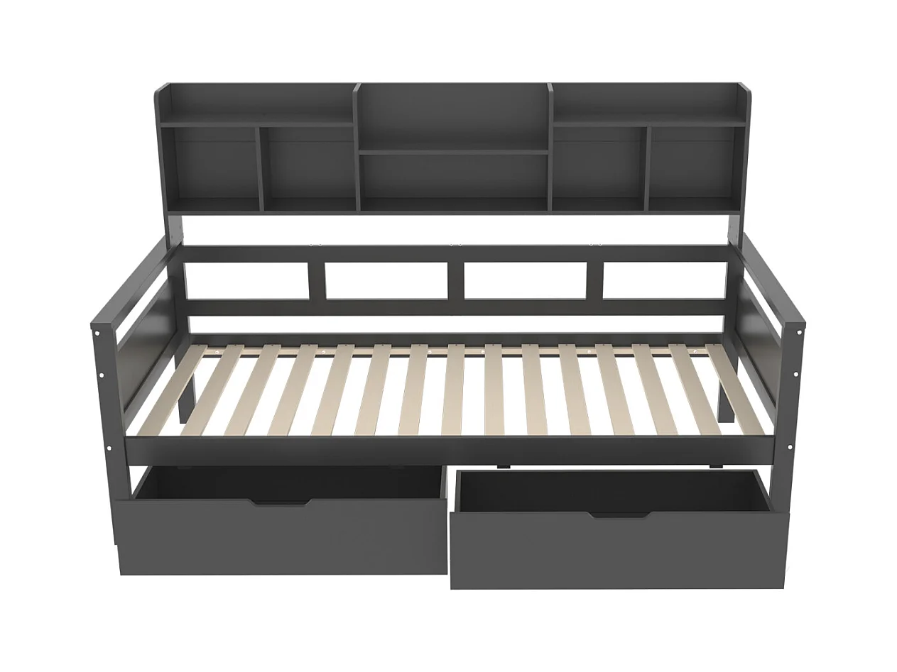 Cama de casal 90x200cm, cama de solteiro infantil com 2 gavetas e prateleiras de arrumação, estrado de ripas, cama de madeira maciça, cinzento