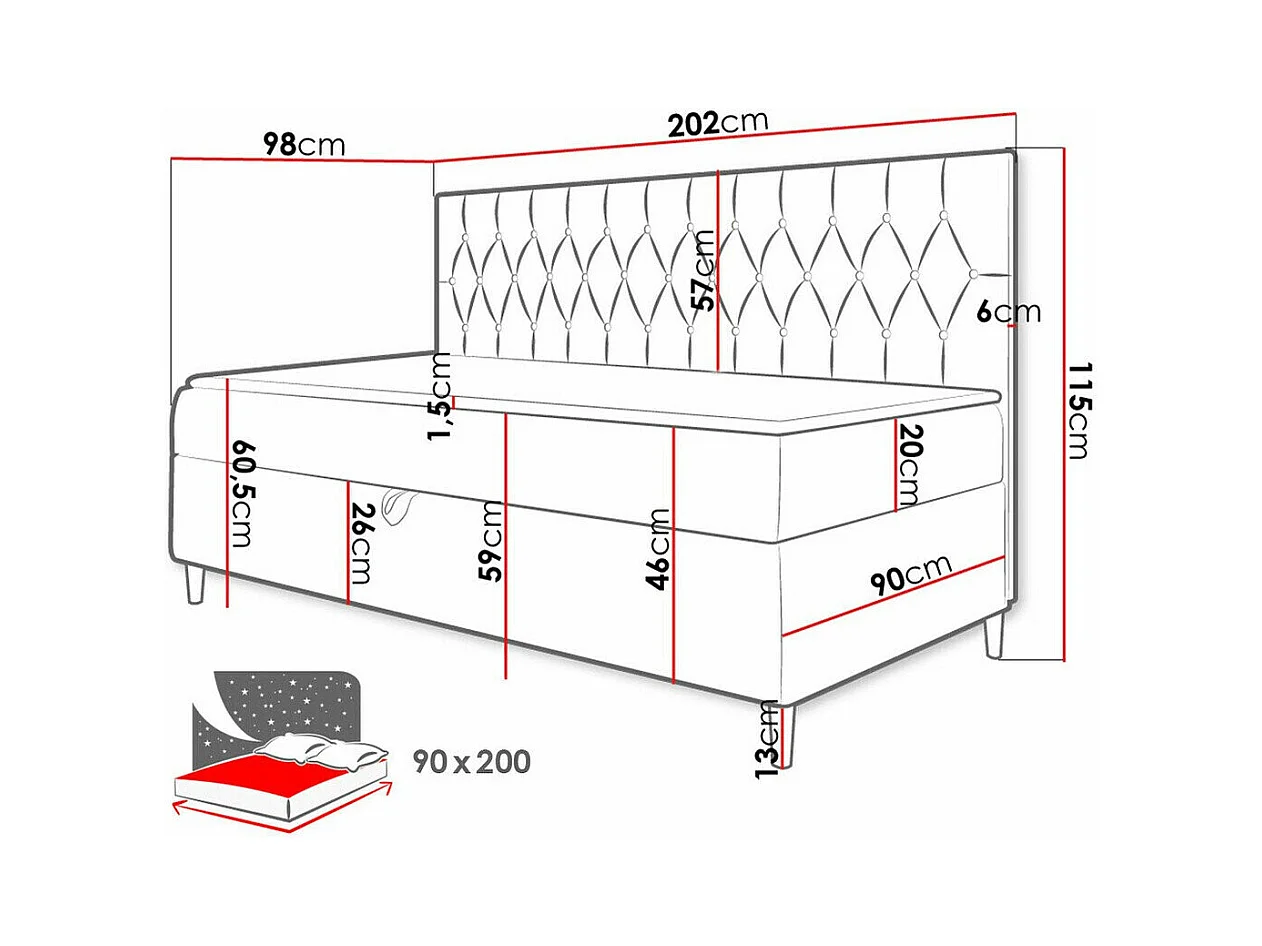 Cama continental Baltimore 165, Solteiro, Vermelho, Tecido, 10x21x12cm