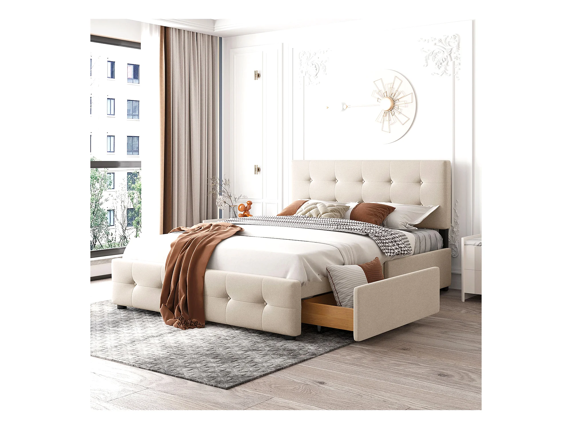 Cama de adulto 140x200 cm com 4 gavetas, cabeceira regulável em altura, tecido de veludo bege, sem colchão