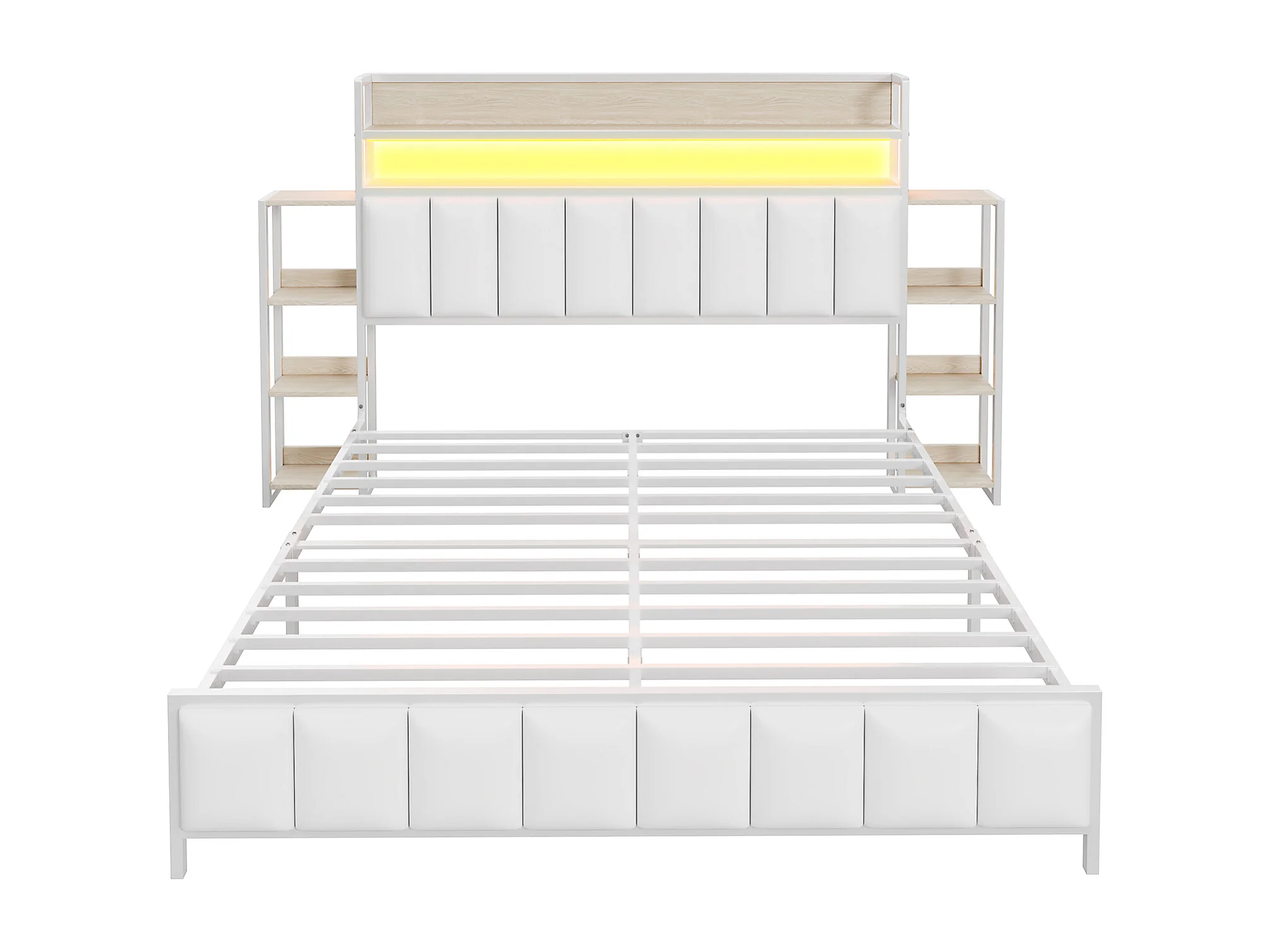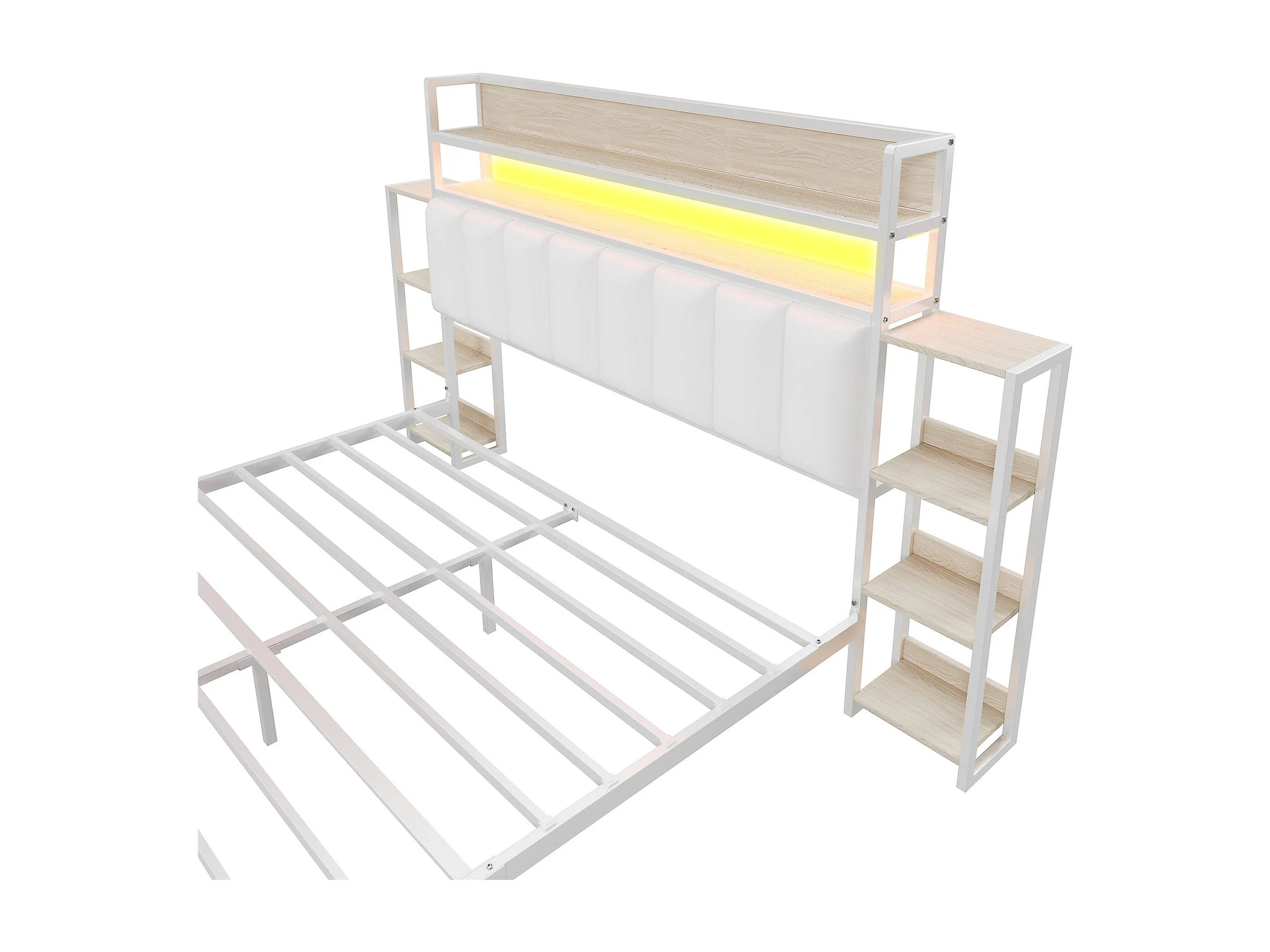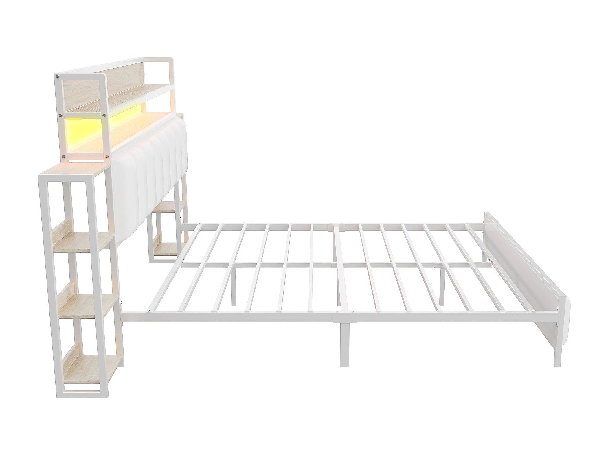 Cama de adulto 160x200 cm branca em PU, cabeceira com prateleiras e LED, estrado de ripas, sem colchão