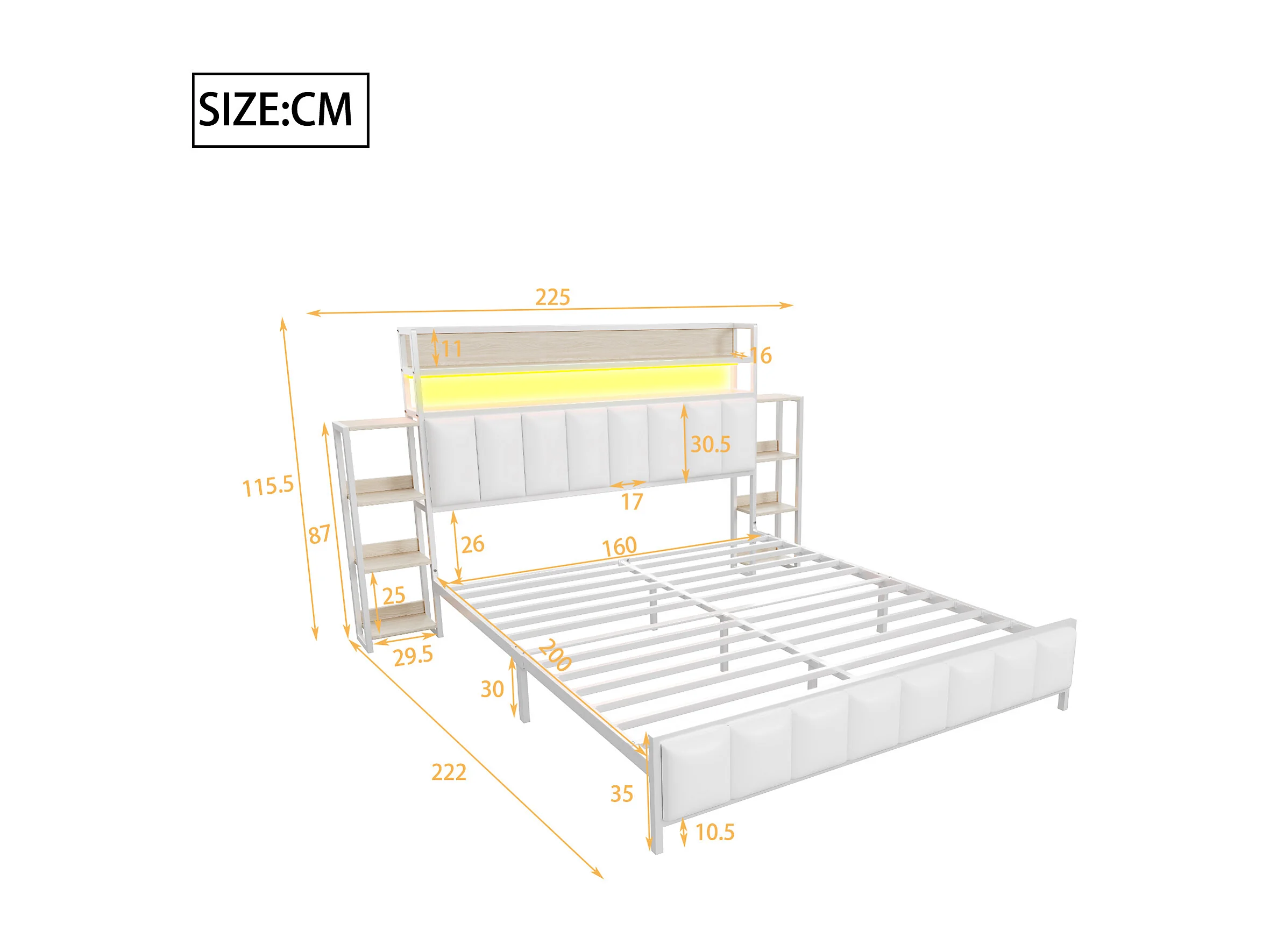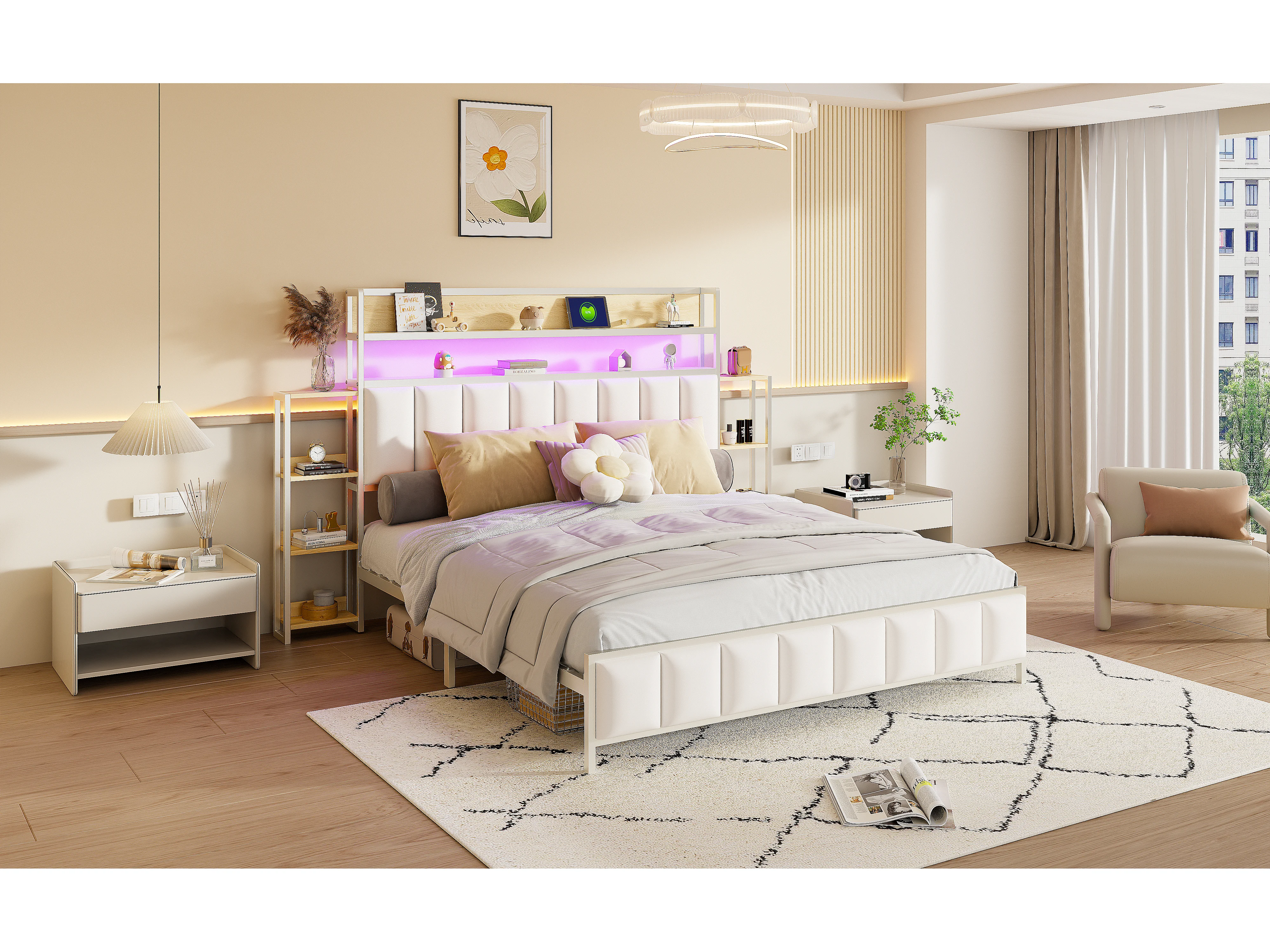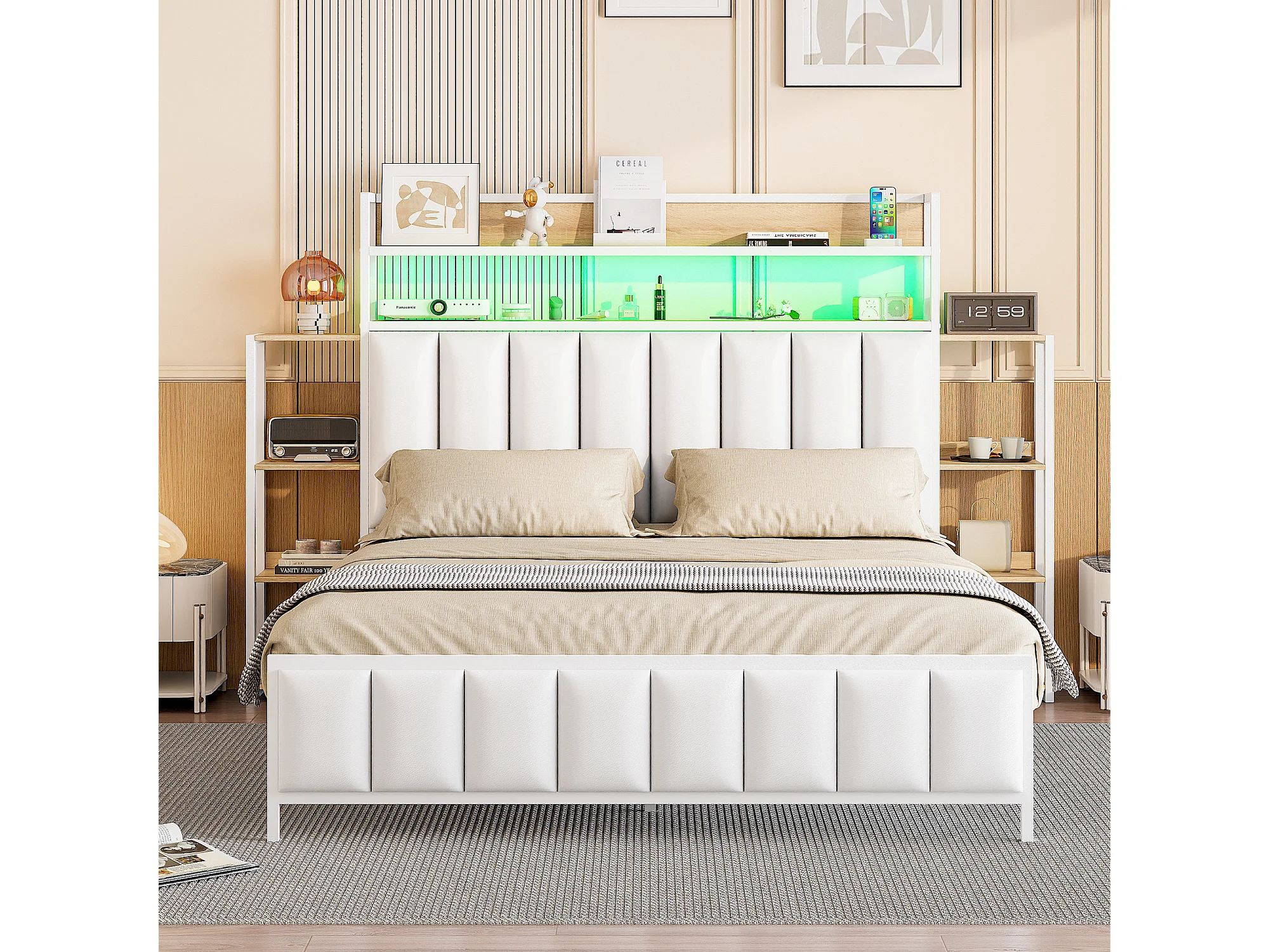 Cama de adulto 160x200 cm branca em PU, cabeceira com prateleiras e LED, estrado de ripas, sem colchão