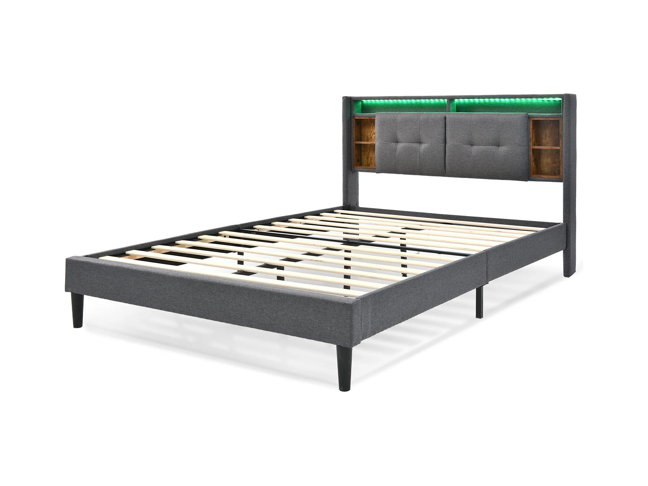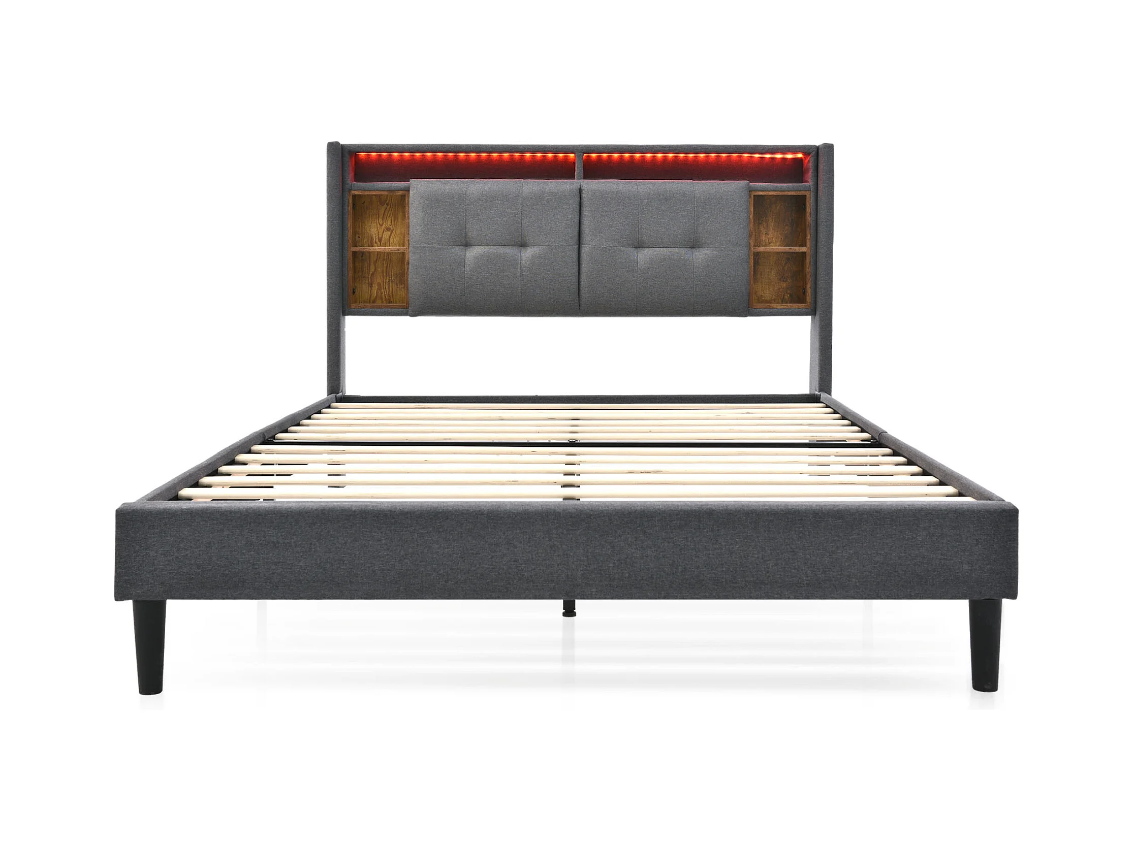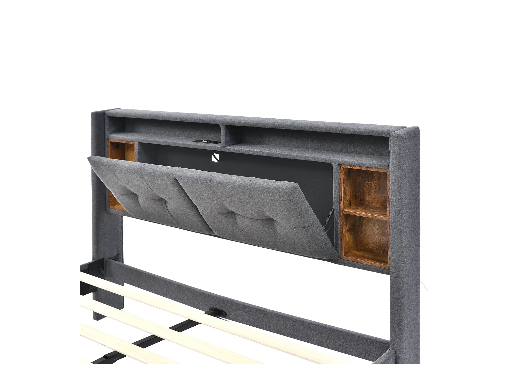 Cama de adulto 160x200 cm - Cama de casal com carregamento USB e iluminação LED - cabeceira com arrumação - cinzento - sem colchão Colchão